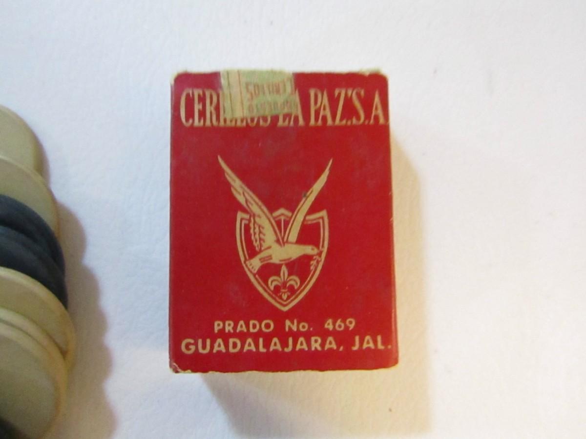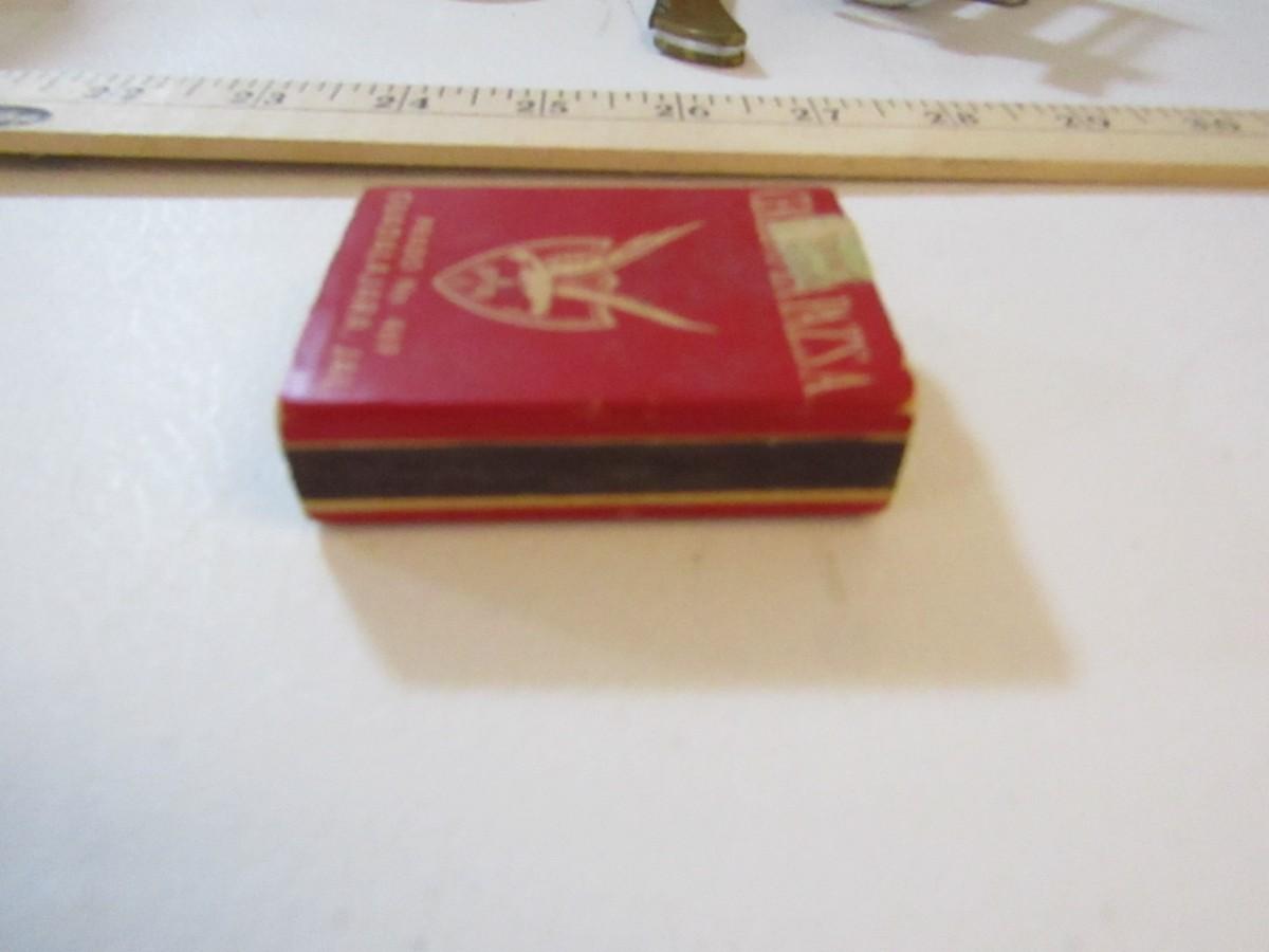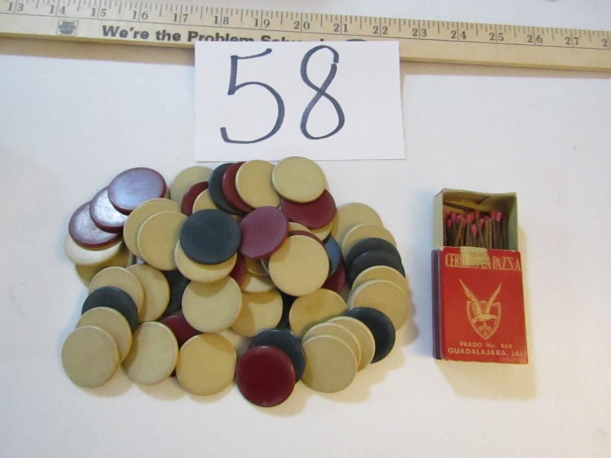 LOT 58 VINTAGE CLAY POKER CHIPS AND A BOX OF VERY OLD MATCHES