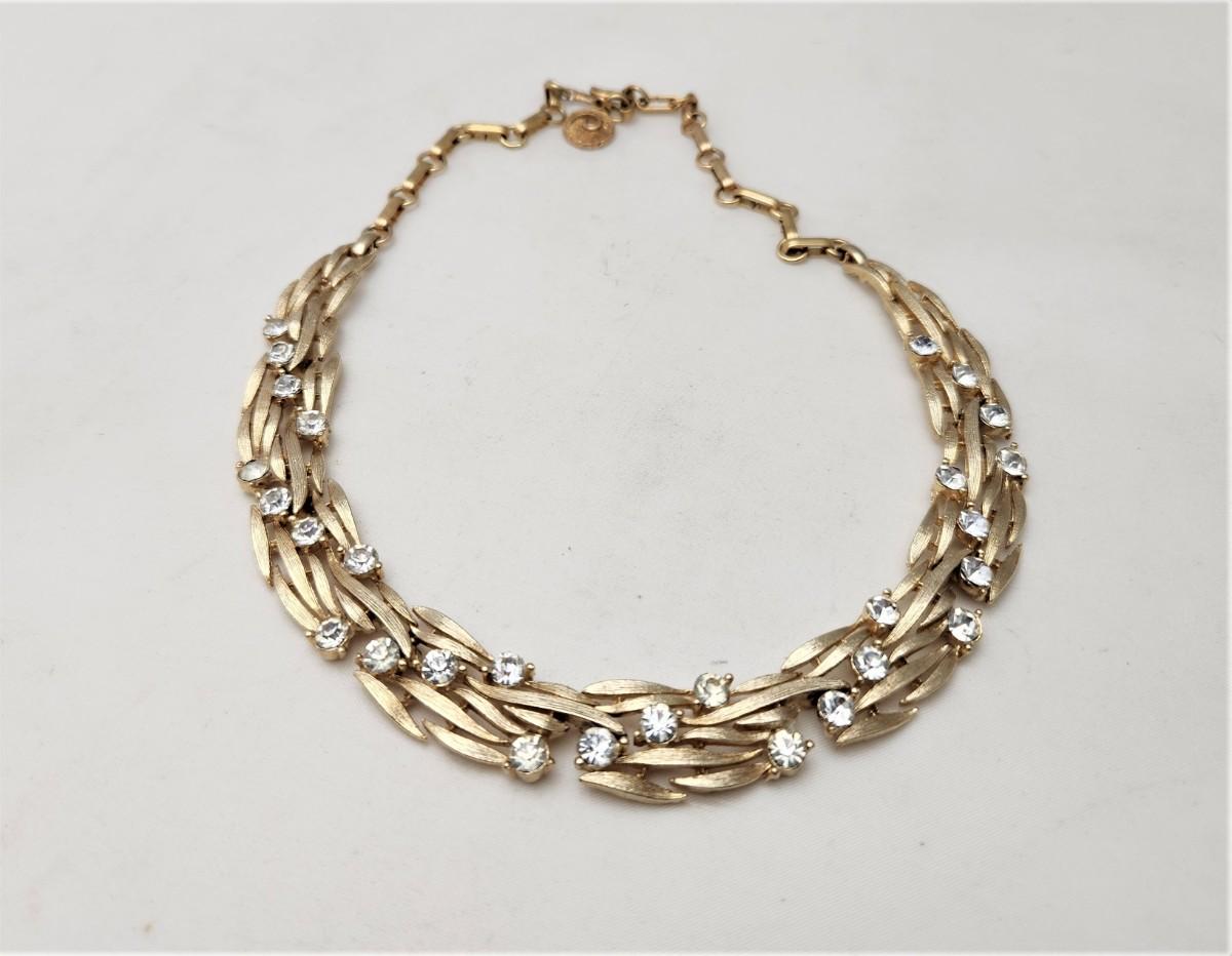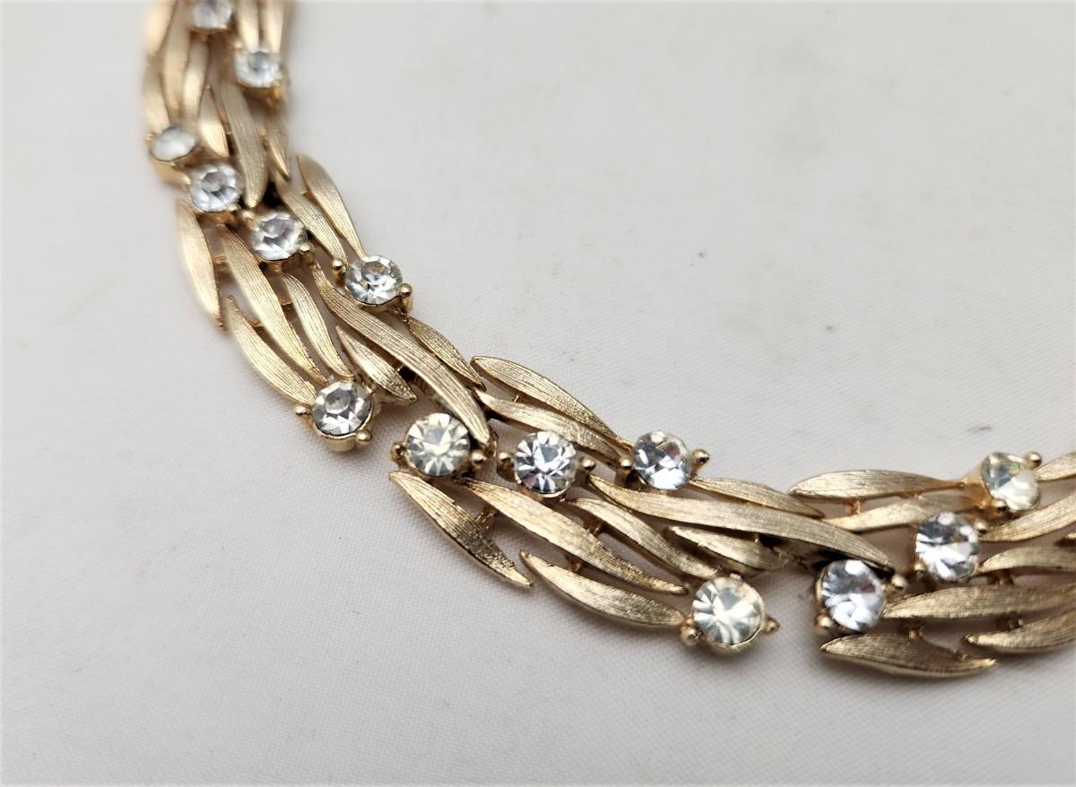A very pretty piece in excellent condition - gold tone brushed metal set with twinkly rhinestones - signed LISNER. With the hook closure you can adjust the length - measures about 14" long - meant to lay just able the collarbone at the base of the neck. Good condition. I would be willing to ship this item - you pay priority postage.