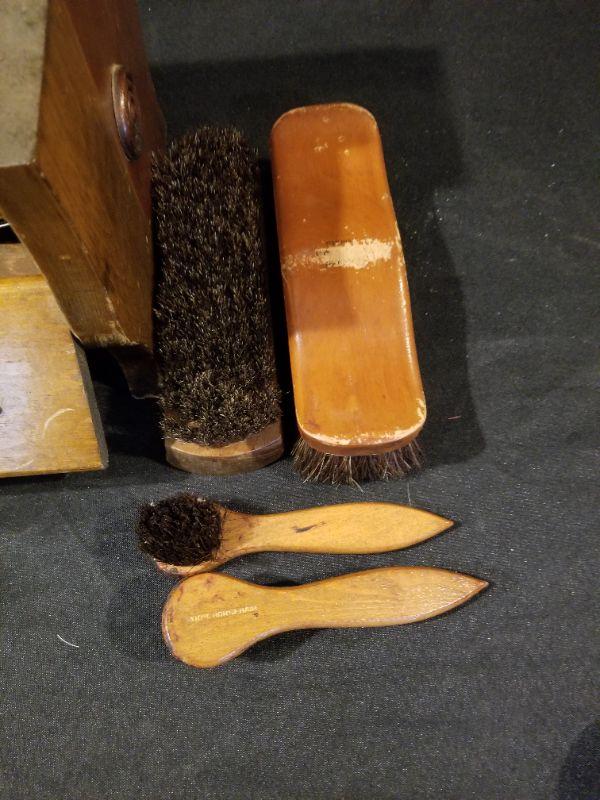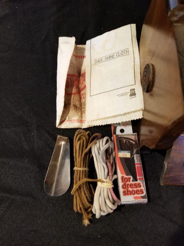 Vintage Handmade Wooden Shoe Shine Box and Contents - Polish, Brushes Laces and more!