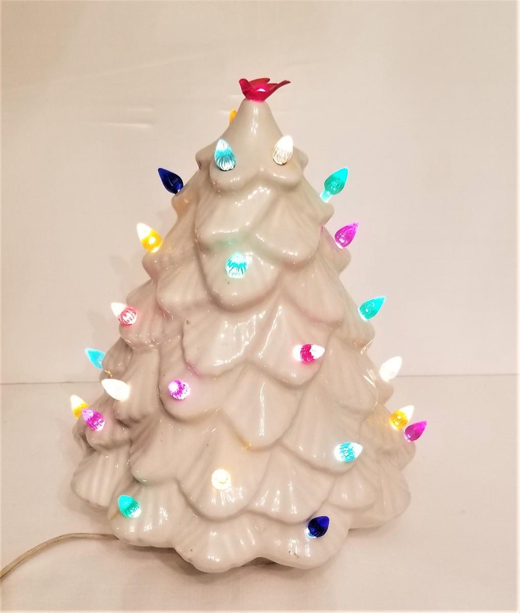 This is a scarce smaller sized WHITE ceramic Xmas tree - all bulbs are there - works. Good condition. Stands 11" tall.