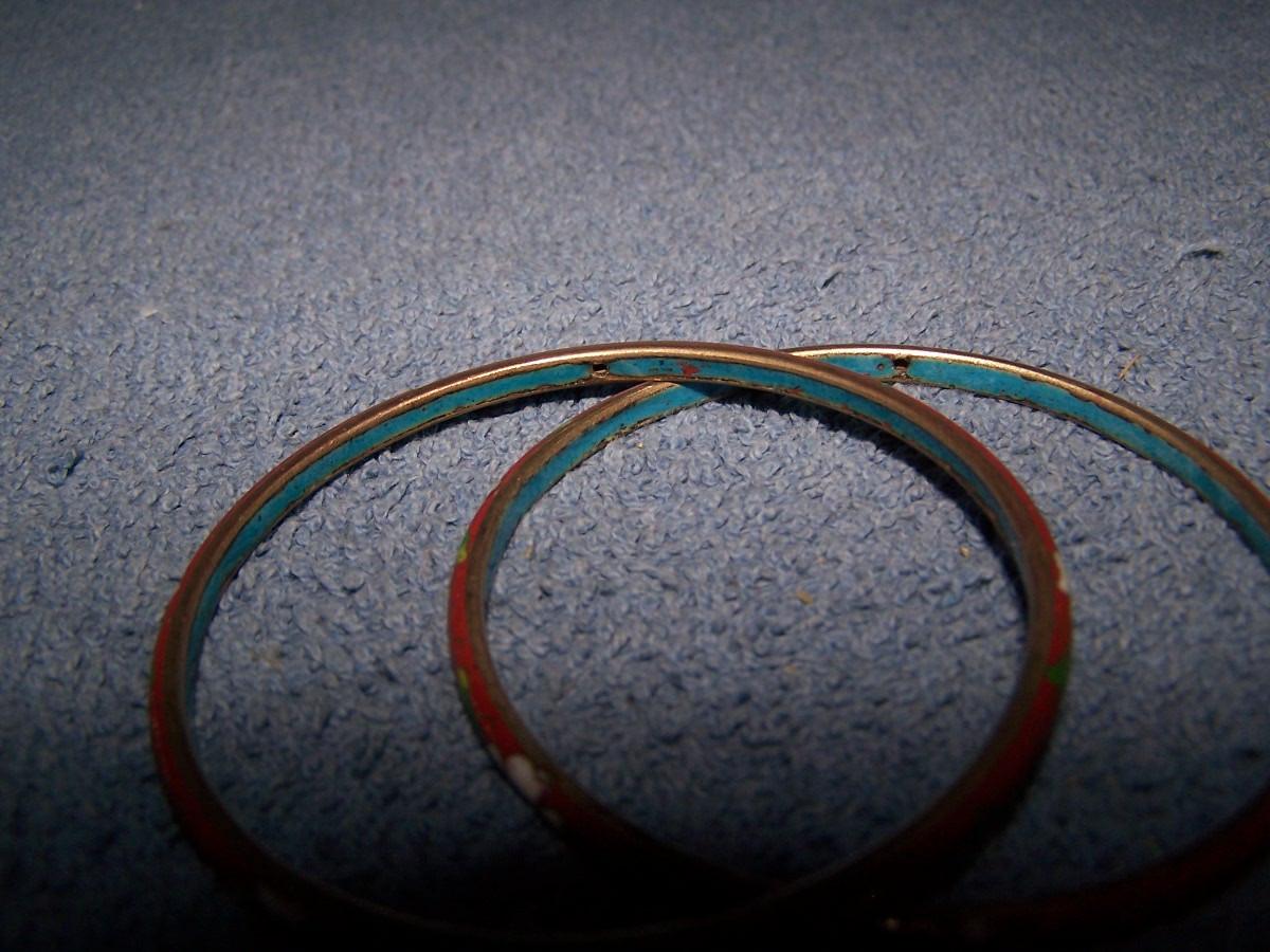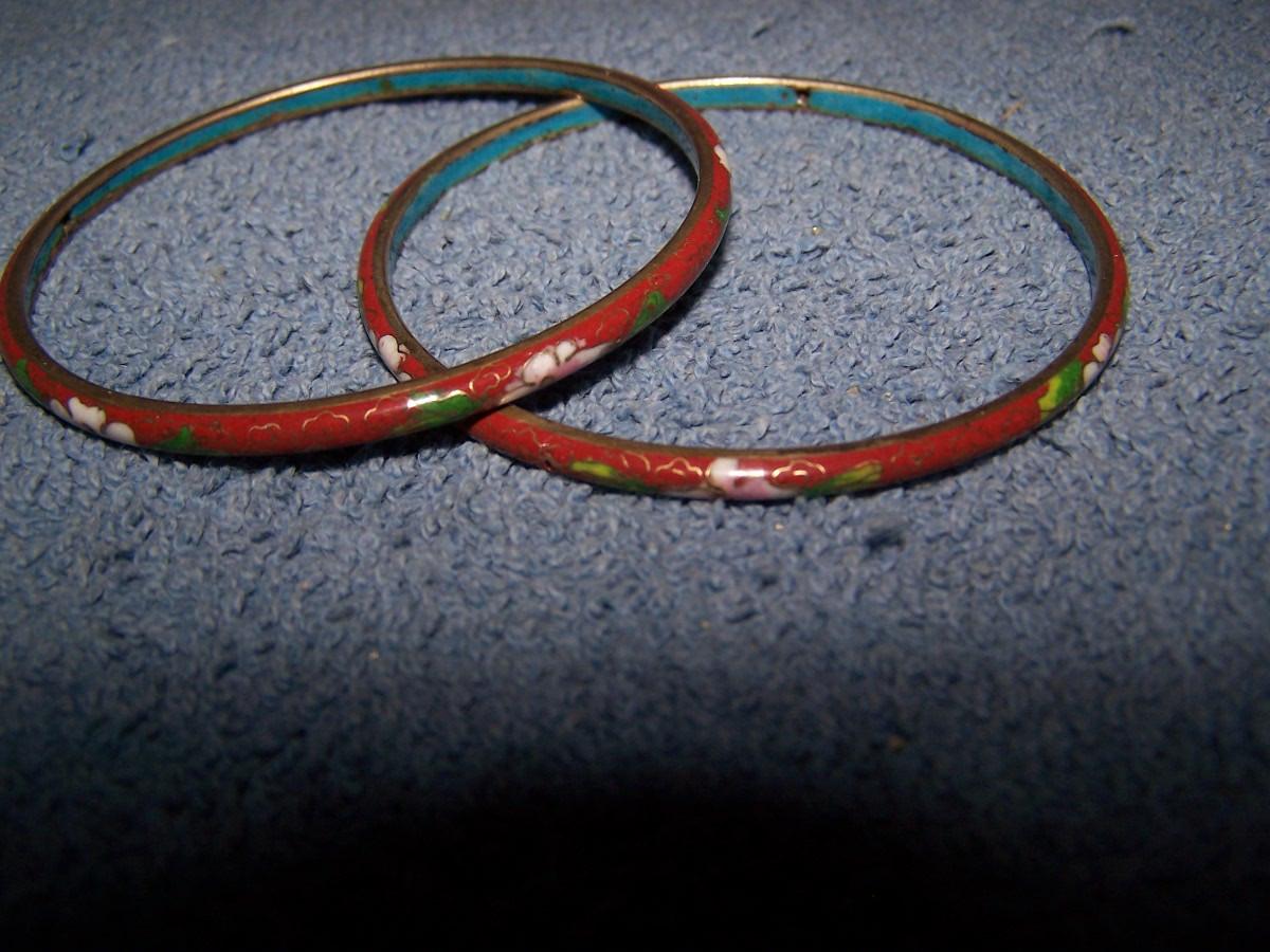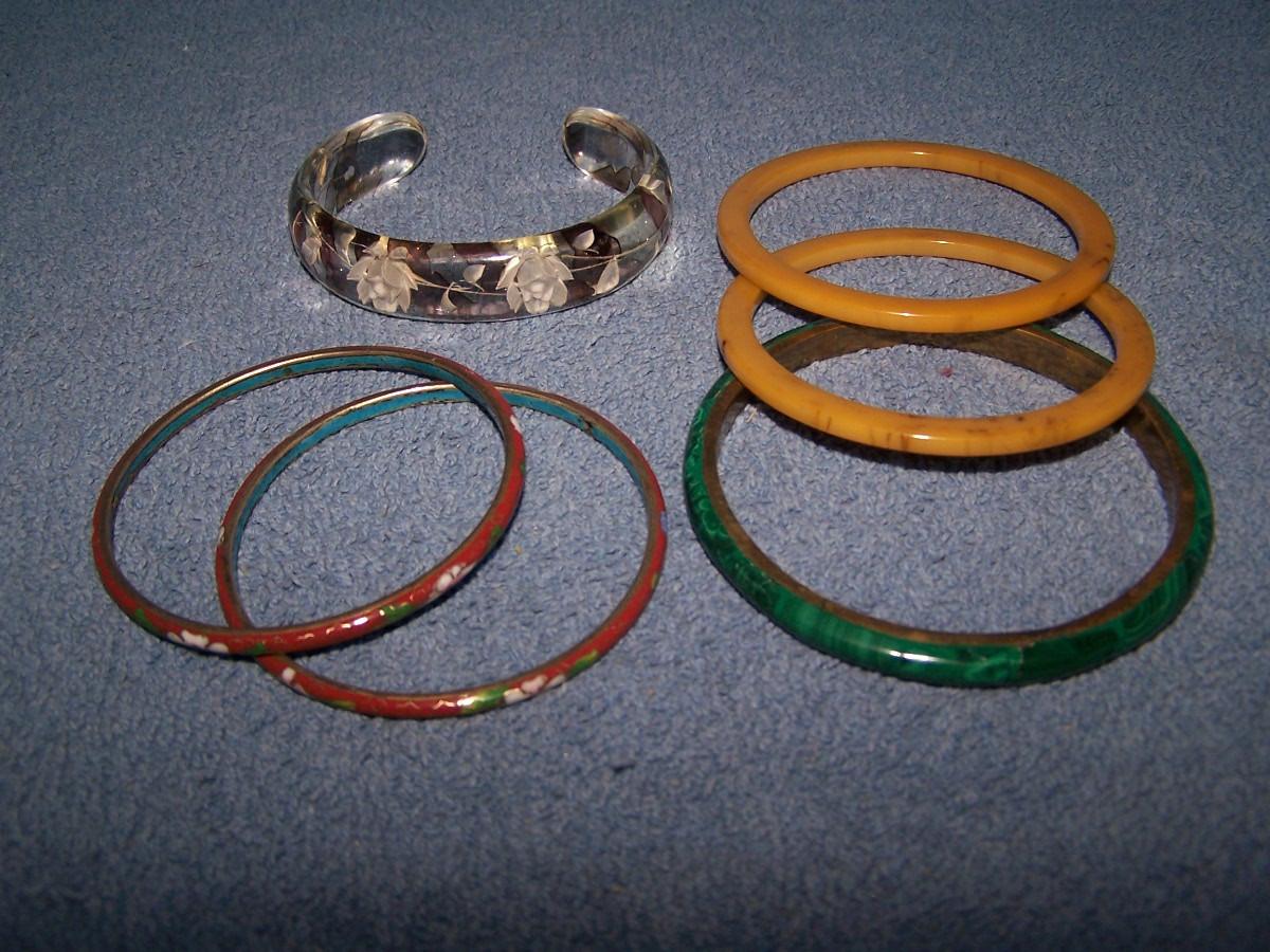 THESE ARE WONDERFUL VINTAGE 6 BANGLE BRACELETS!!! BANGLES-2 CLOISONNE, BAKELITE, 2 MALACHITE.. 1 LUCITE CUFF.. UNMARKED.. LIGHT WEAR..