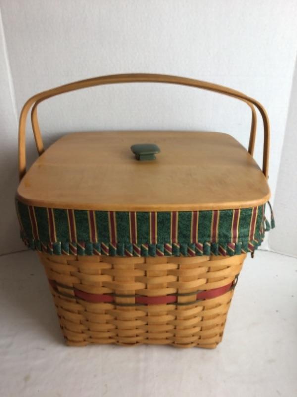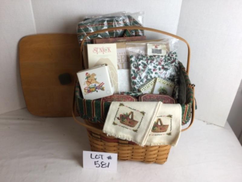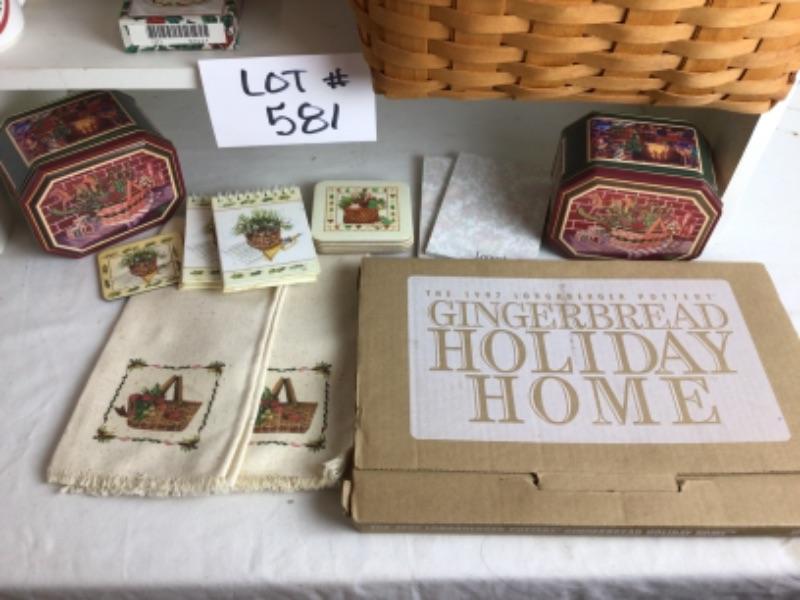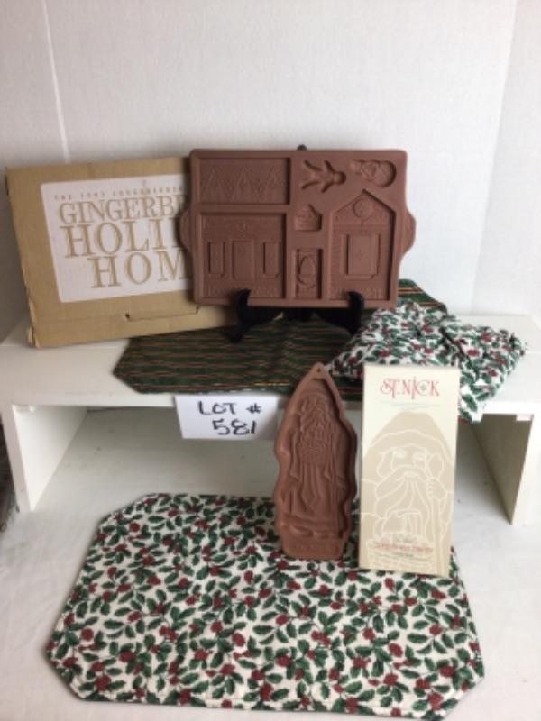 Longaberger Evergreen basket with two liners and two plastic protectors, 1997 Longaberger Pottery Gingerbread Holiday Home mold, 1993 Longaberger Pottery St. Nick cookie mold, Merry Christmas basket tie on, set of four reversible place mats, set of seven dinner napkins, two printed fringed Sleigh Bell basket tea towels, four corkback coasters, four notepads, Fresh From the Pantry cookbook. Two Christmas tins and Wreath coffee mug.