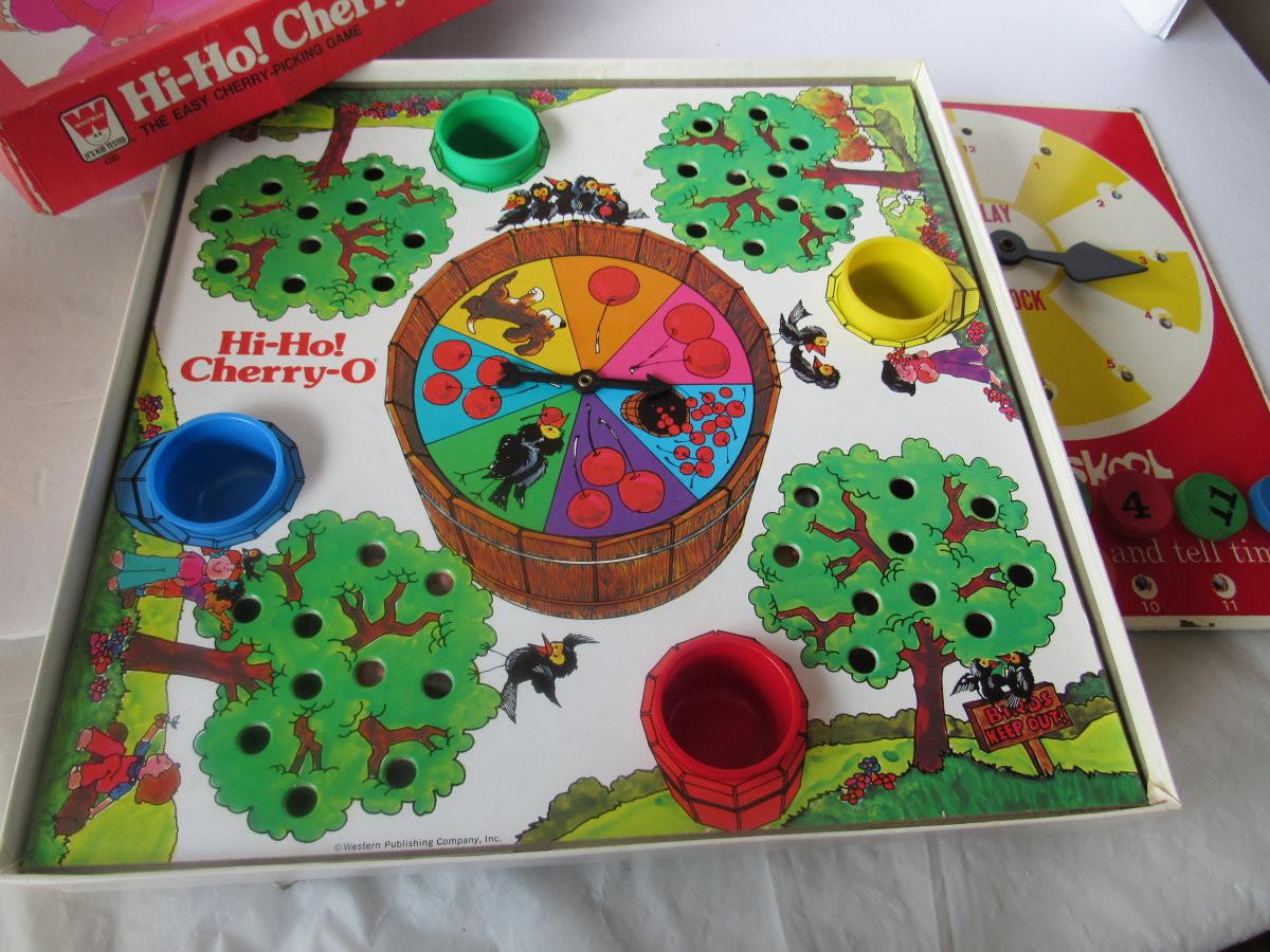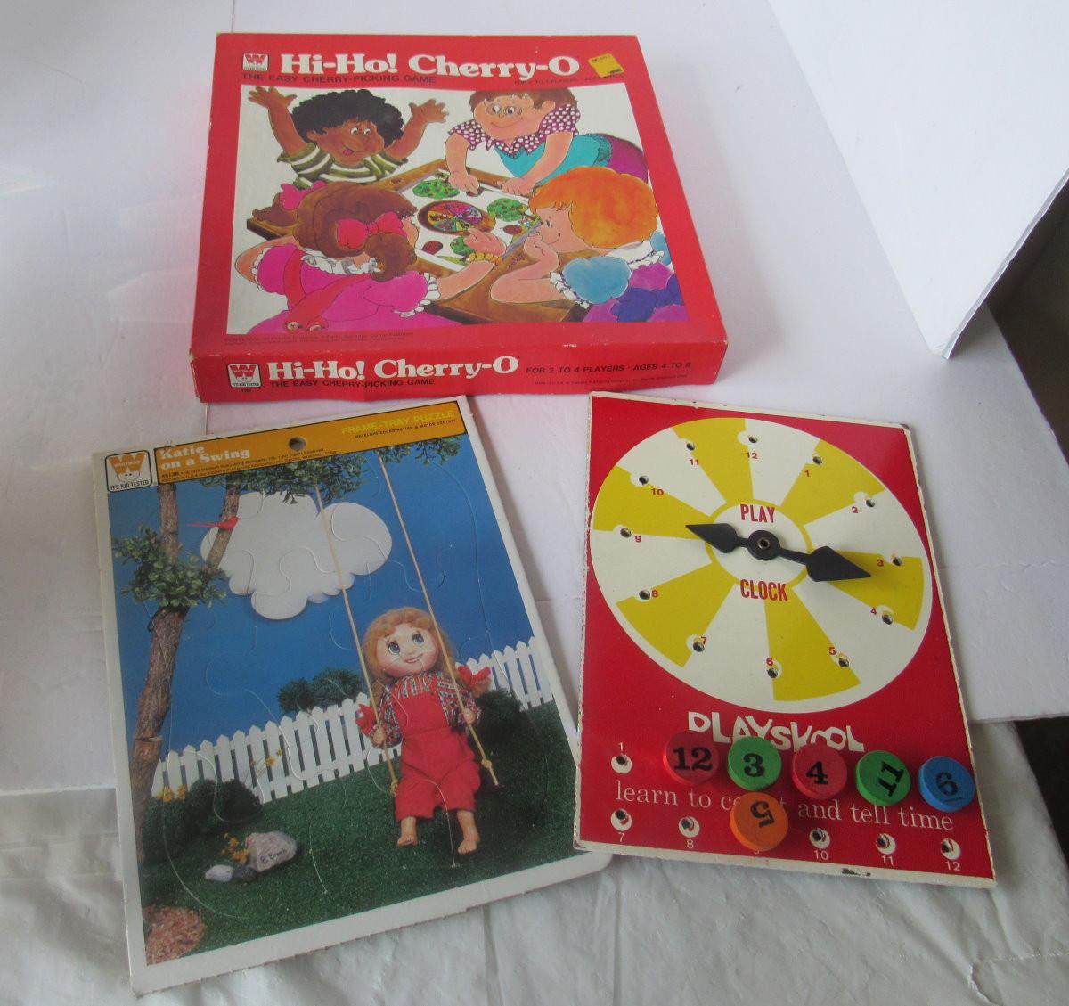 Puzzle is complete. Cherry-O looks complete. Clock is missing parts.