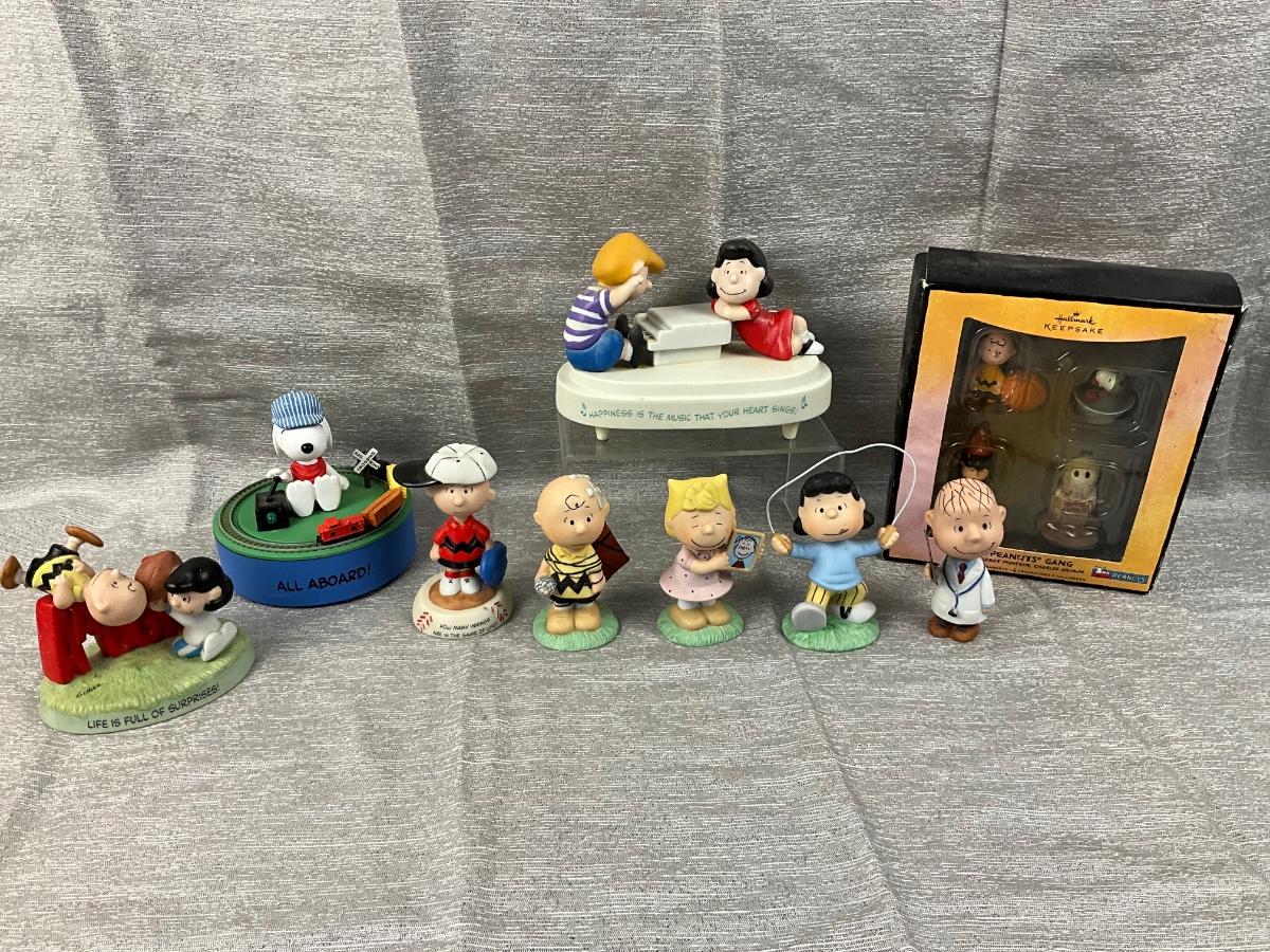 Assorted Peanuts figures and a box of Peanuts hallmark ornaments.