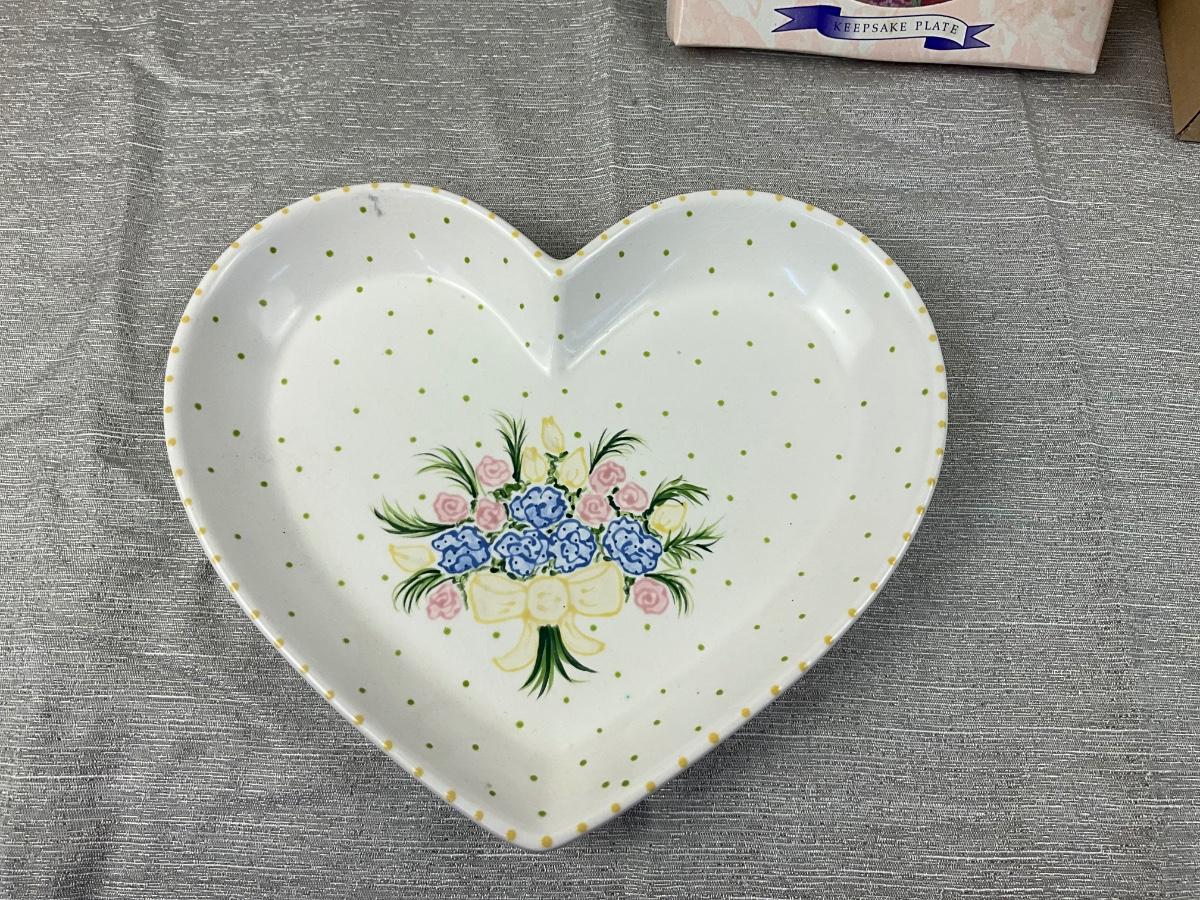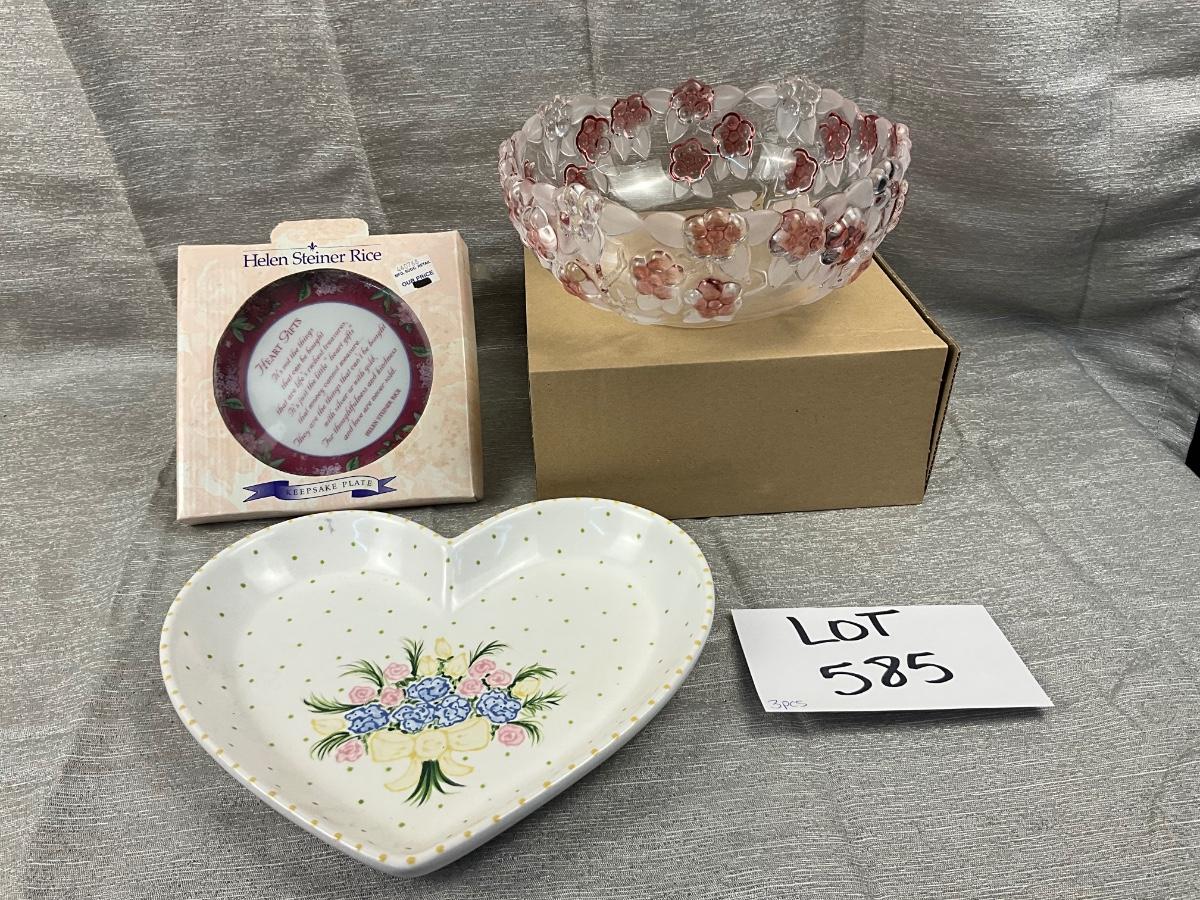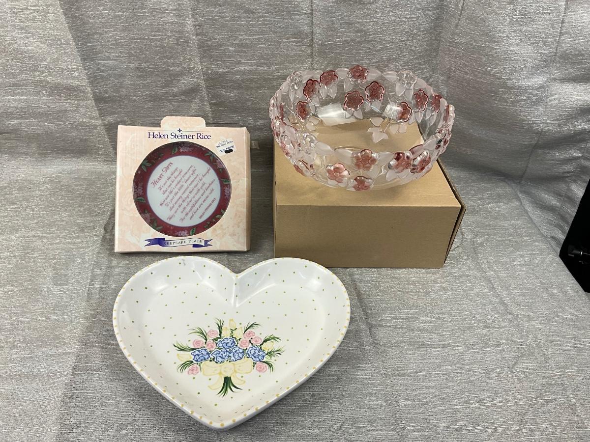 The lot contains a ceramic heart plate, poem plaque and a Studio Silversmiths crystal bowl.