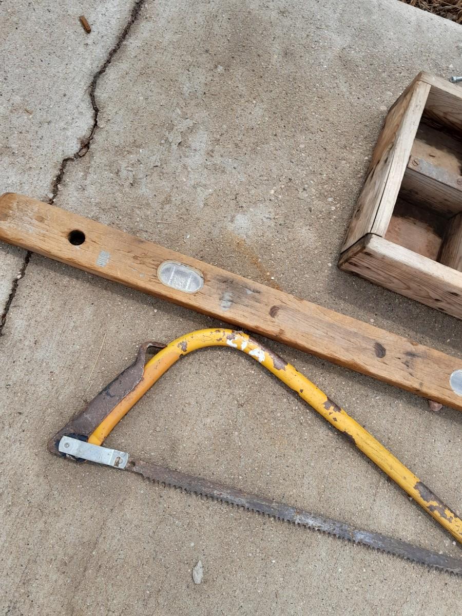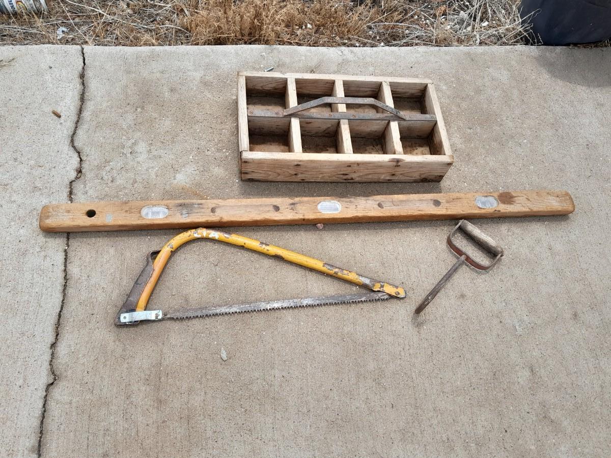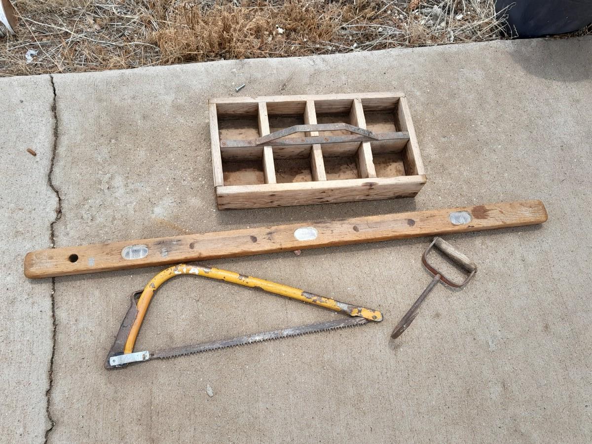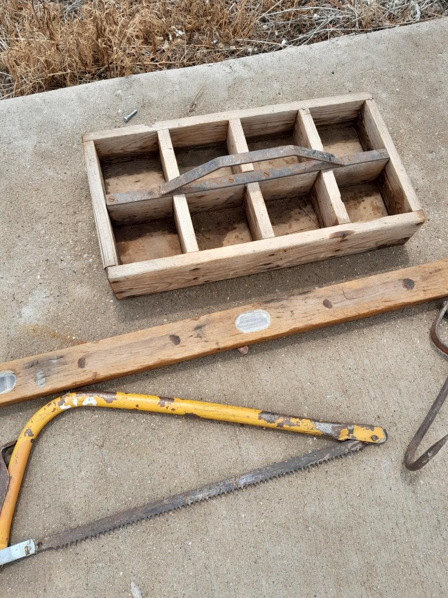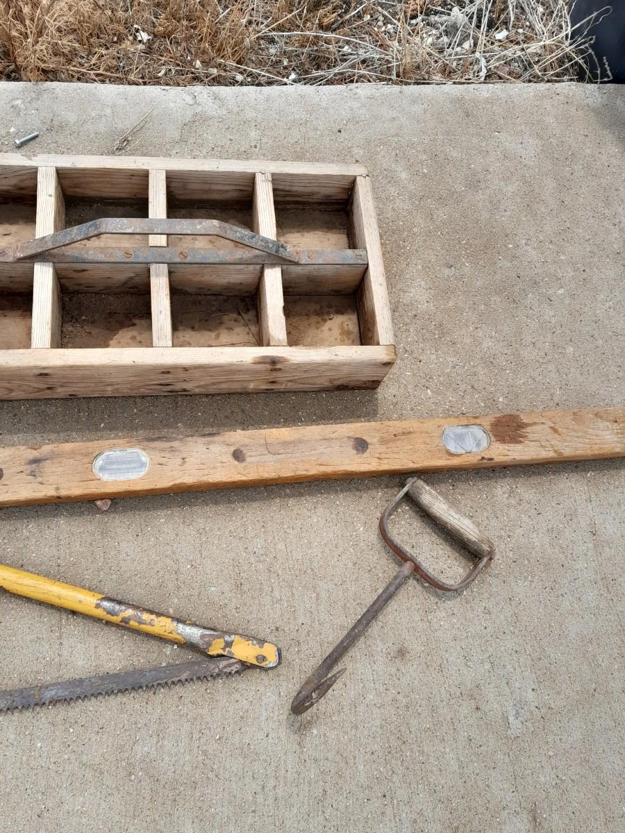 WOODEN BOX ORGANIZER AND VINTAGE TOOLS