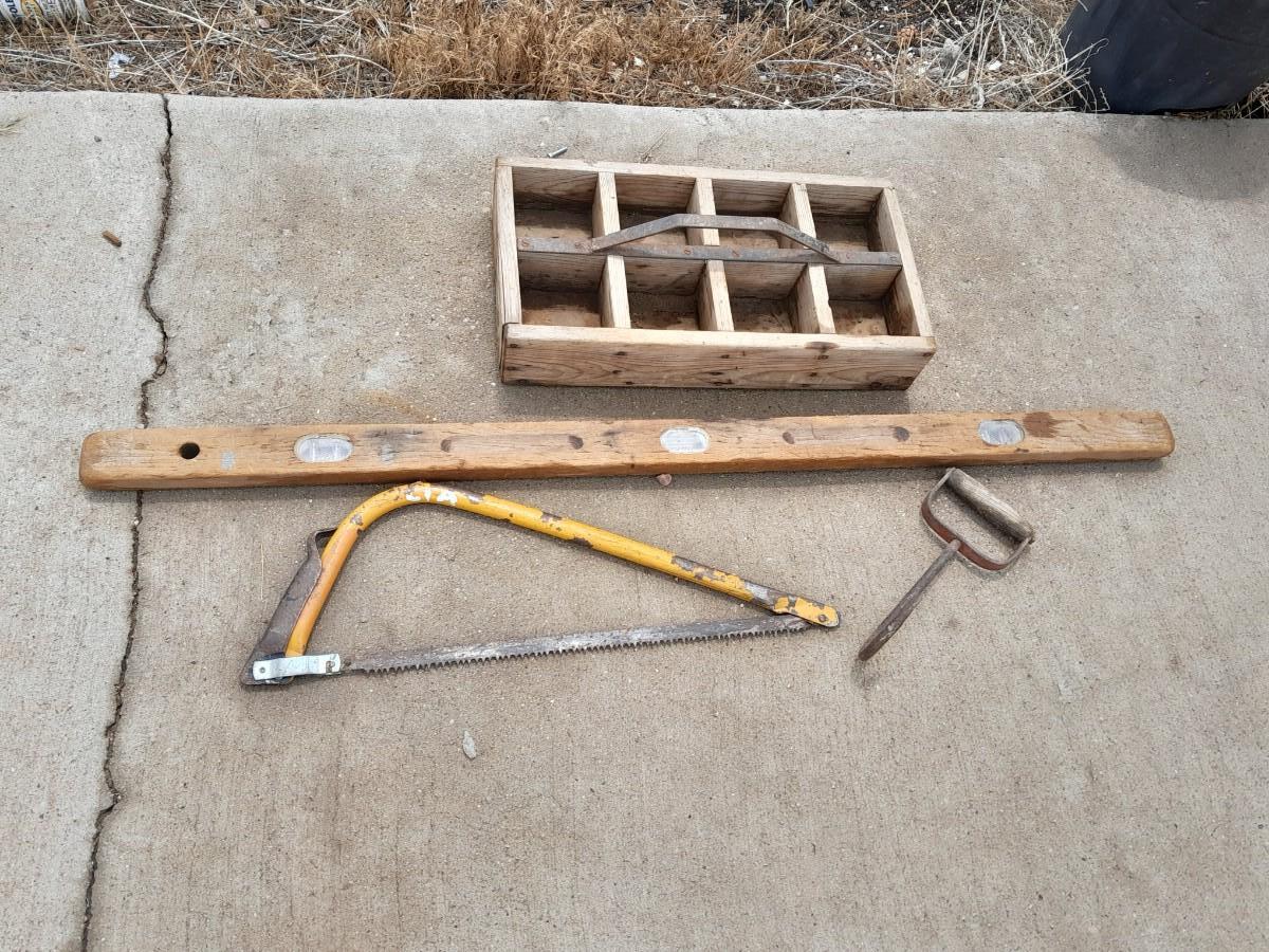 LOT 586 WOODEN BOX ORGANIZER AND VINTAGE TOOLS  (NS)