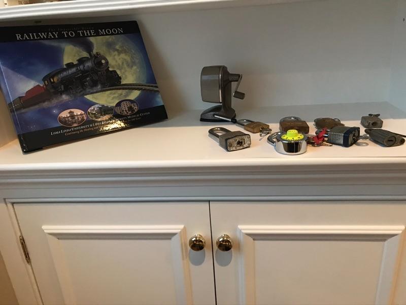 Multiple locks, Vintage pencil sharpener, and book - Railway to the Moon