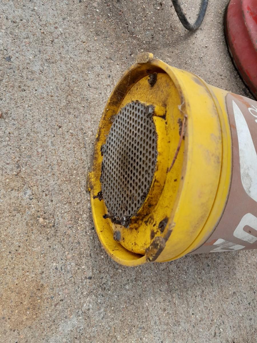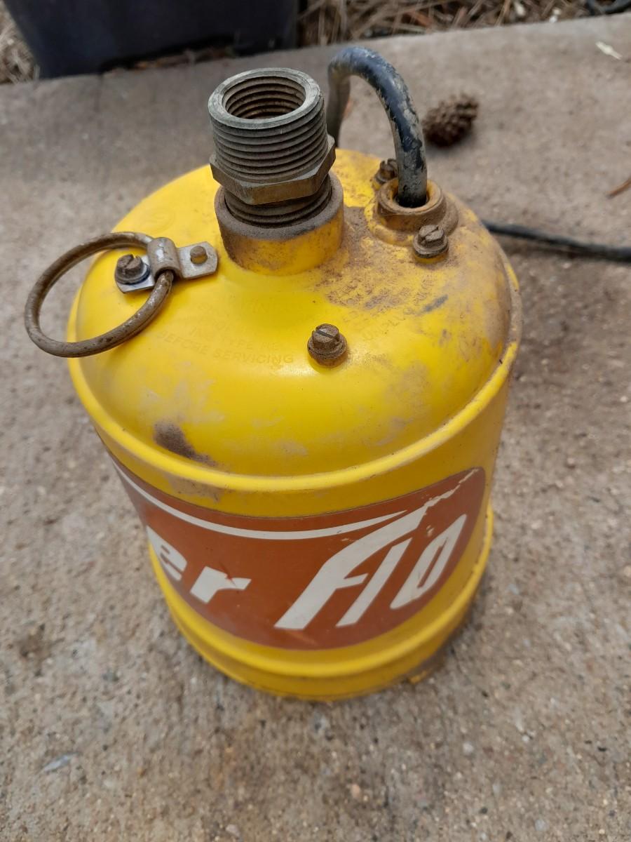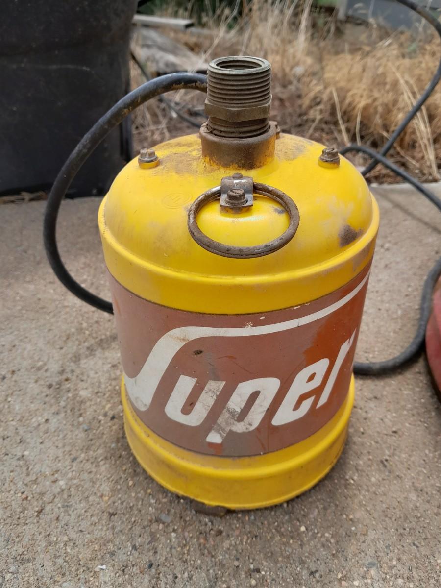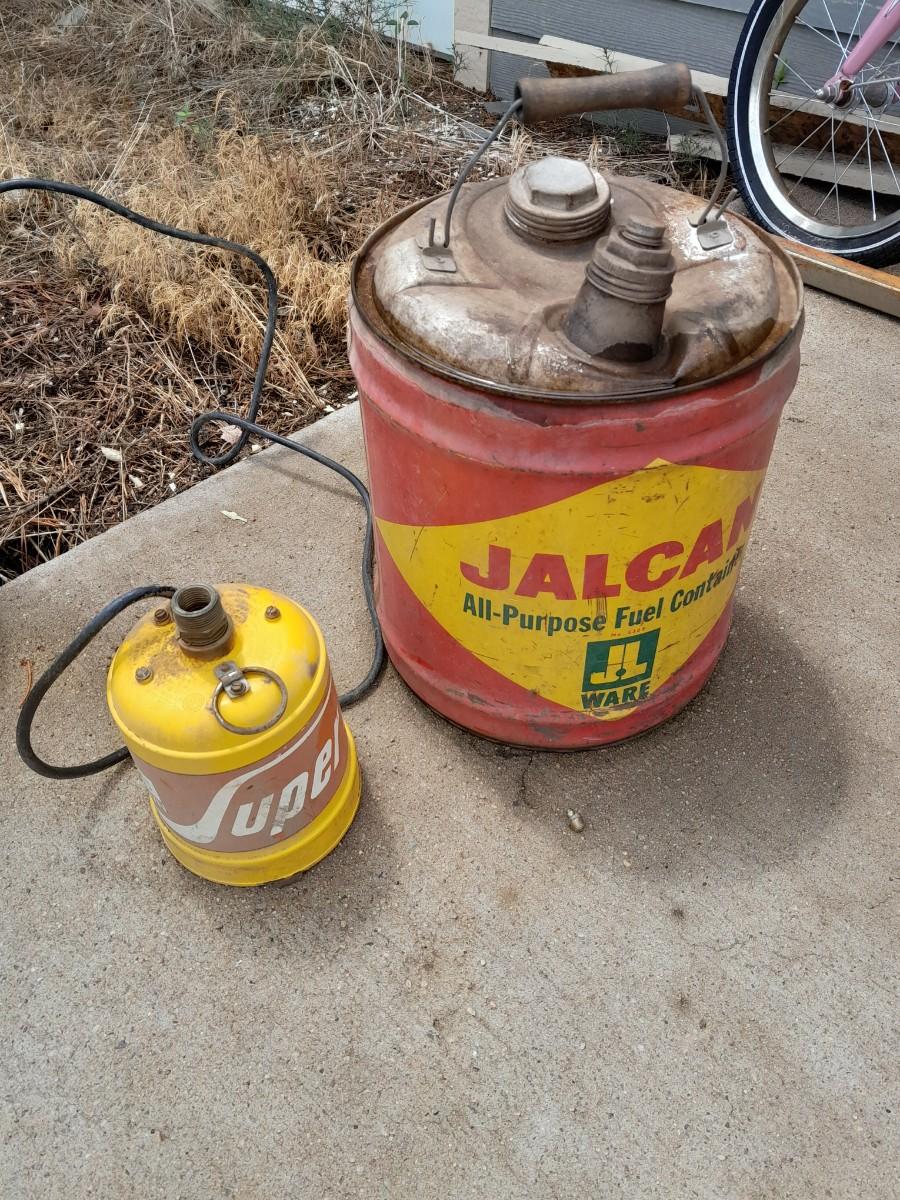 METAL JALCAN FUEL CONTAINER PARTIALLY FULL OF UNKNOWN LIQUID AND SMALL SUPER FLO BOTTLE WITH ELECTRIC CORD ATTACHED