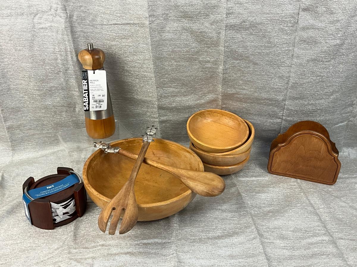 The lot contains salad bowl serving set with serving utensils, napkin holder, coasters and a brand new Sabatier pepper mill.