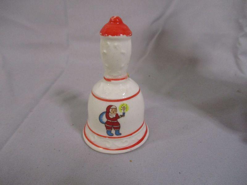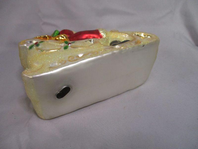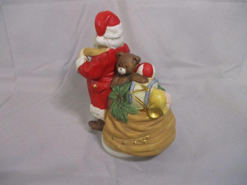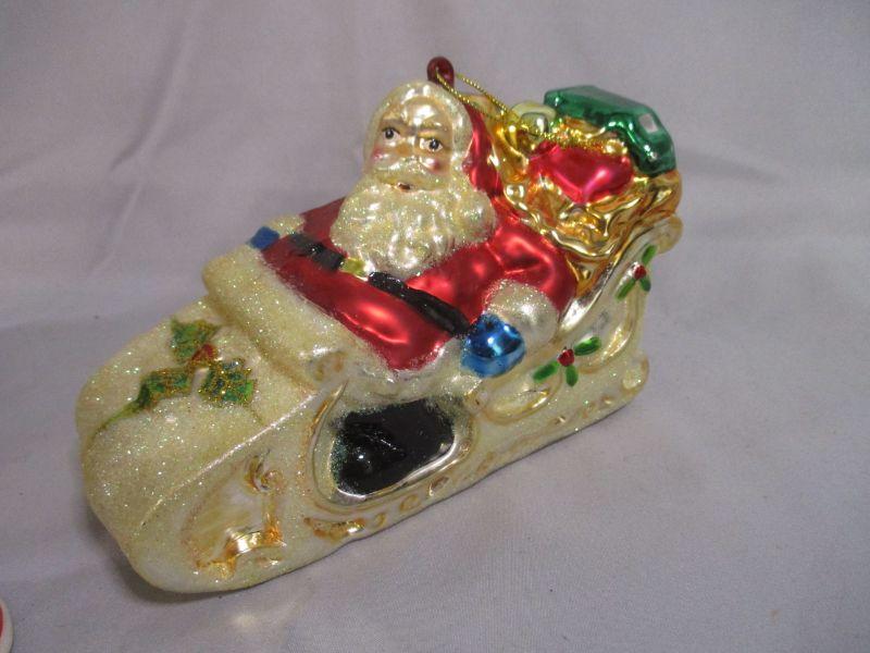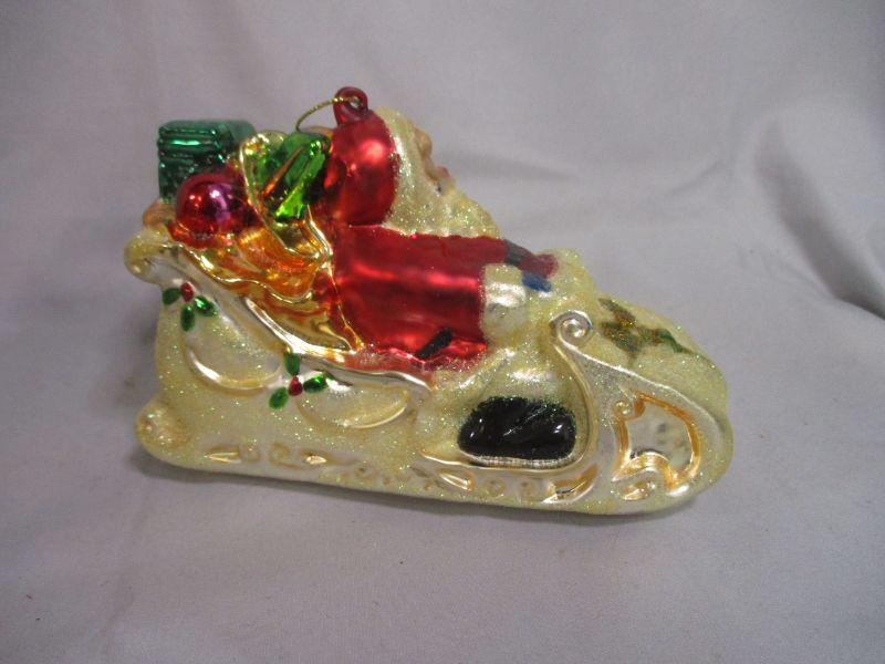 The Santa in a sleigh is technically an ornament, but it is large enough to be put on display on a mantel or shelf. It appears to be made of glass. The music box plays, "Santa Claus is Coming to Town". The bell is about 3.5" tall and has the same picture on front and back.