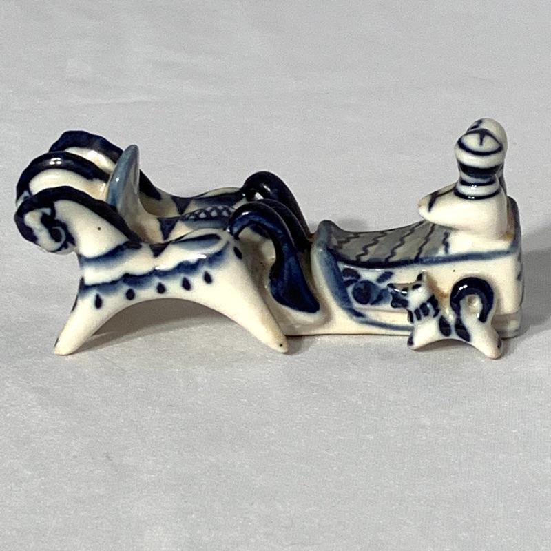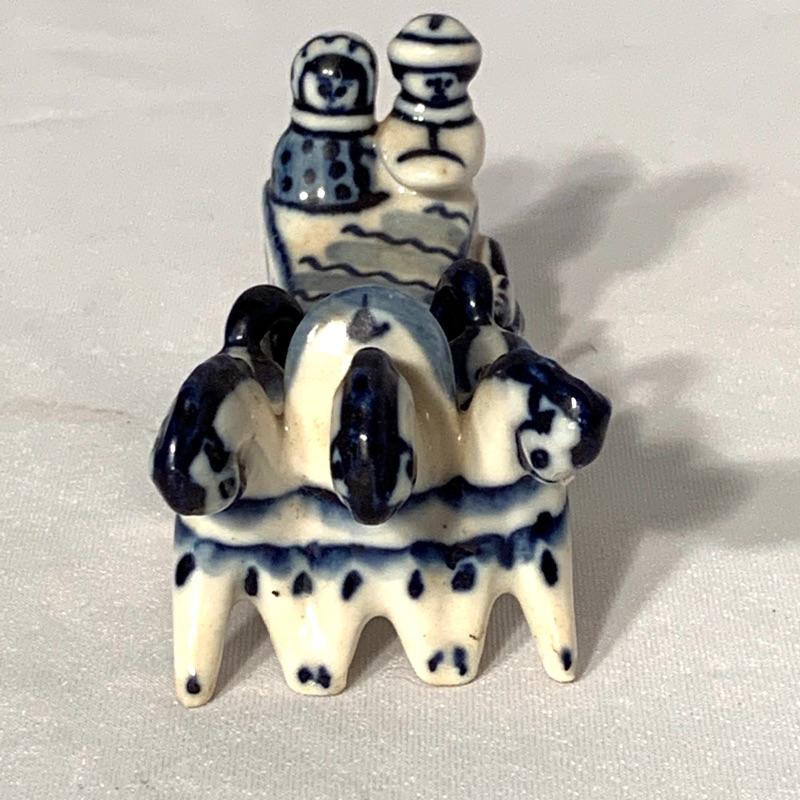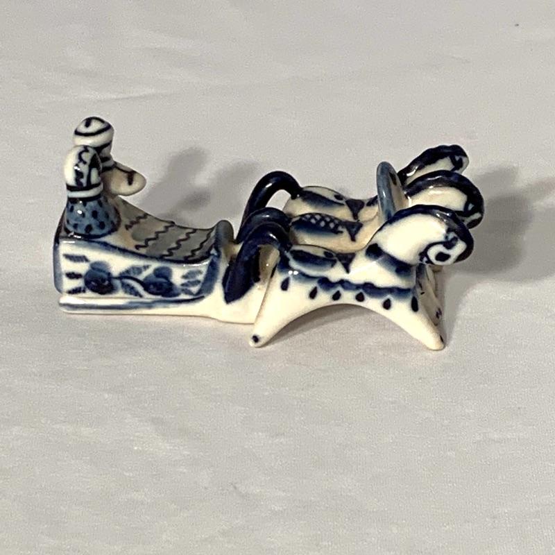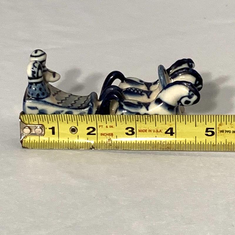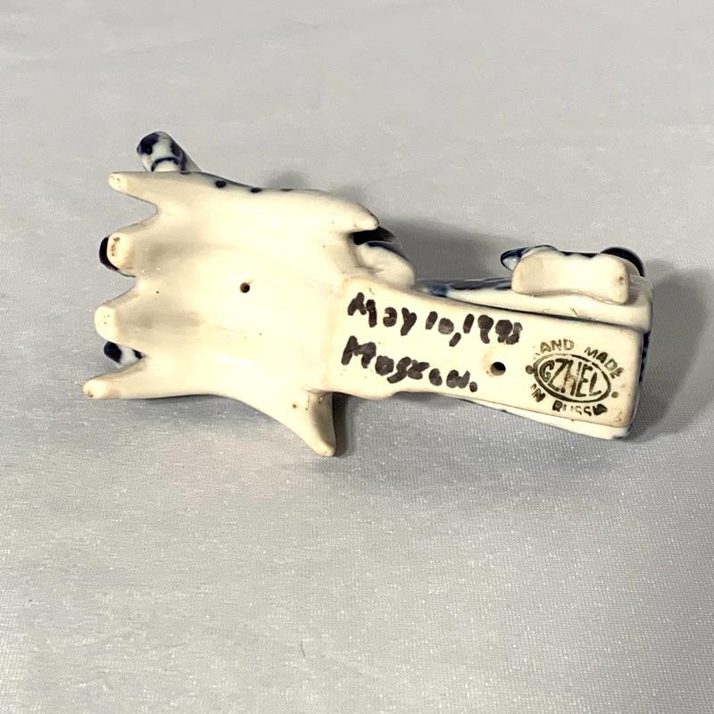 Also included is a small blue and white porcelain figurine of horses and people riding in a sleigh, with a cute little dog running alongside them. Handwriting on the bottom reads “May 10, 1998 Moscow” and there is also a printed stamp that says “Gzhel Hand Made in Russia”.