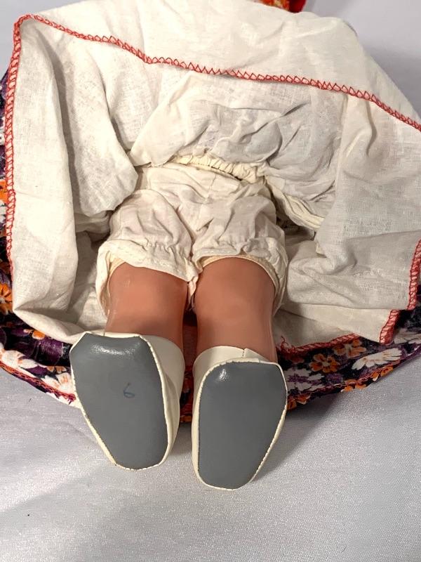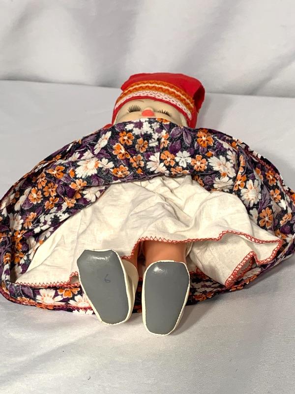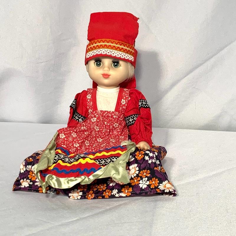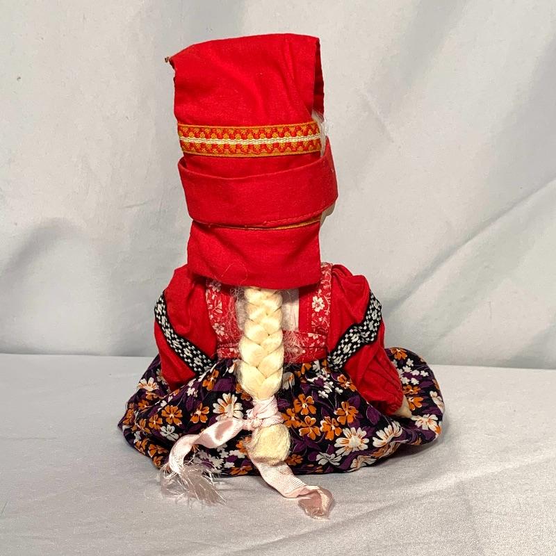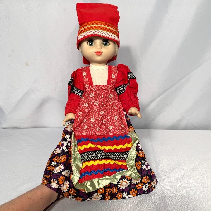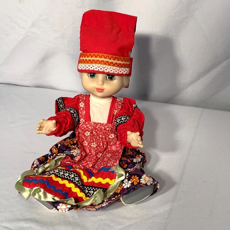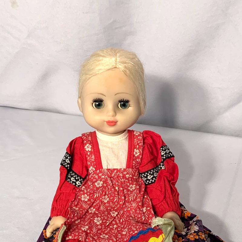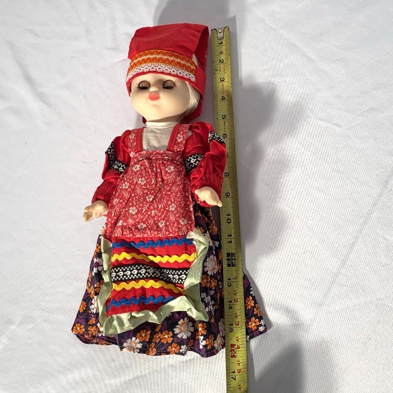 And last, but not least, there is an adorable doll dressed in what appears to be traditional Russian garb. She has sparkly blue eyes with long lashes, a long blond braid, and movable arms and legs. She has a hat, cute little boots, and a petticoat and bloomers under her dress. Can sit or stand. Her eyes close when she is laid down horizontally. She would need a doll stand or some kind of support to stand on her own. Shipping available.