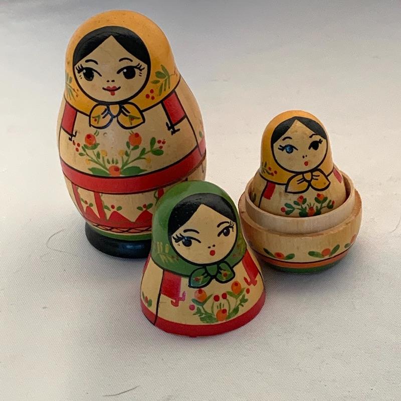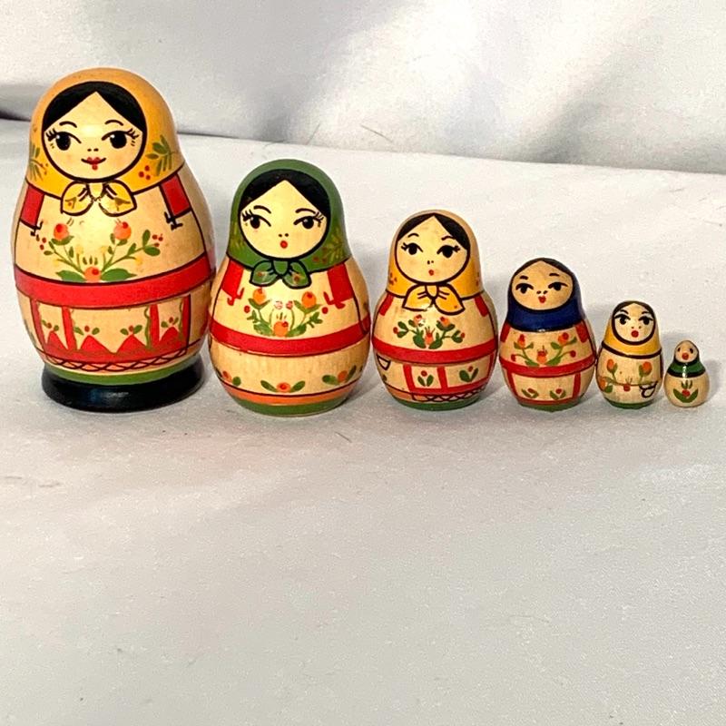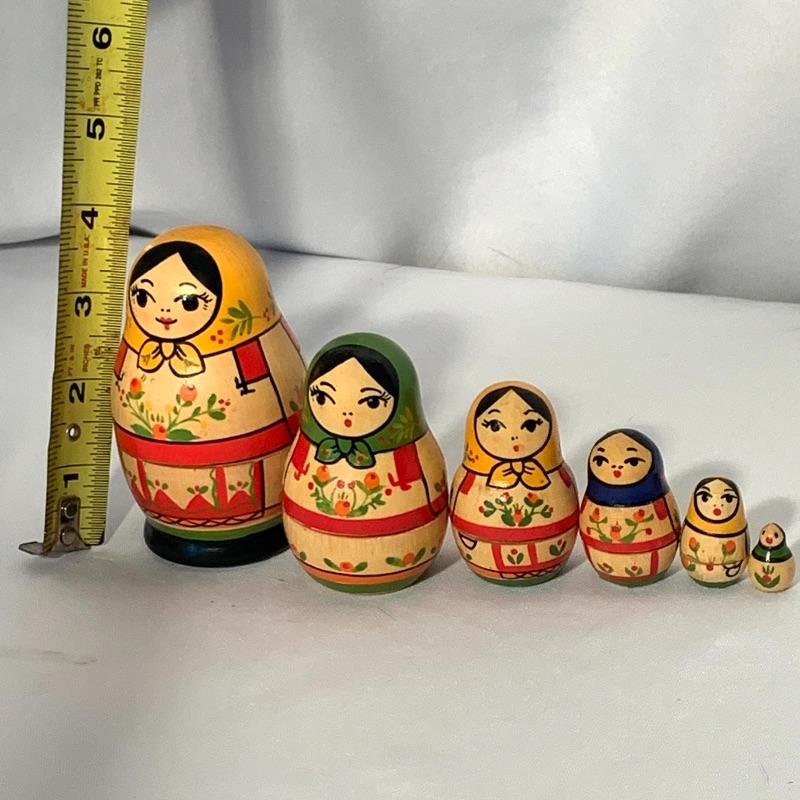 Take a trip to Russia without even leaving your living room with this beautiful collection of souvenirs! The lot includes one set of beautifully hand-painted wooden Matryoshka nesting dolls, with six little dolls total that decrease in size and fit inside of one another.