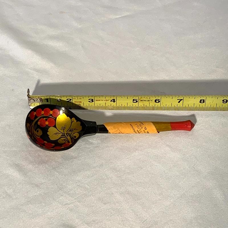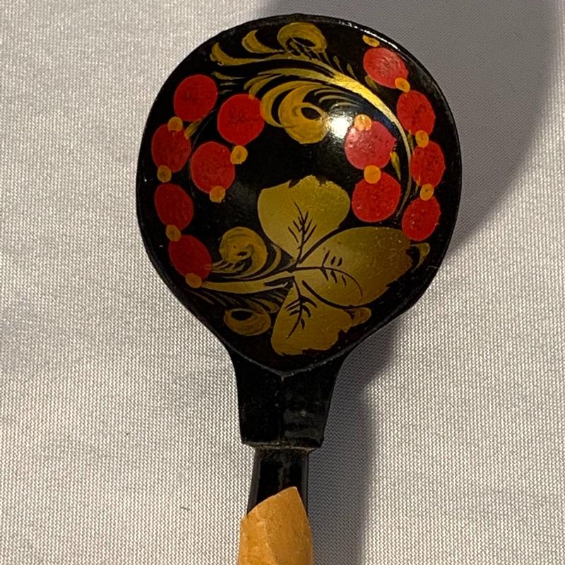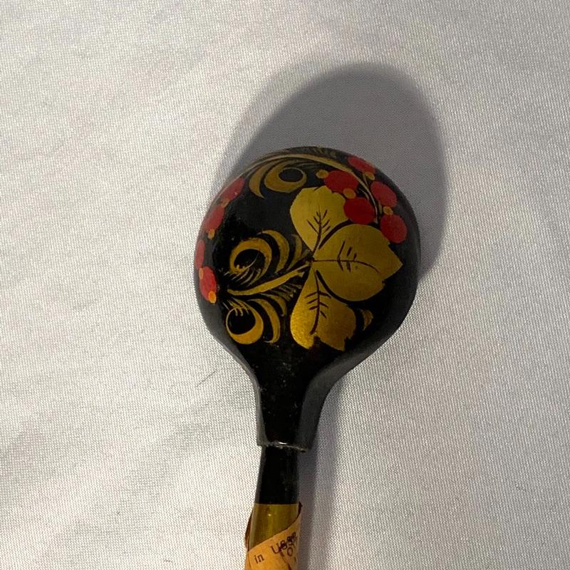There are also two hand-painted round wooden spoons with a berry motif. These both have a paper tag wrapped around the handle that say “USSR” and the rest is written in a foreign alphabet (presumably Russian).