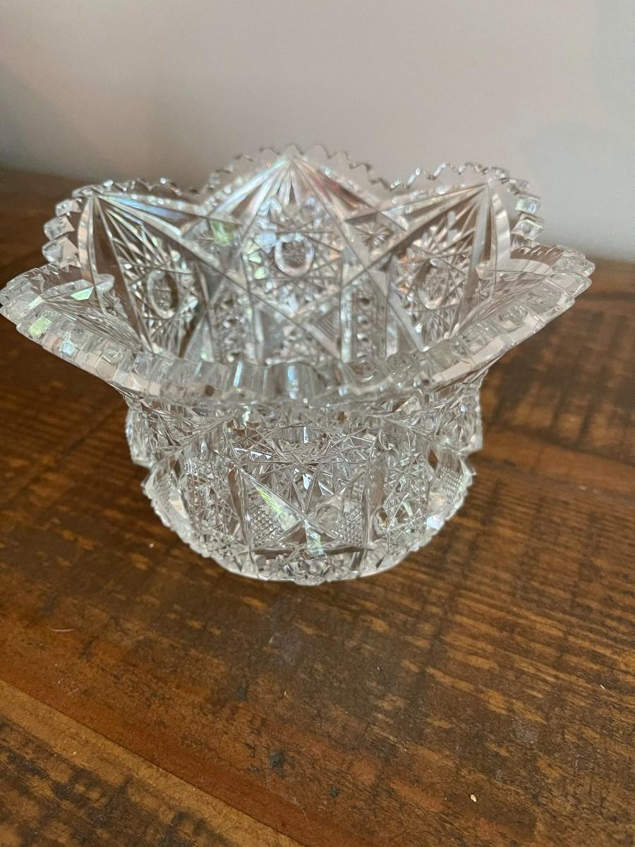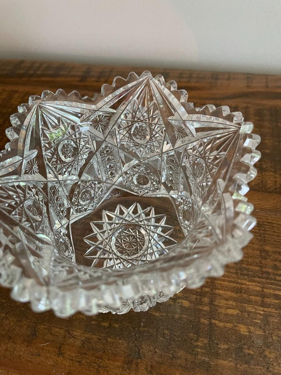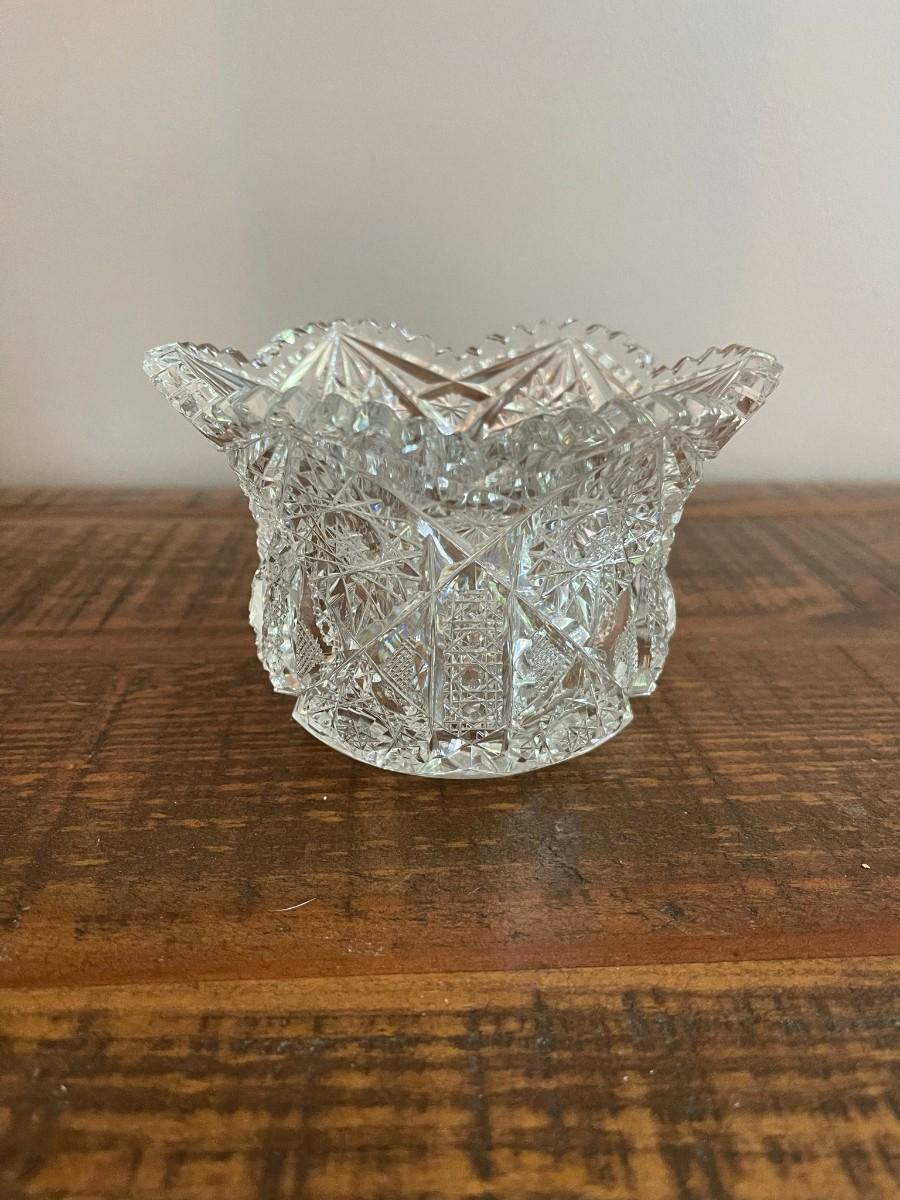 American Cut Glass, Nut/Miscelleanous Small Bowl. Smooth inside, cut exterior in geometric patterns. Scalloped edges/rim. Great condition.