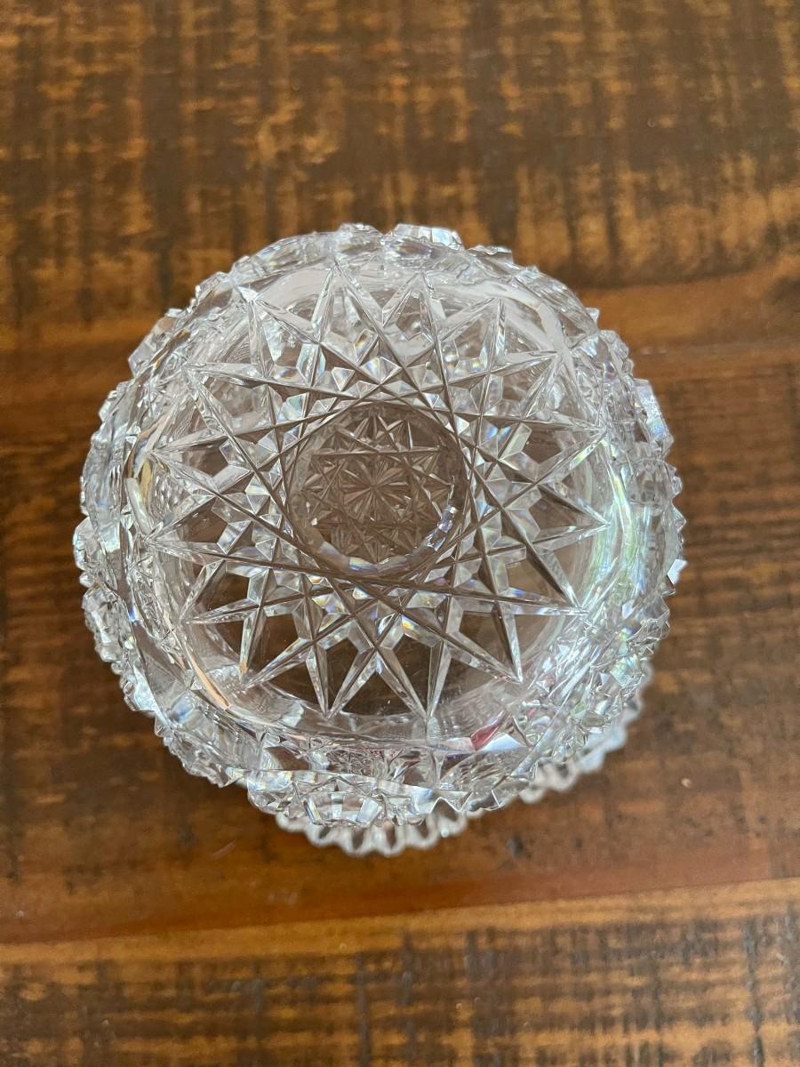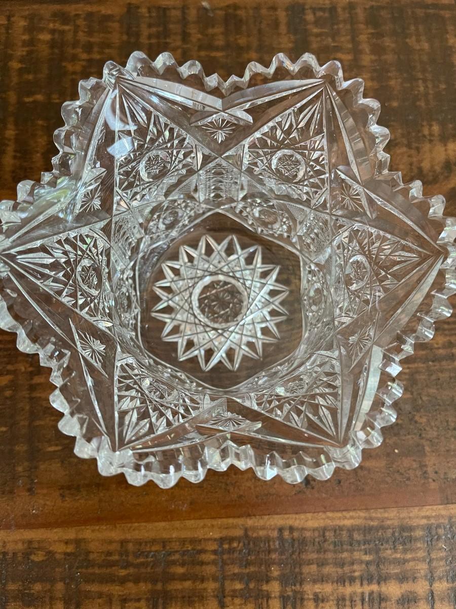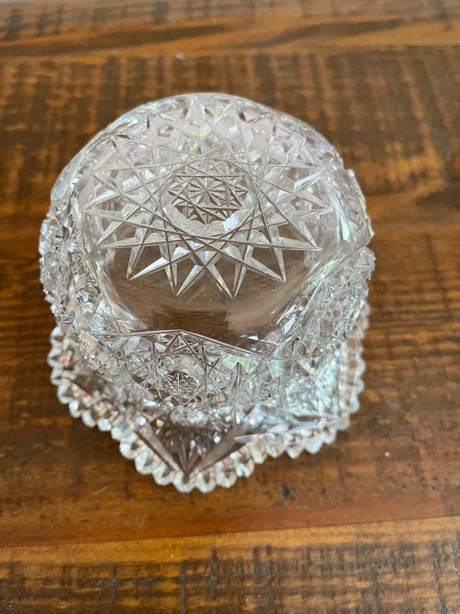 American Cut Glass, Nut/Miscelleanous Small Bowl. Smooth inside, cut exterior in geometric patterns. Scalloped edges/rim. Great condition.