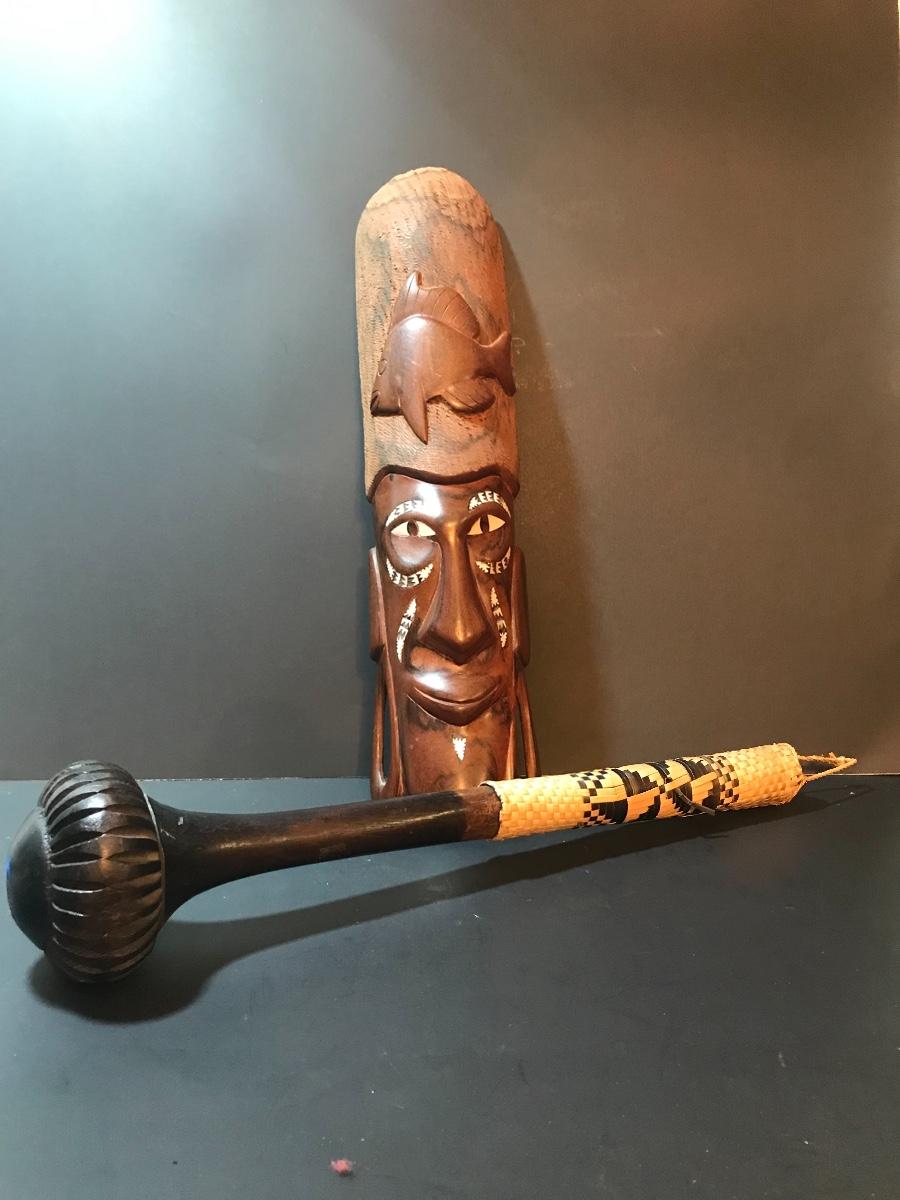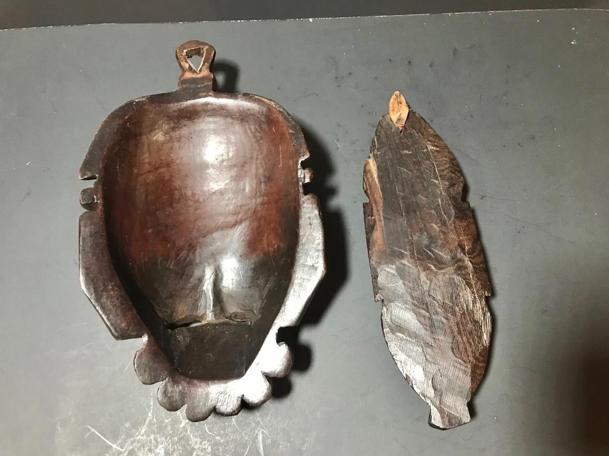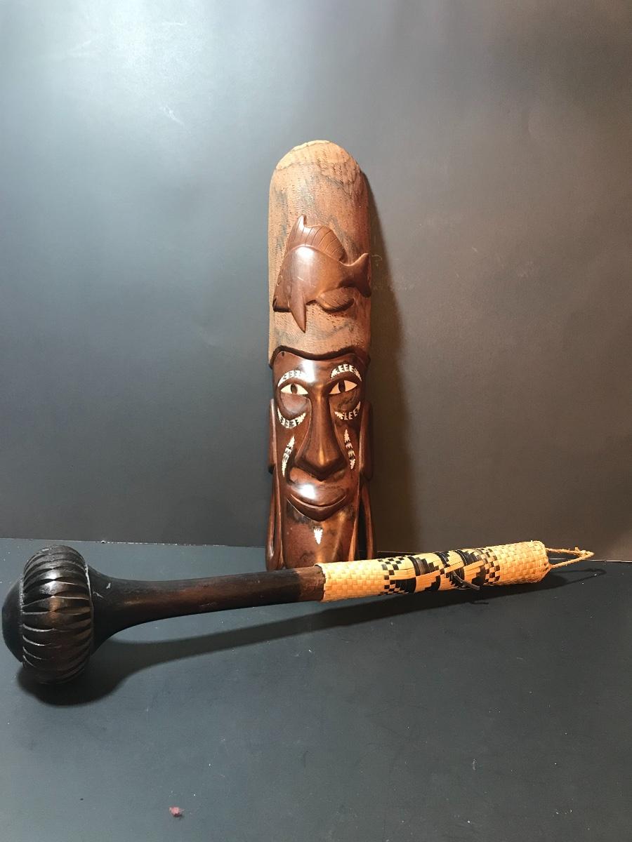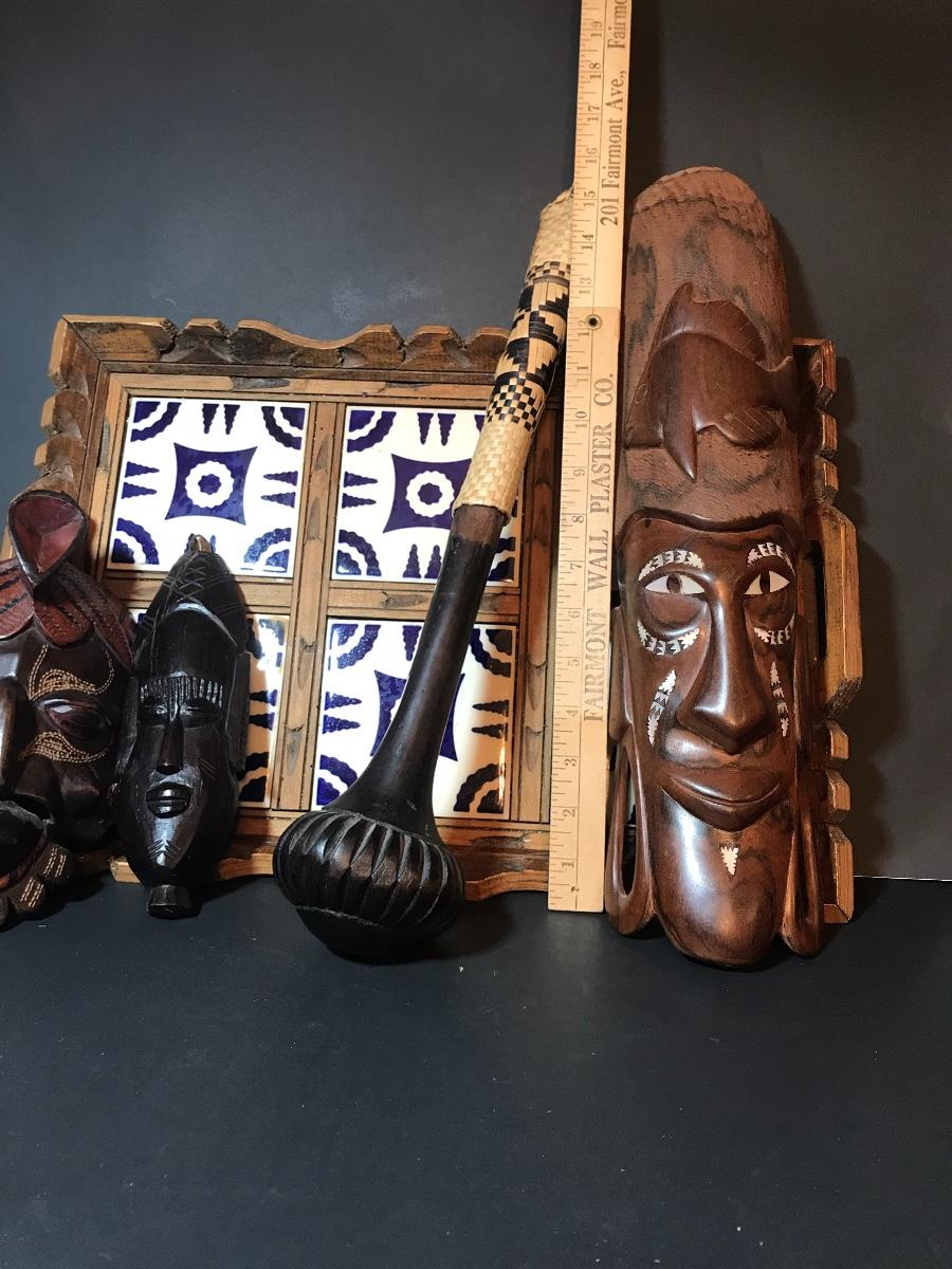 Wooden, hand carved, decorative masks, a war club, and a tiled wooden tray. Please see all pictures as they are the best representation of the items. The pictures show condition, measurements if taken, and what is included in the lot. Due to the large amount that we photograph and the time frame, we are not always able to take measurements. All items unless noted, are pre-owned and have been used. If you purchased furniture, you must bring help. We do not allow one person to carry large furniture out on their own. Bring help, tools and a truck for the safety of our client’s homes, and your personal safety. Company policy. Thank you.
