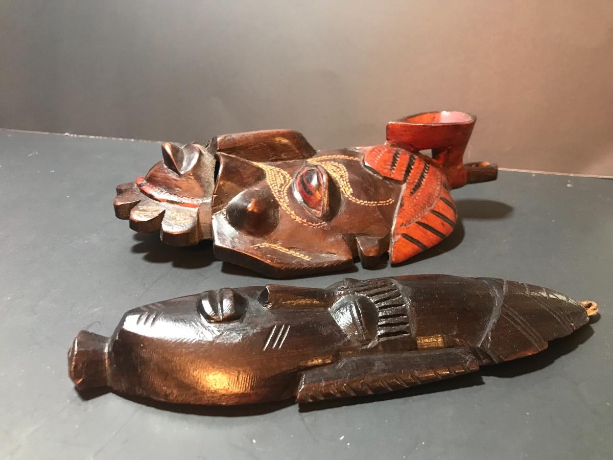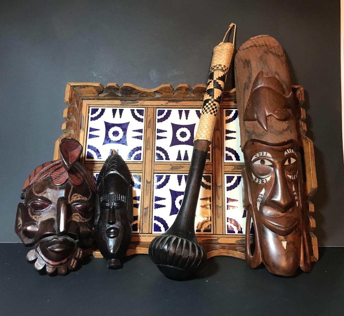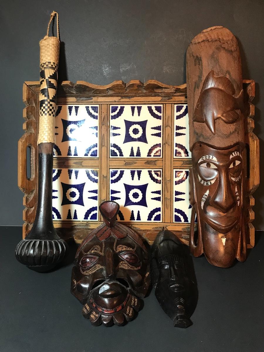 Lot 59:  Carved Masks, Tiled Carved Tray and More