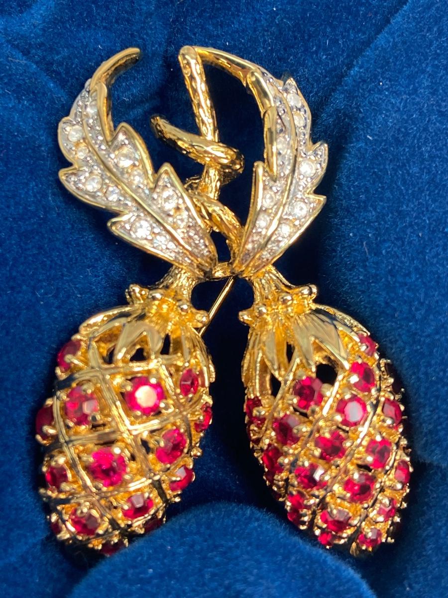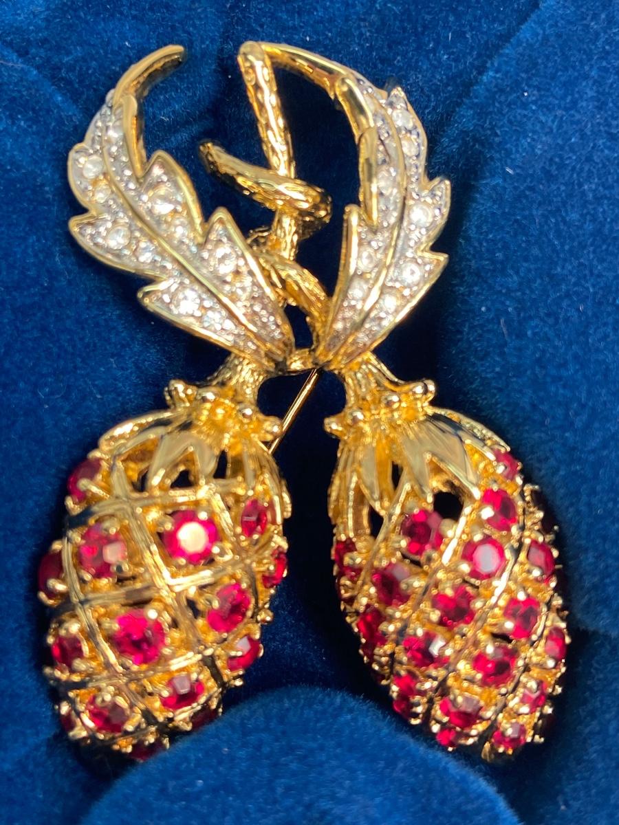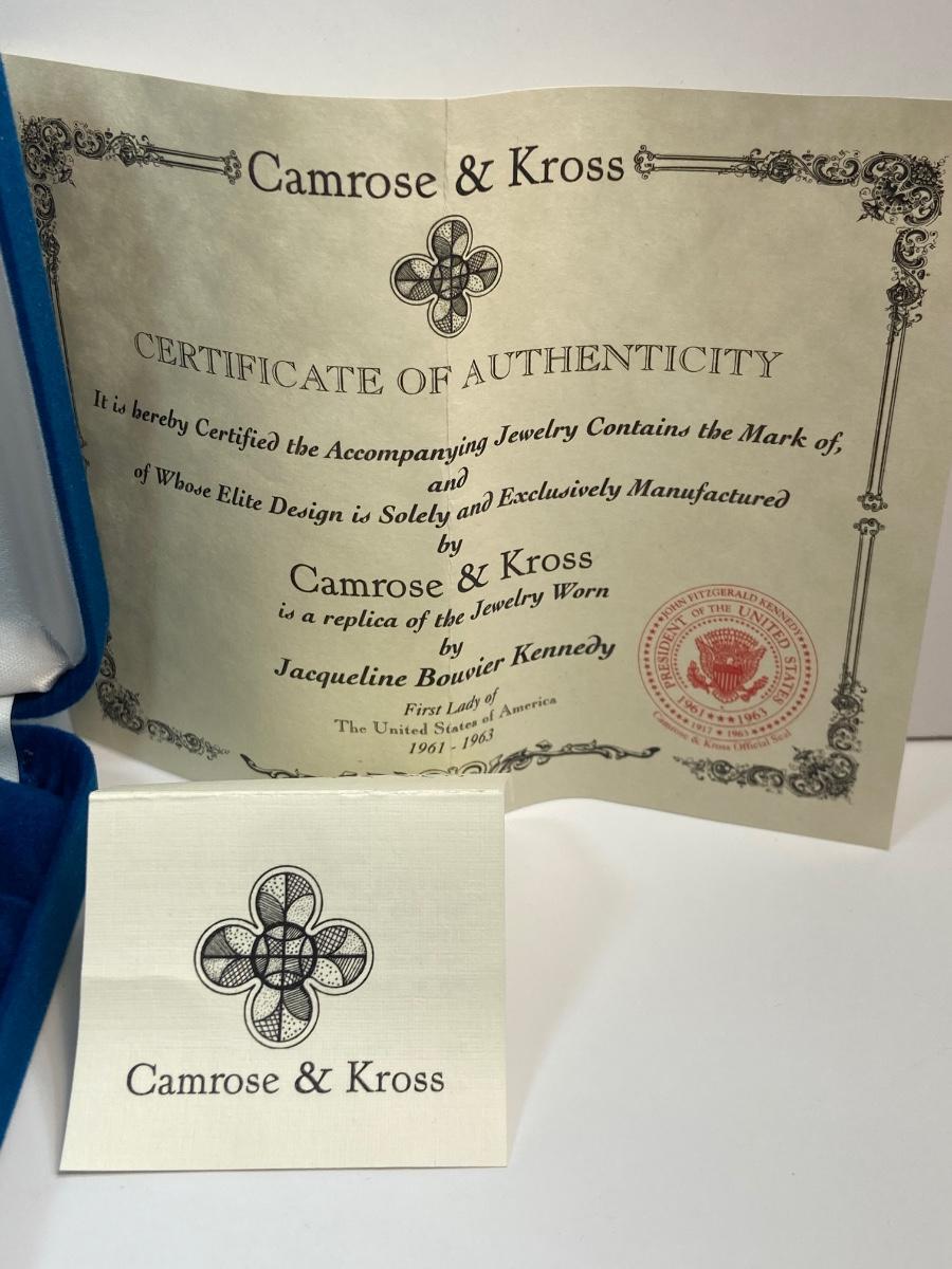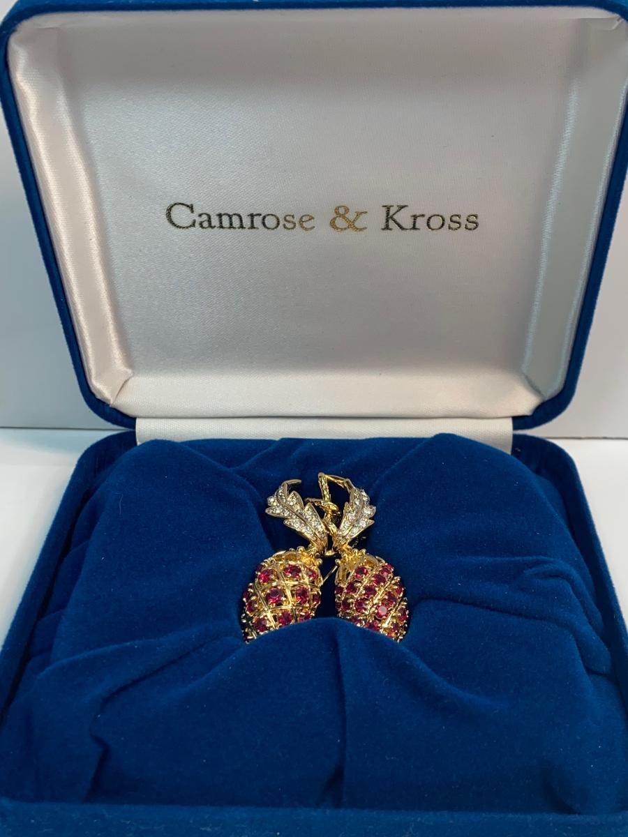 CAMROSE & KROSS is the only manufacturer authorized to create replicas of the iconic Jackie Kennedy jewelry collection. They produced fabulous quality pieces that are easily mistaken for the real thing. This particular berry pin is a gorgeous recreation of the pin that former president John F. Kennedy commissioned for  Mrs. Kennedy to represent their two children, John, Jr. and Caroline. This famous brooch is so much prettier in person!