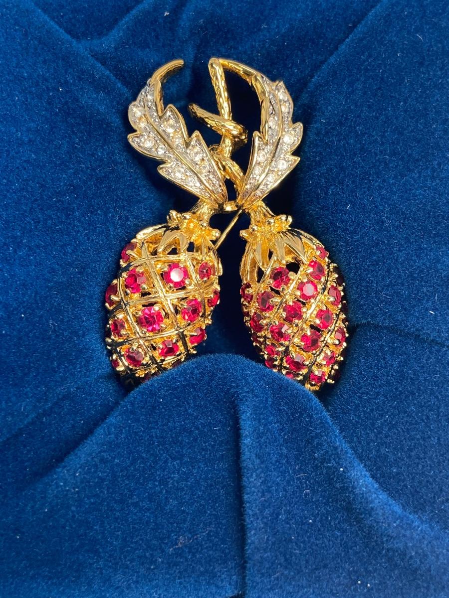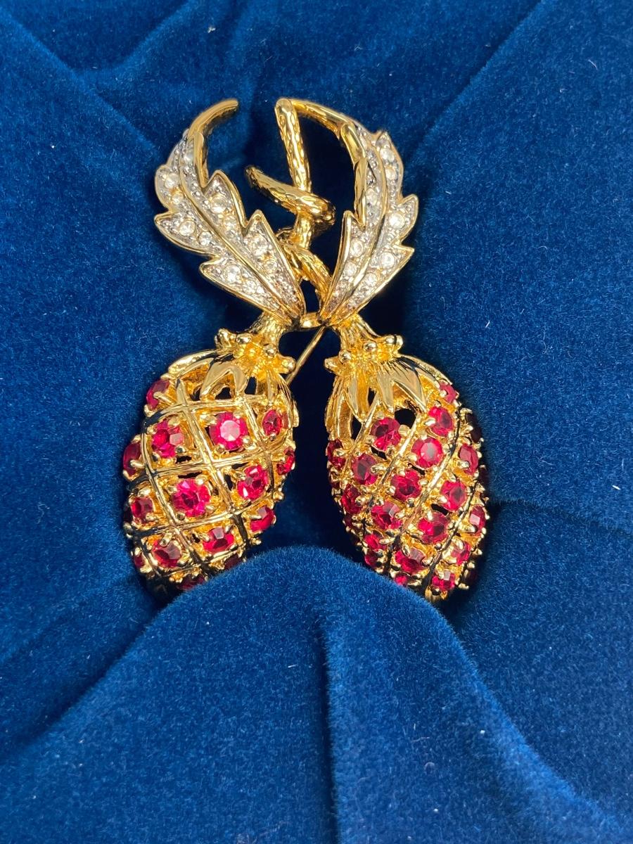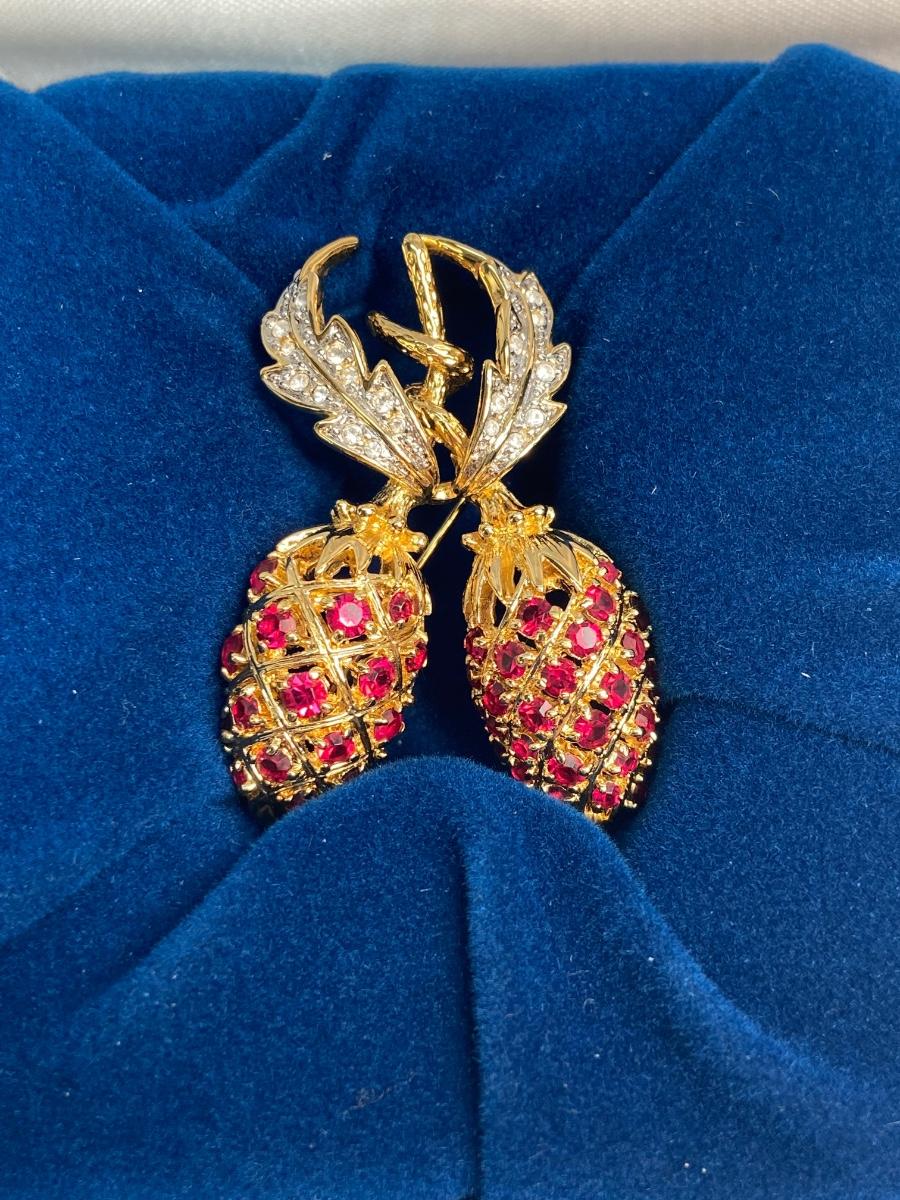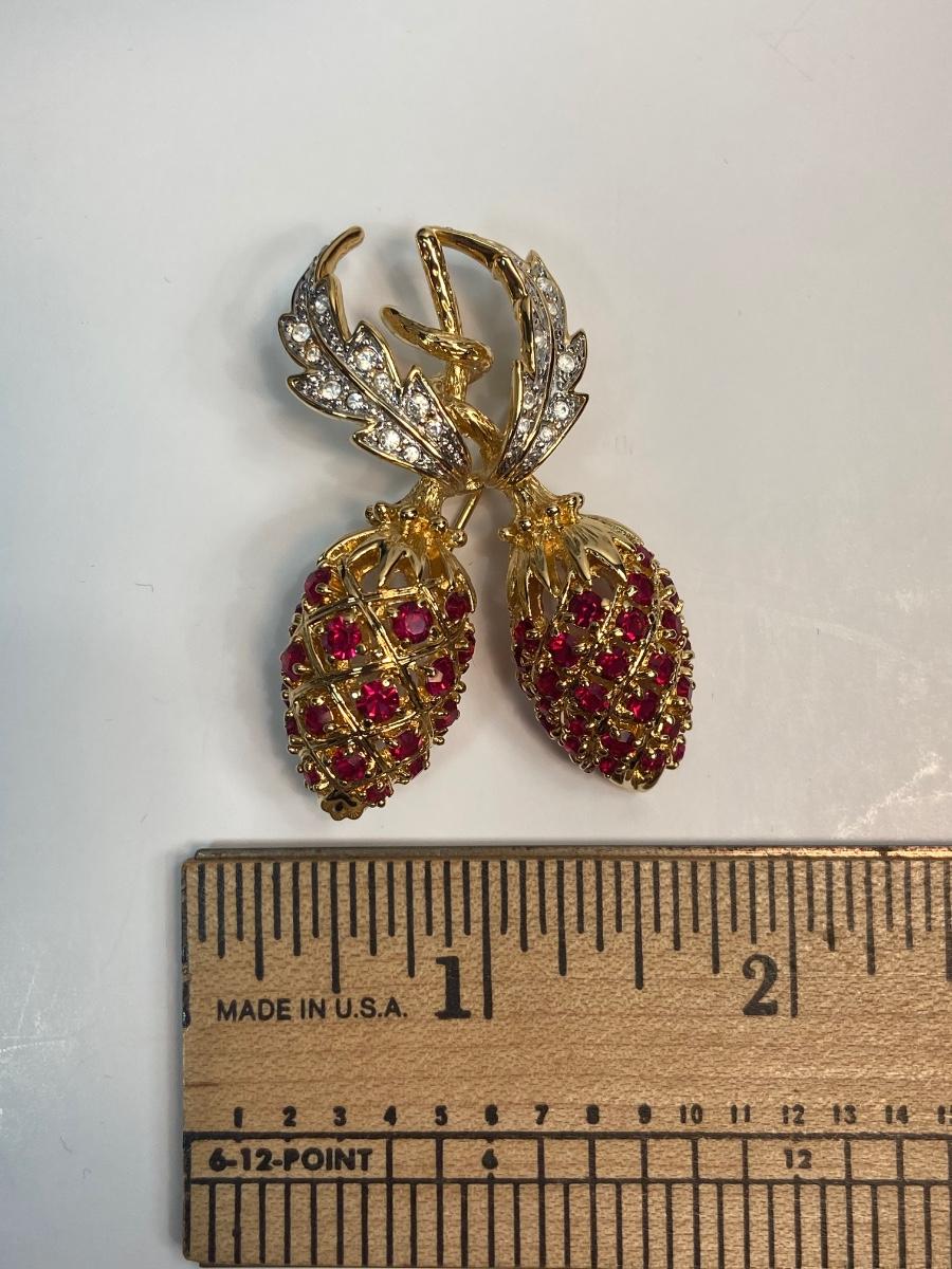 CAMROSE & KROSS is the only manufacturer authorized to create replicas of the iconic Jackie Kennedy jewelry collection. They produced fabulous quality pieces that are easily mistaken for the real thing. This particular berry pin is a gorgeous recreation of the pin that former president John F. Kennedy commissioned for  Mrs. Kennedy to represent their two children, John, Jr. and Caroline. This famous brooch is so much prettier in person!