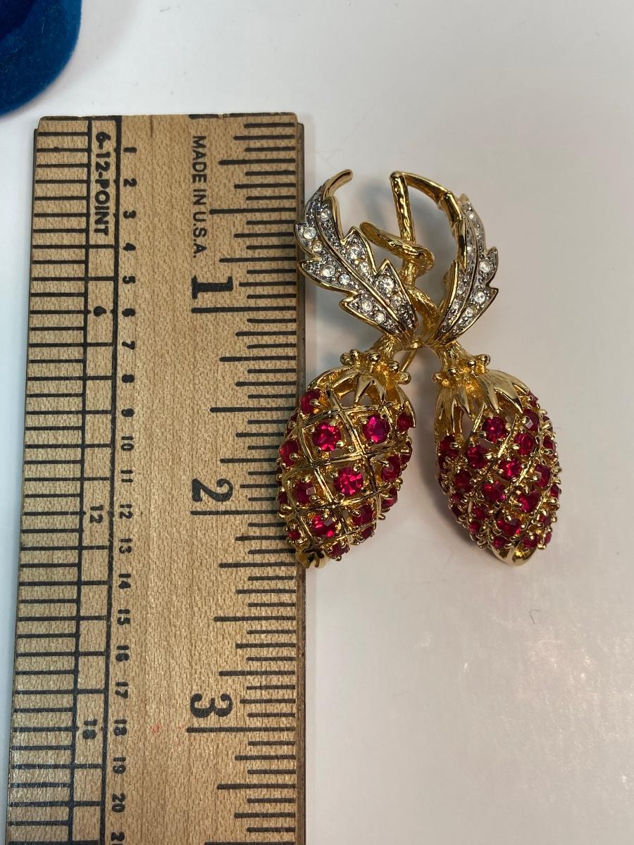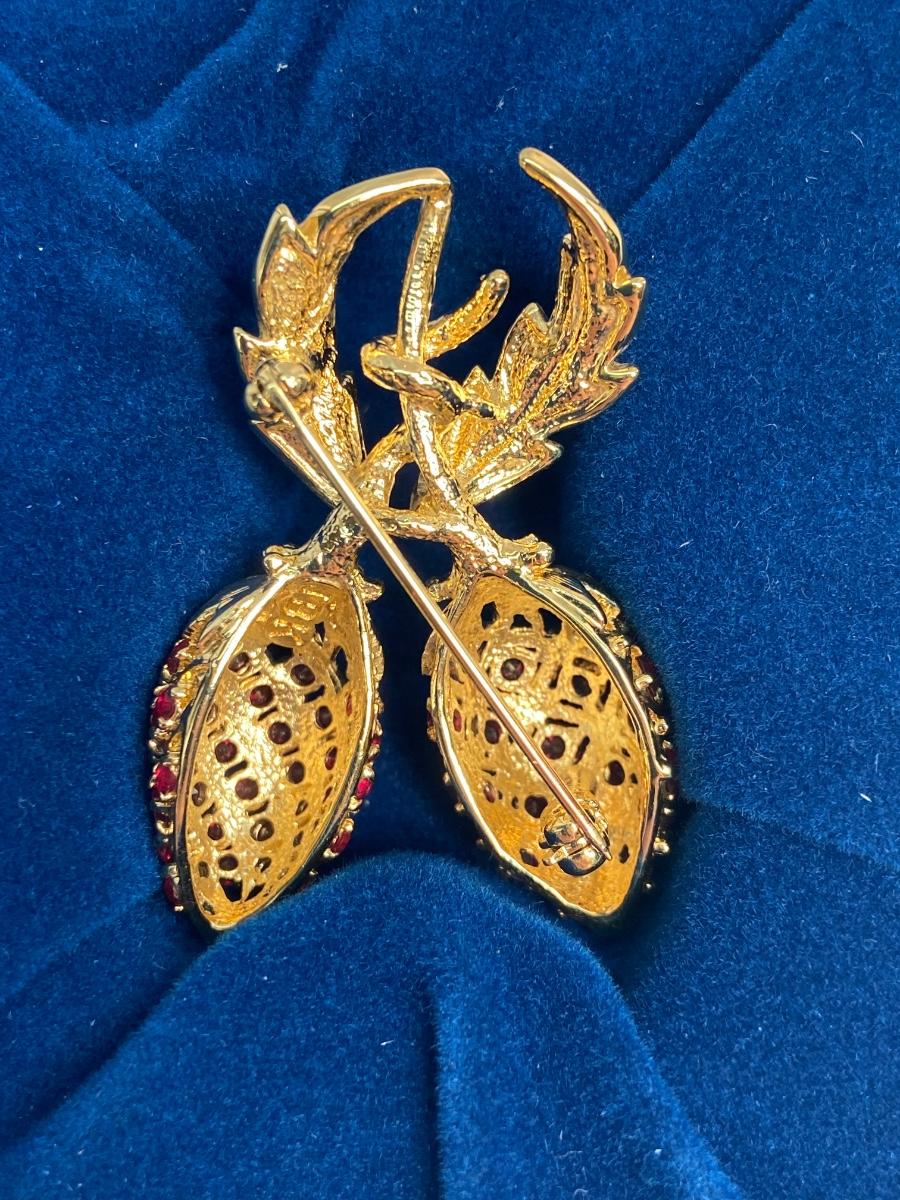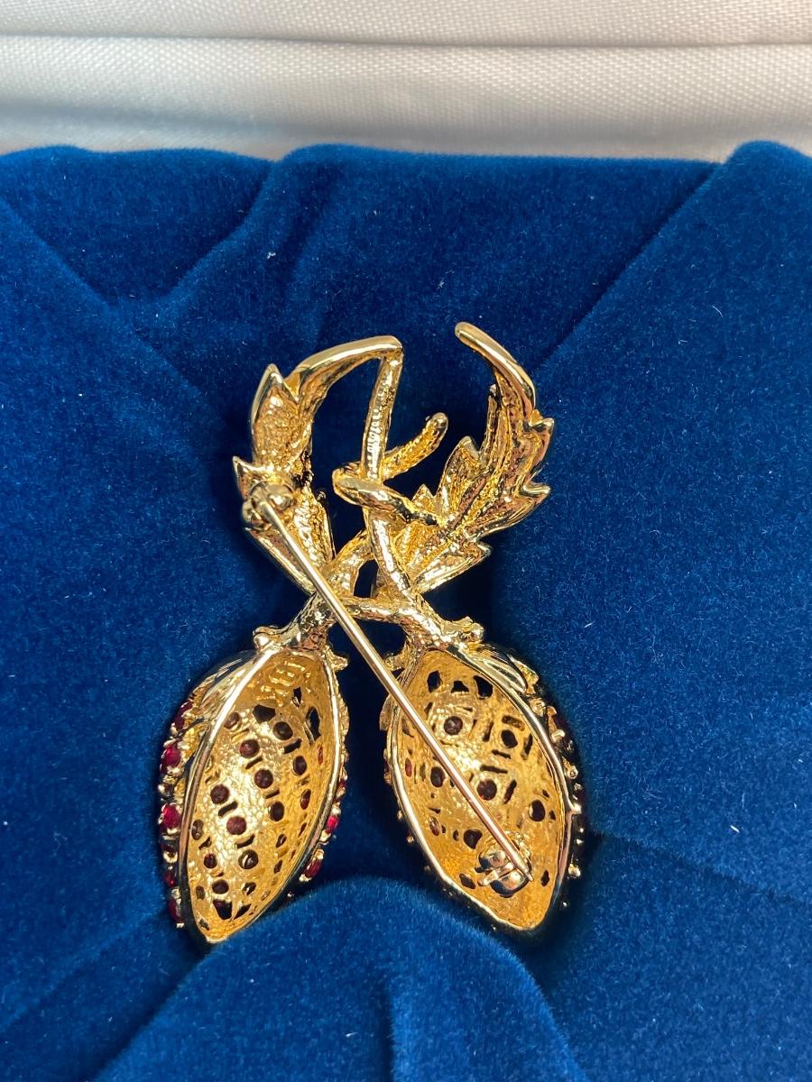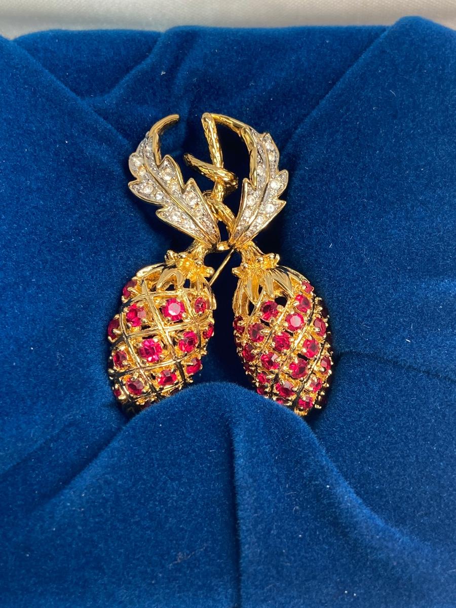 CAMROSE & KROSS is the only manufacturer authorized to create replicas of the iconic Jackie Kennedy jewelry collection. They produced fabulous quality pieces that are easily mistaken for the real thing. This particular berry pin is a gorgeous recreation of the pin that former president John F. Kennedy commissioned for  Mrs. Kennedy to represent their two children, John, Jr. and Caroline. This famous brooch is so much prettier in person!