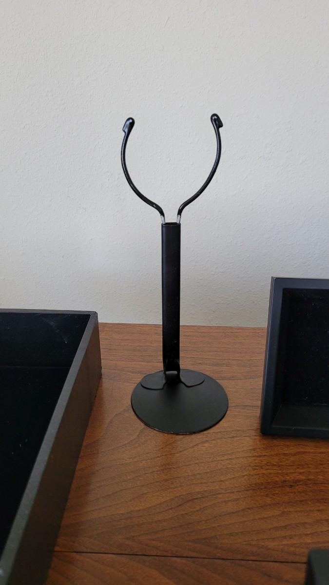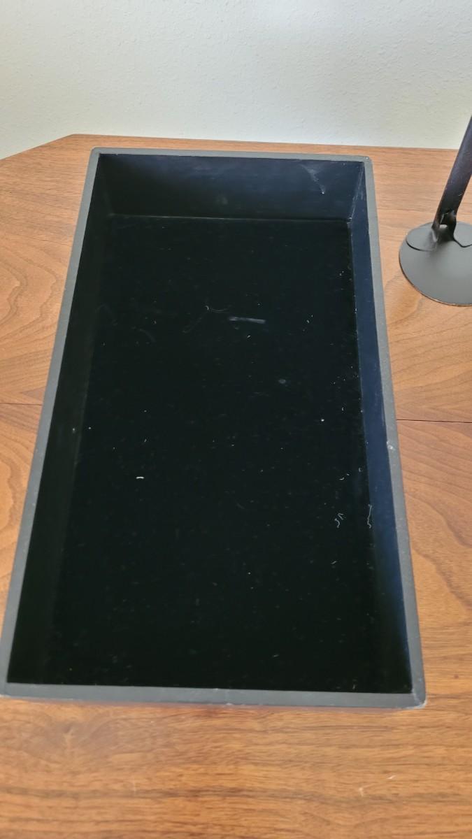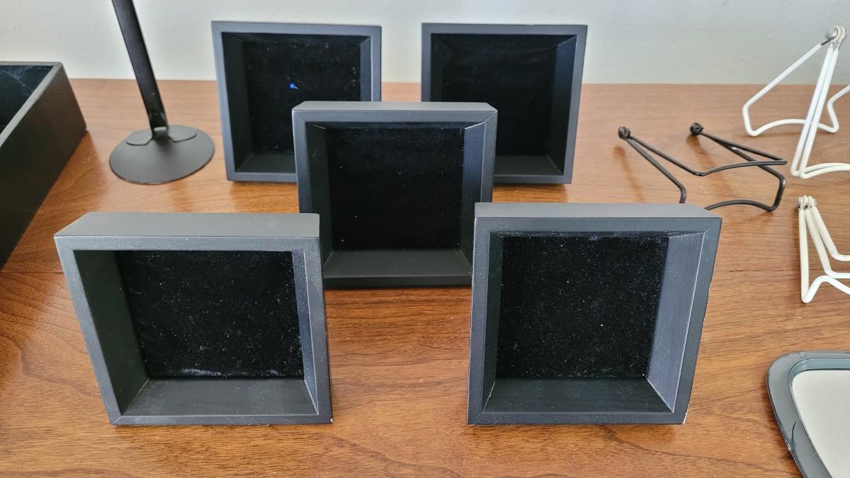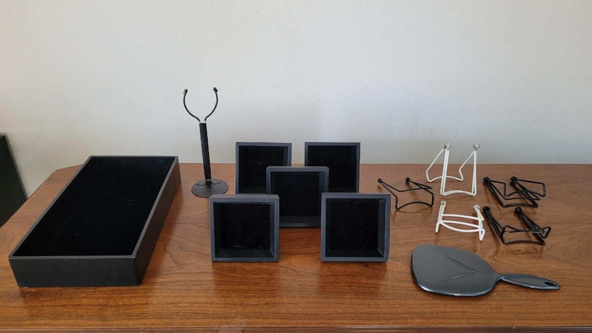 Lot 59: Jewelry Maker/Seller  (5) Black Velvet Padded Display Frames, Black Velvet Bottom Display Box, Stands and a Hand Mirror