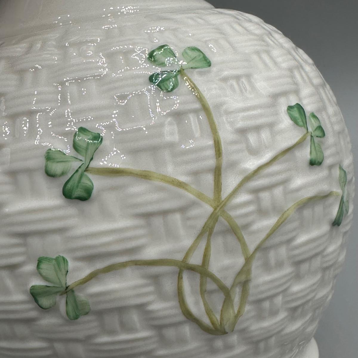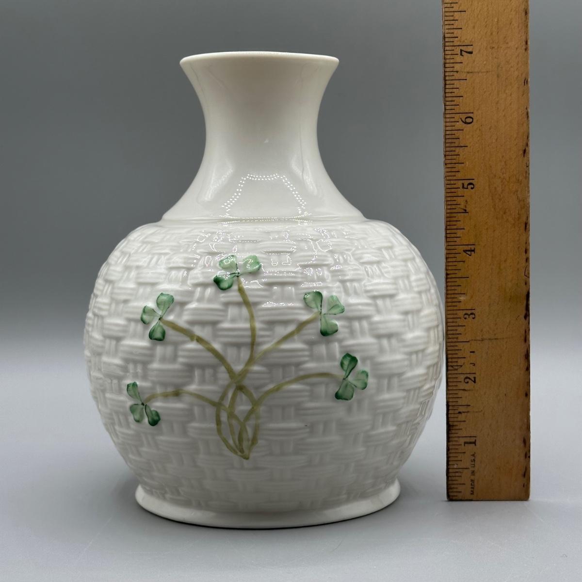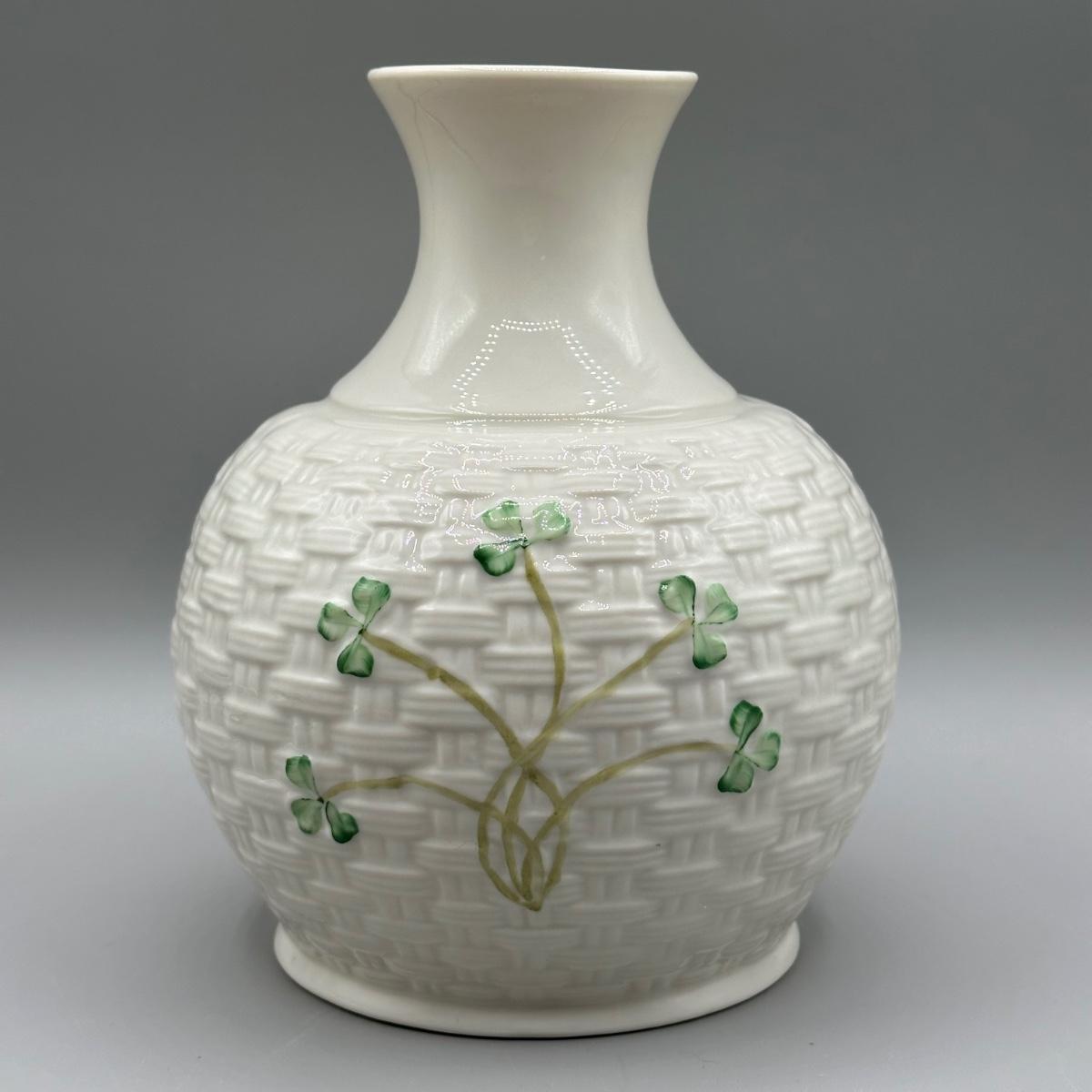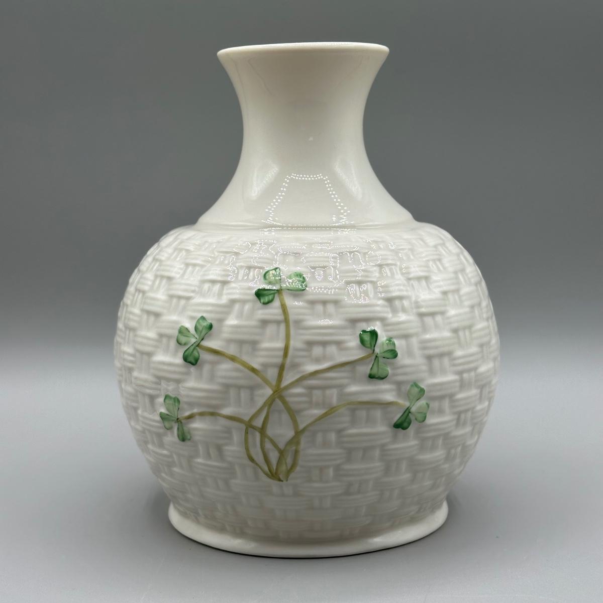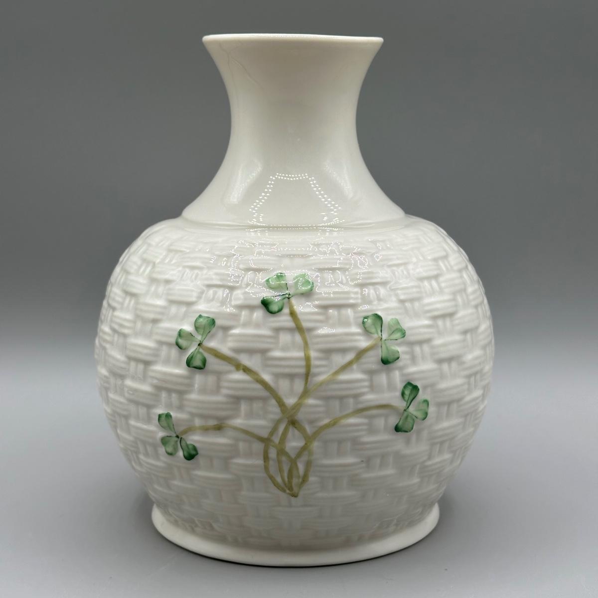 LOT 59: 7” Belleek Porcelain Shamrock Basketweave Vase