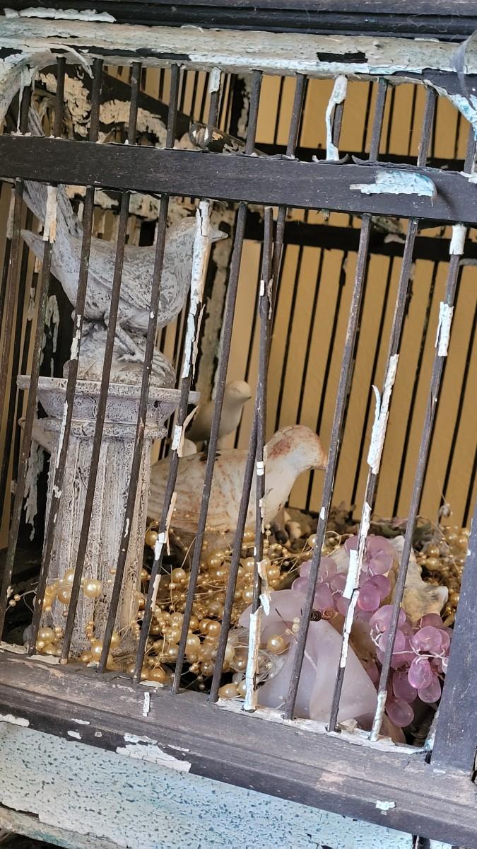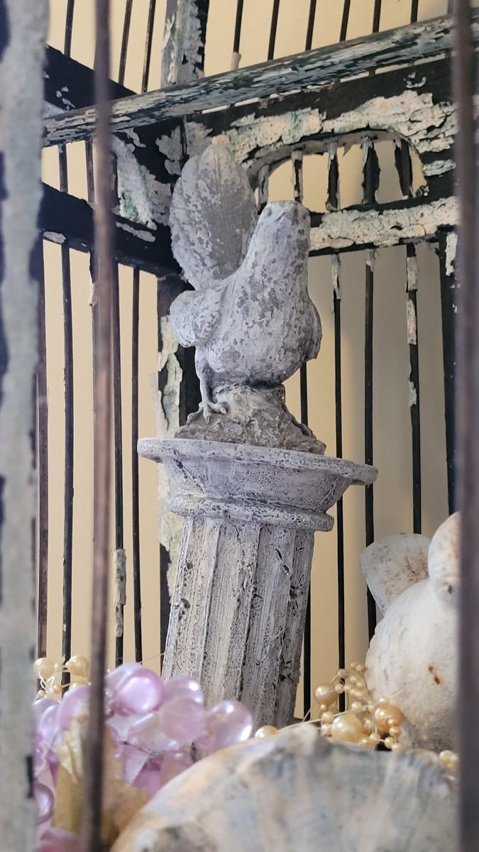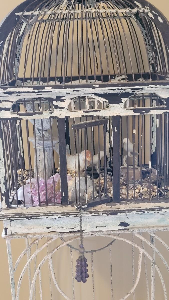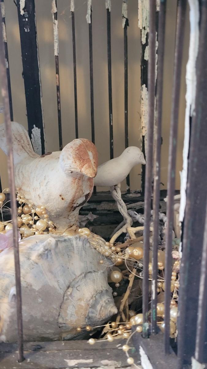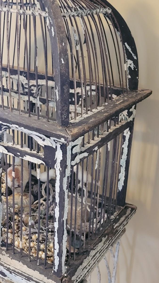Bird cage is filled with cement and metal birds, beads and shells. The bottom on the Birdcage is coming out and needs to be reattached. The cage had flaky black and white paint.