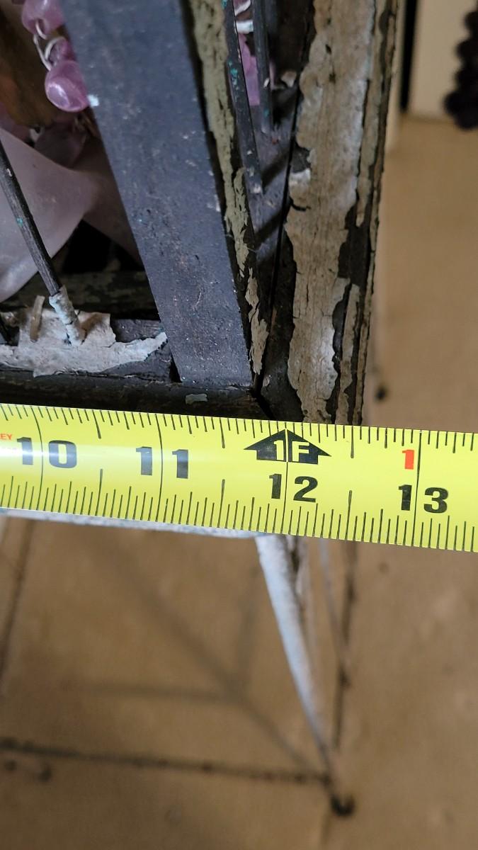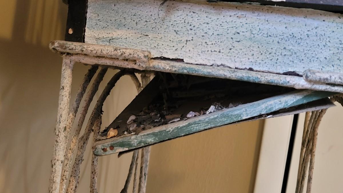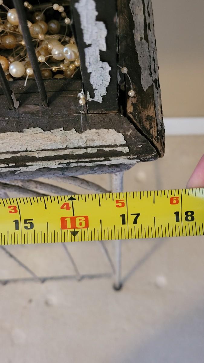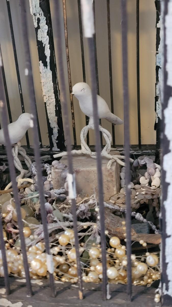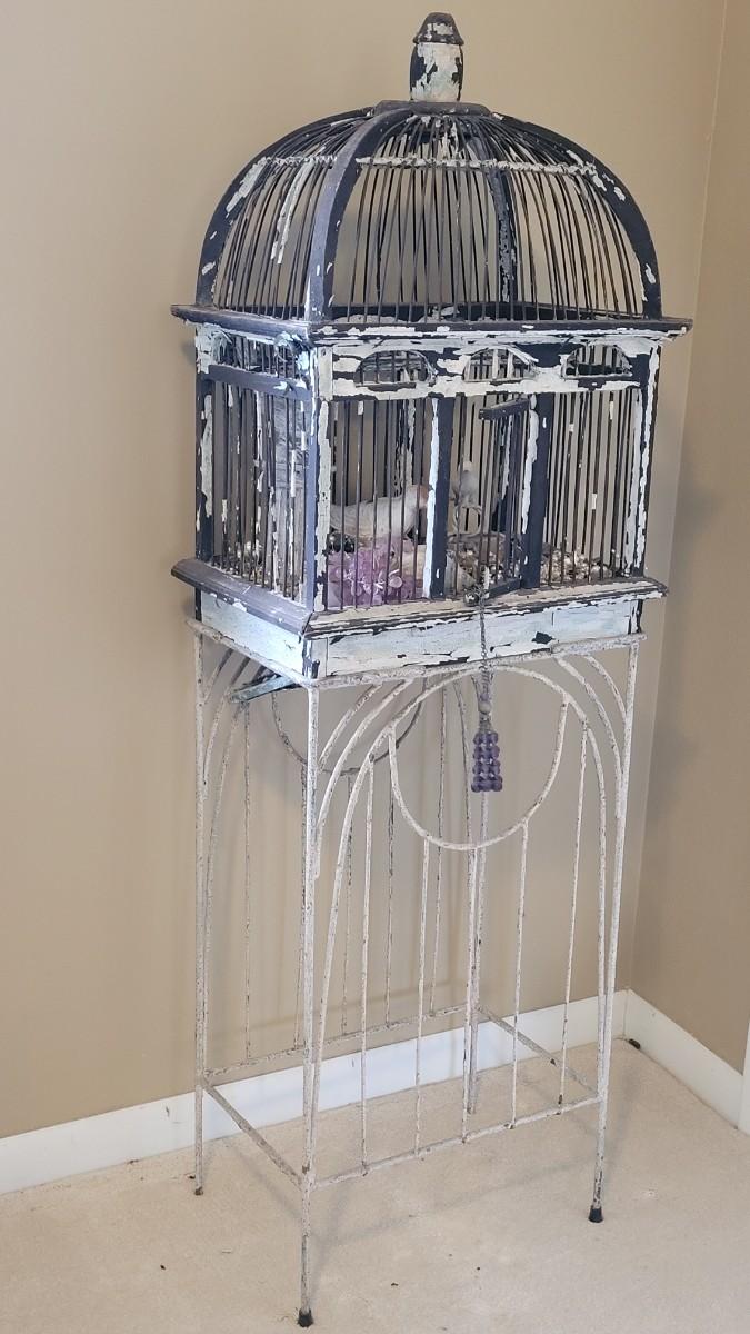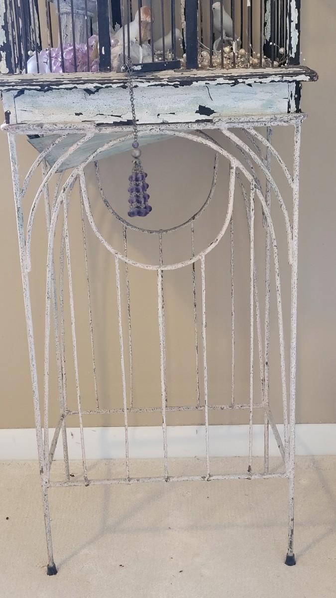 Bird cage is filled with cement and metal birds, beads and shells. The bottom on the Birdcage is coming out and needs to be reattached. The cage had flaky black and white paint.