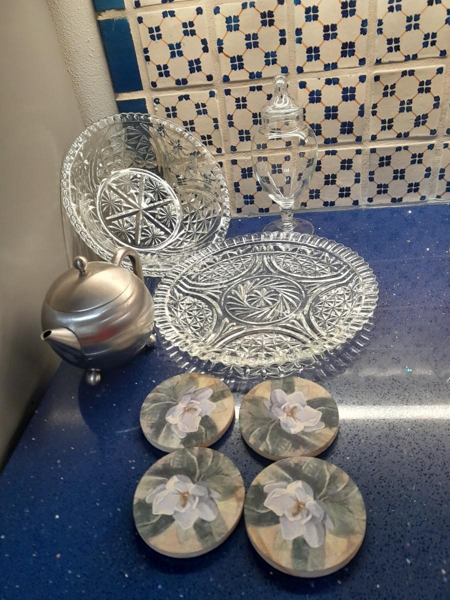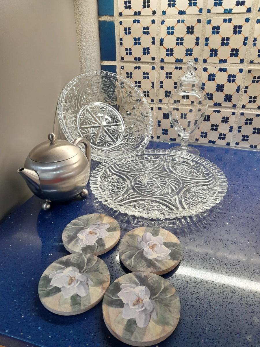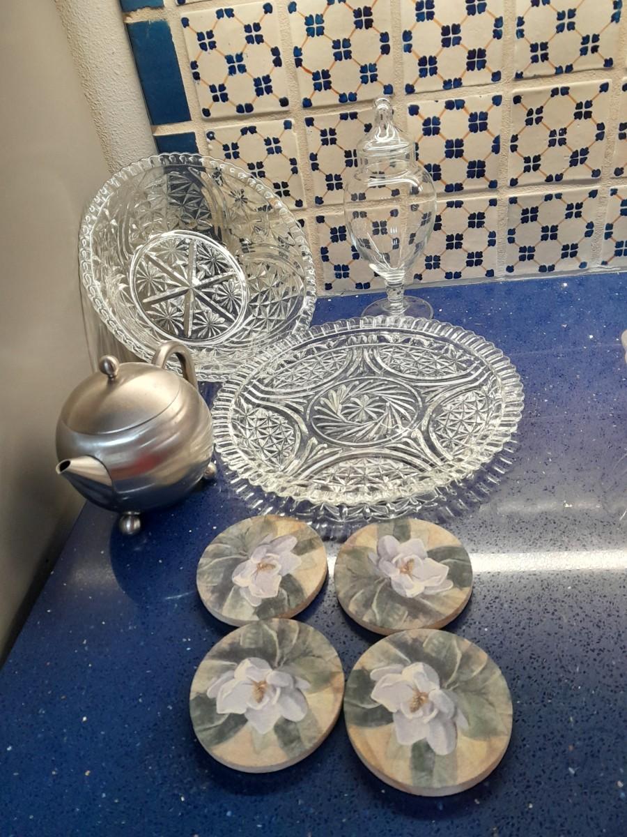KITCHEN GLASSWARE, TEA POT, COASTERS AND MORE