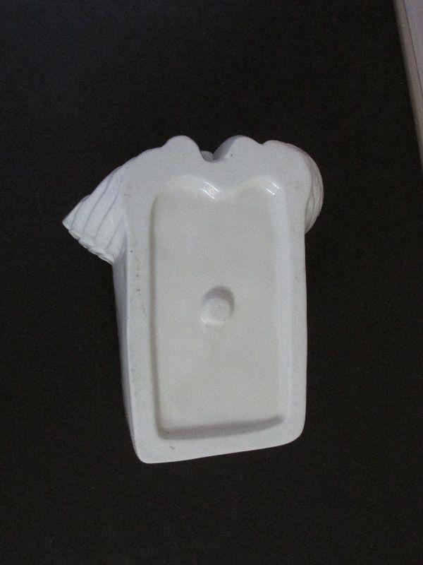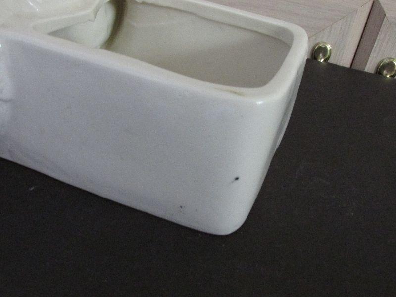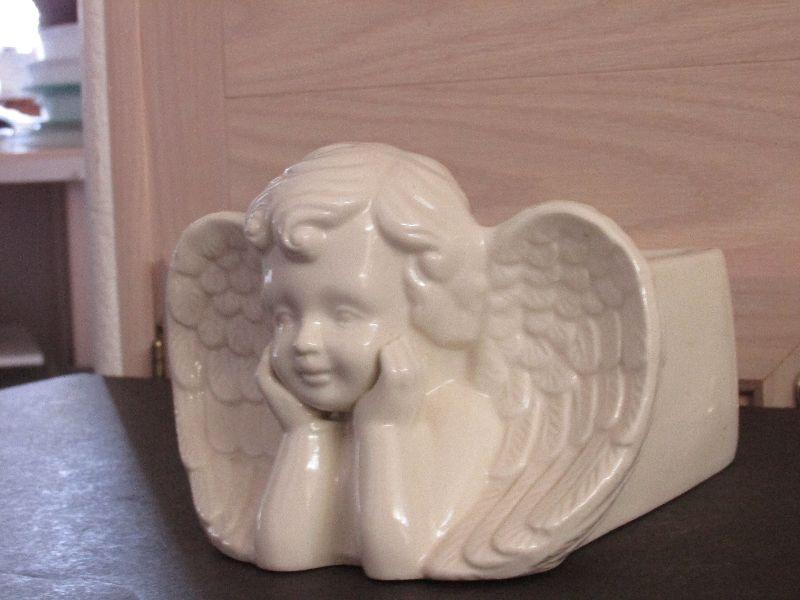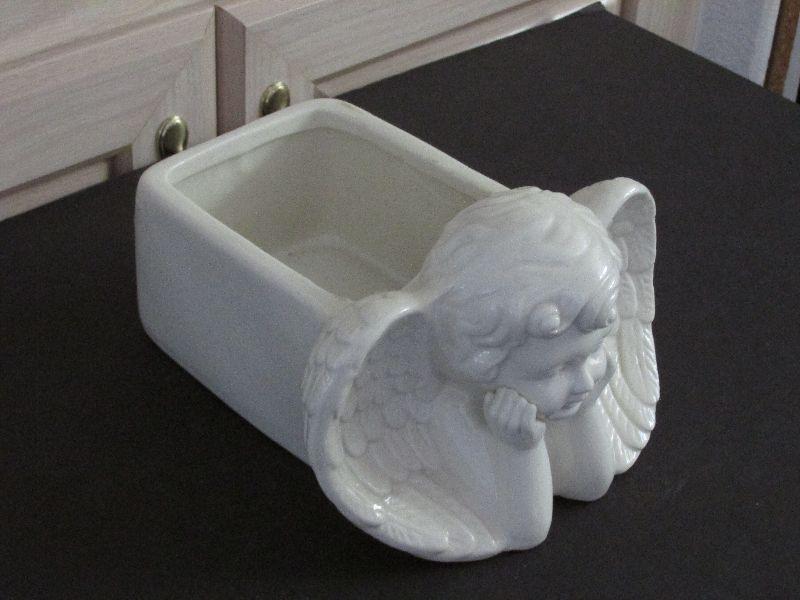 Vintage white cherub ceramic planter. Has small chip on inner rim shown in photo. Also has two black marks on the back left shown in photo.
