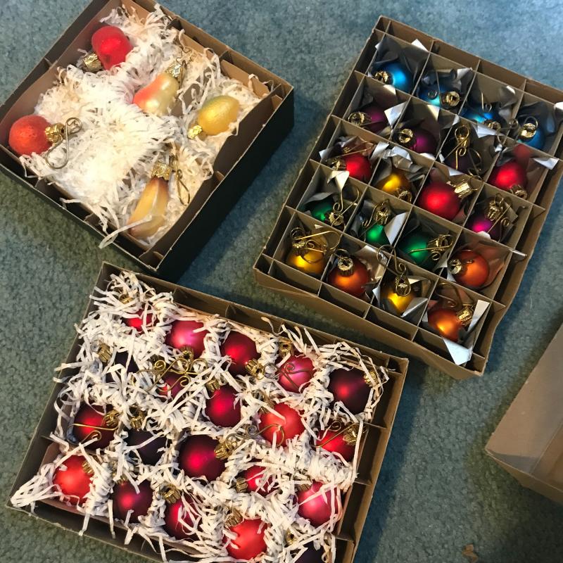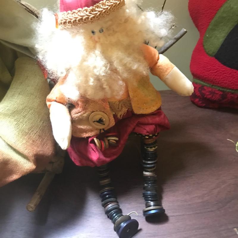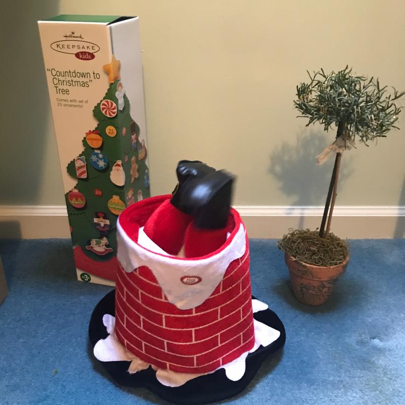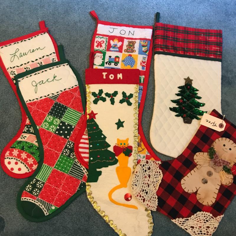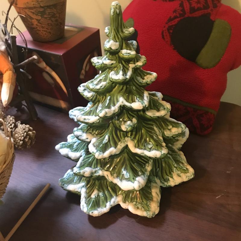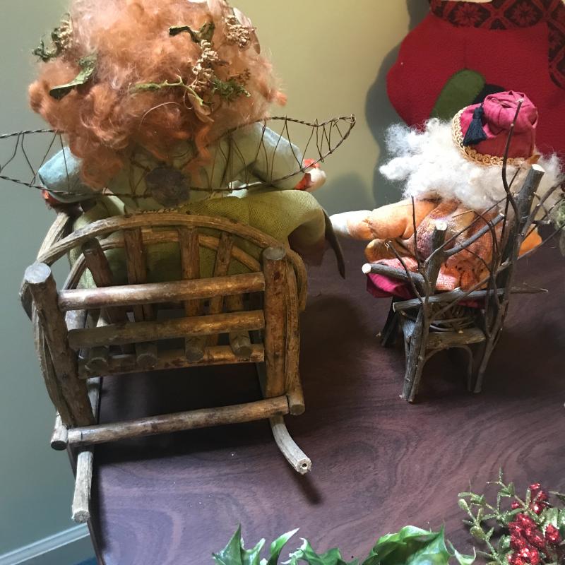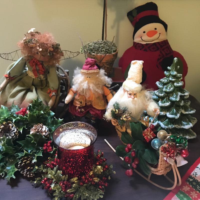 Adorable handmade angel and Santa sitting in wooden chairs, Handmade ceramic Christmas tree (10”d x 11”h), new-in-box kids countdown to Christmas fabric tree and ornaments, singing Santa in hat, small Smith & Hawkins ornaments in box, four tablecloths, assortment of stockings and more. Fun lot! No shipping.