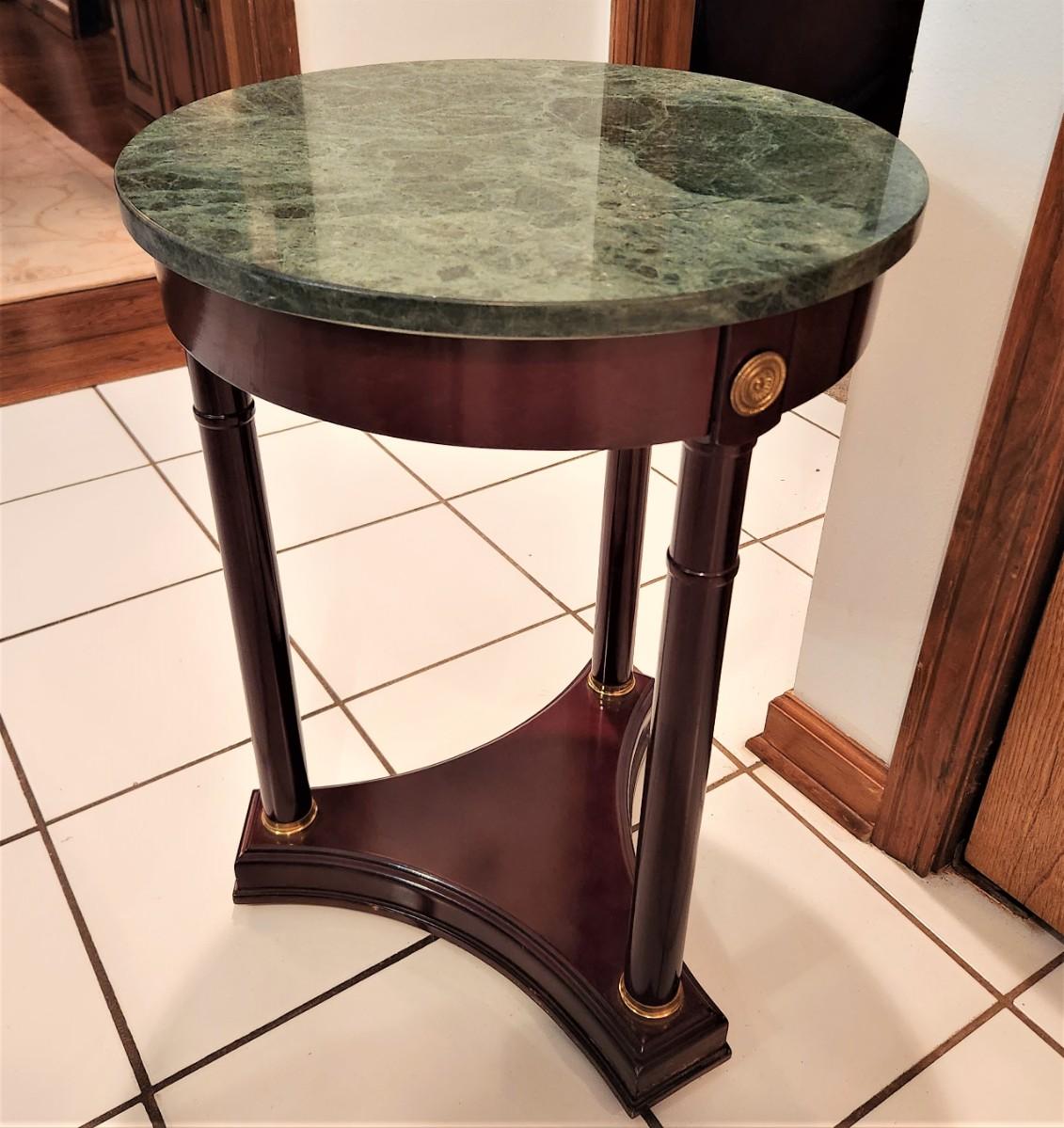 Three-legged contemporary side/lamp table with faux marble top. Gold tone accents. Only gently used. 18" across/ 25" tall.