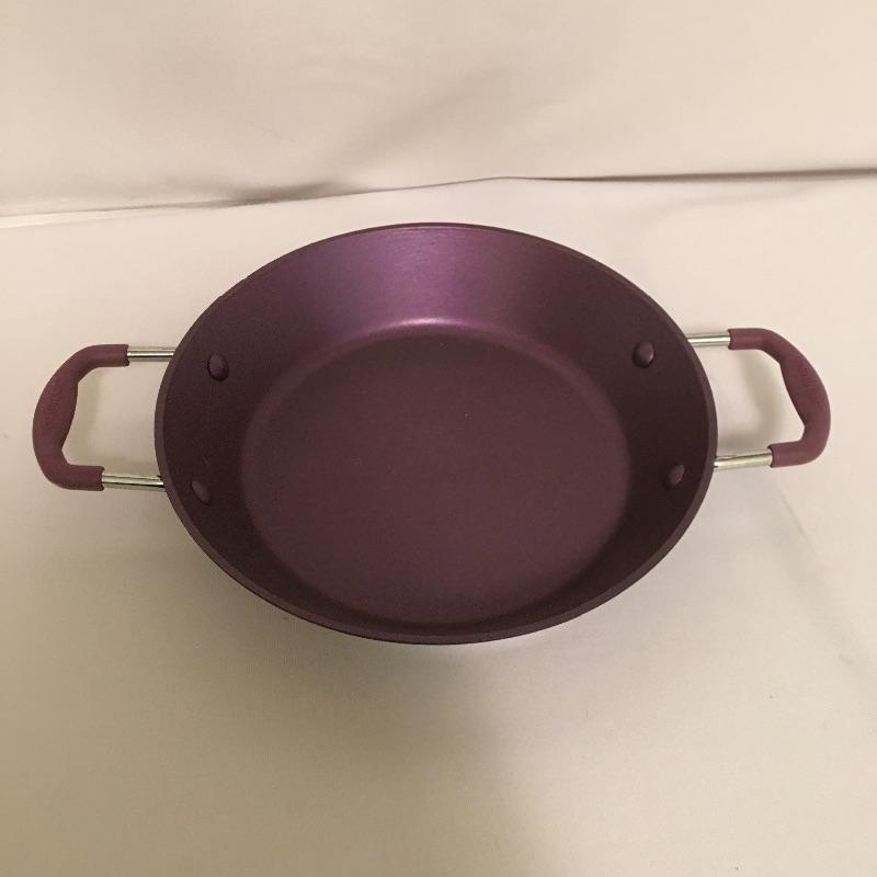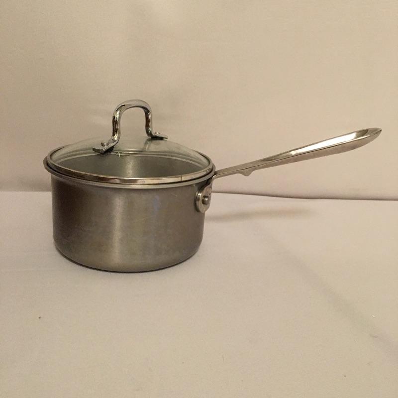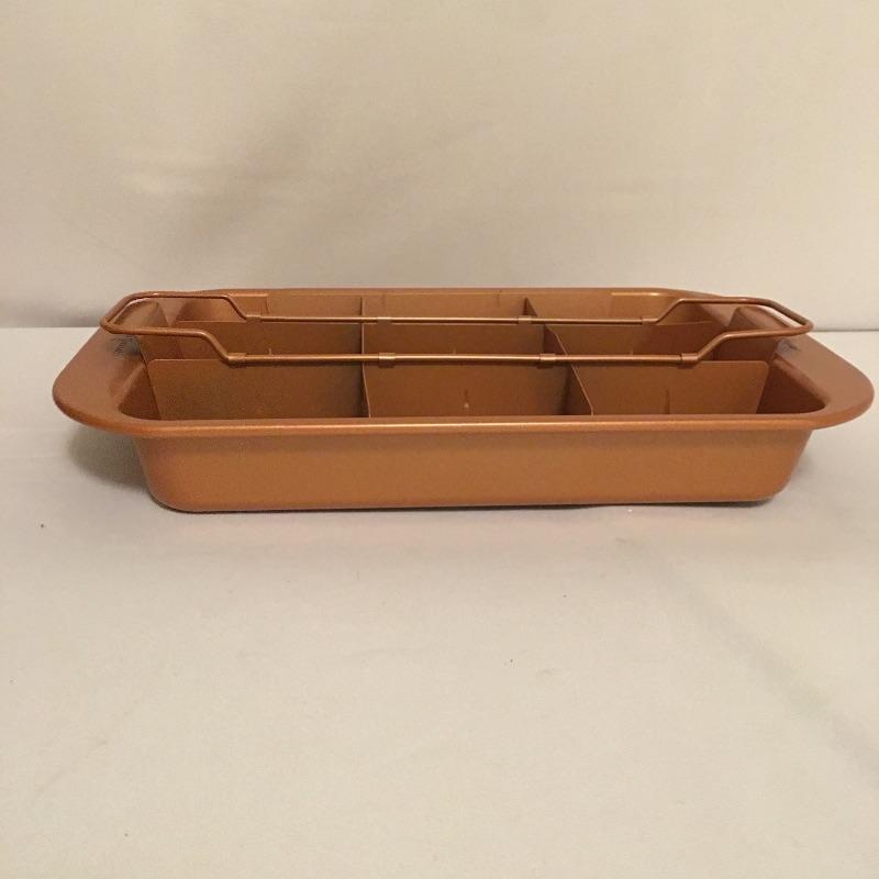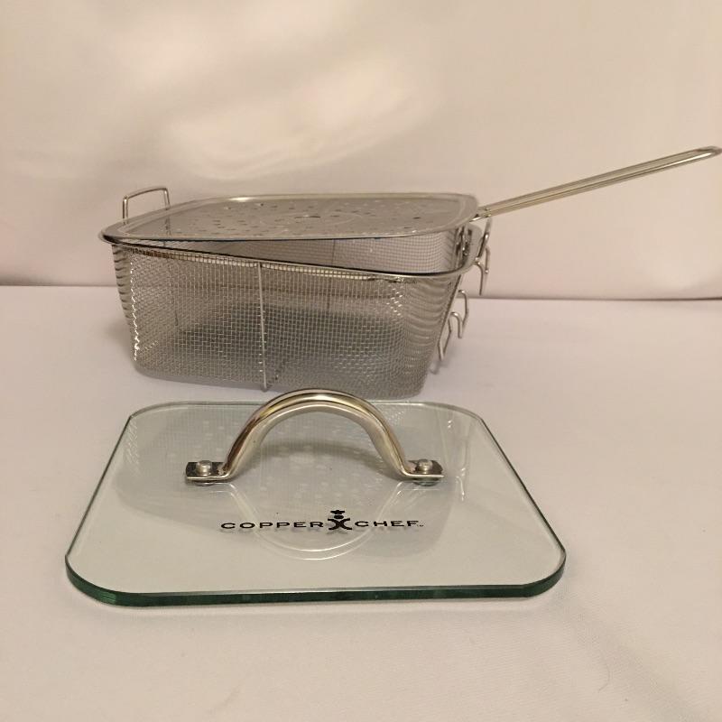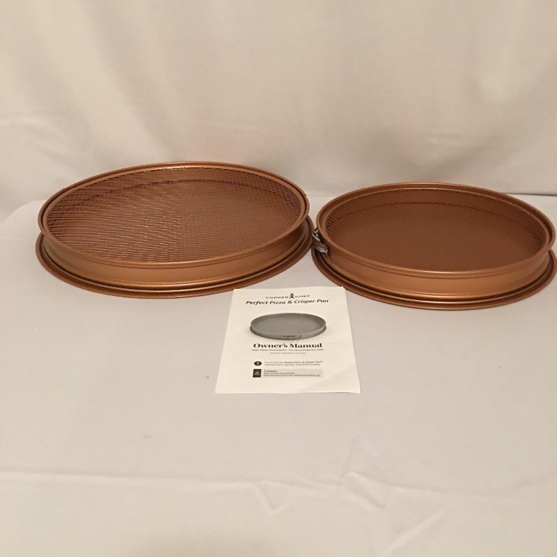 Copper Chef cookware includes three pots with two lids, baking pan with divider, two pizza and crisper pans, frying basket and an All Clad pot with top and Technique pan. Largest pizza pan measures 16”D. Superb assortment for the discerning chefs out there.