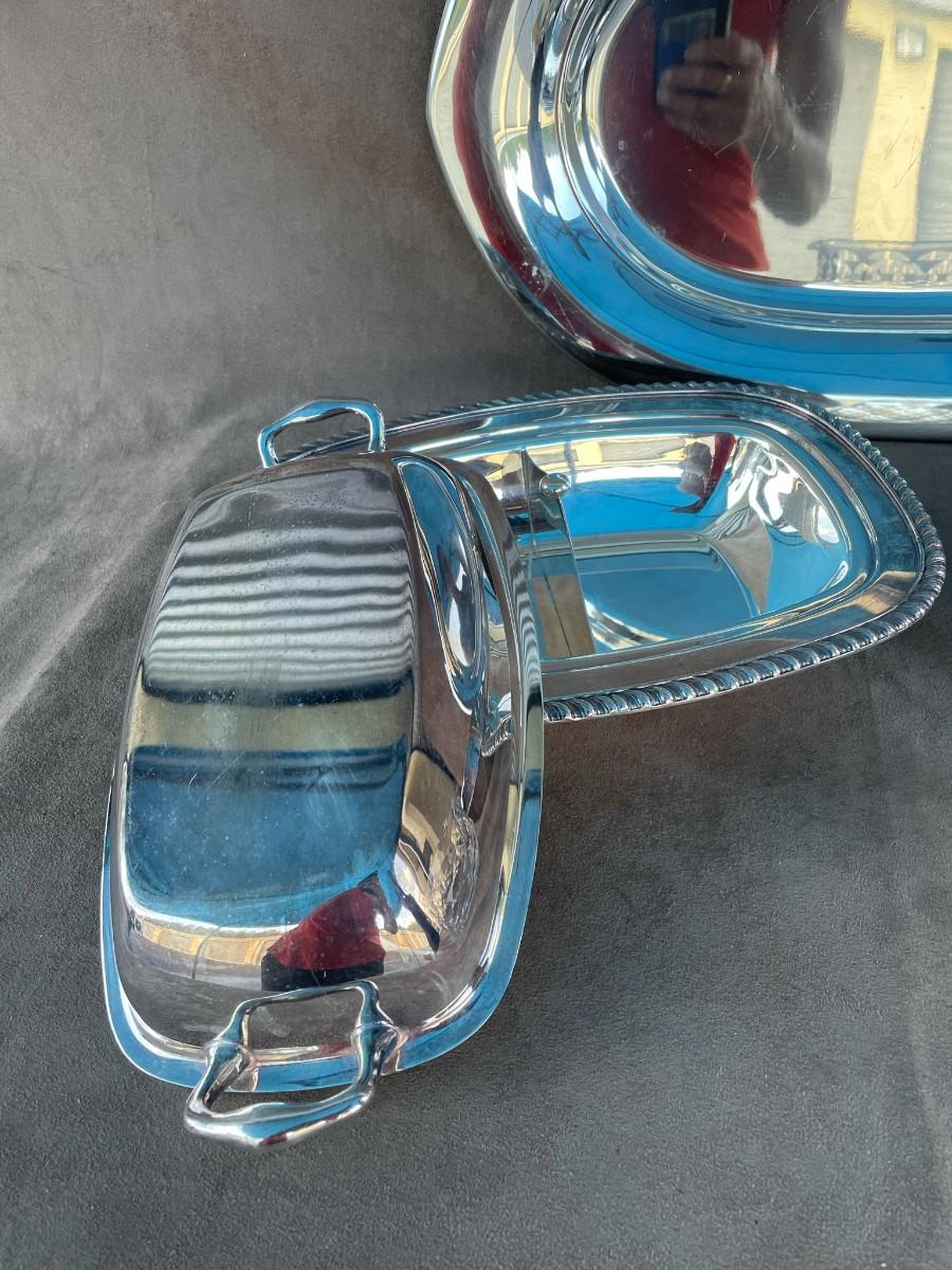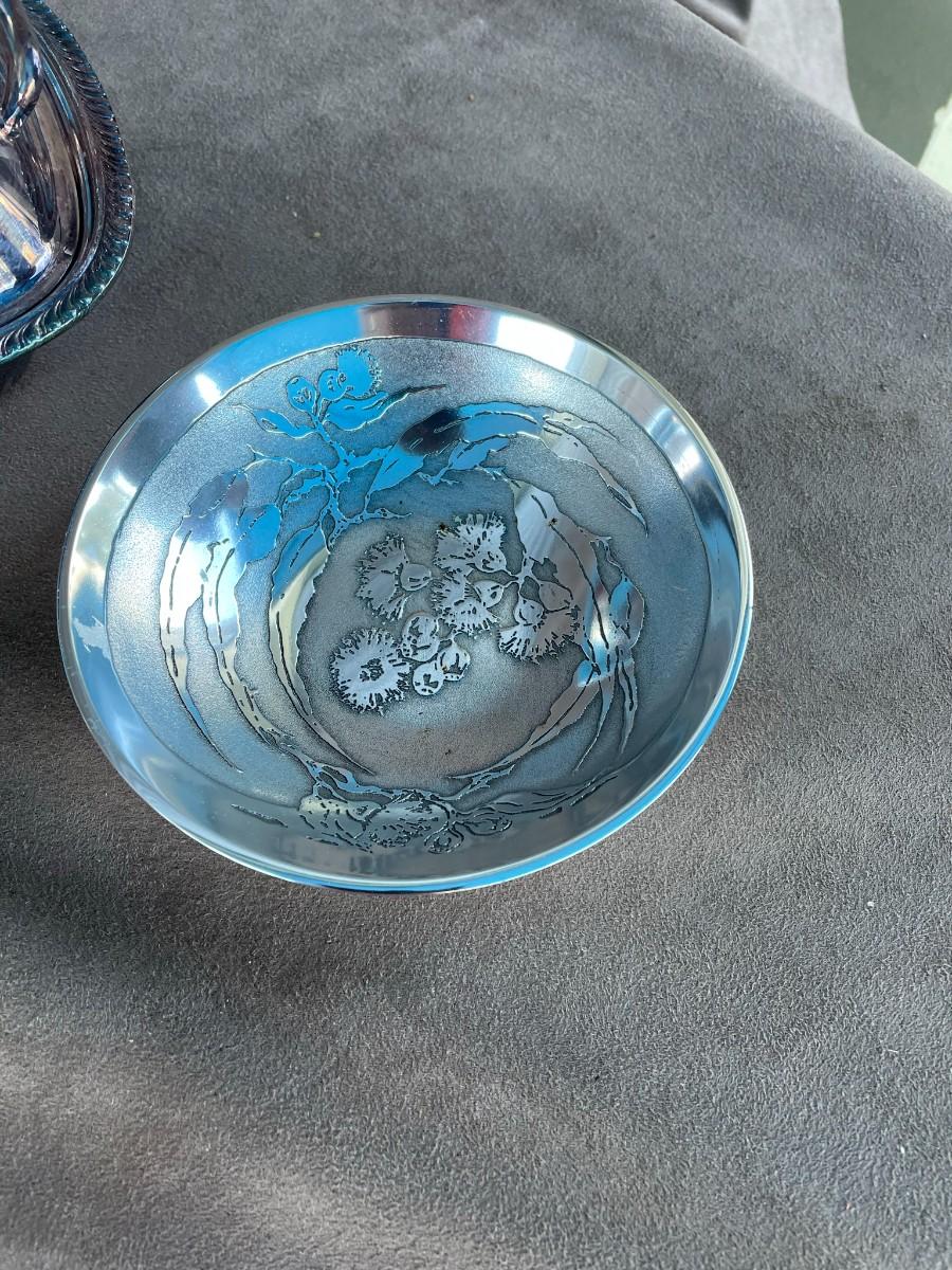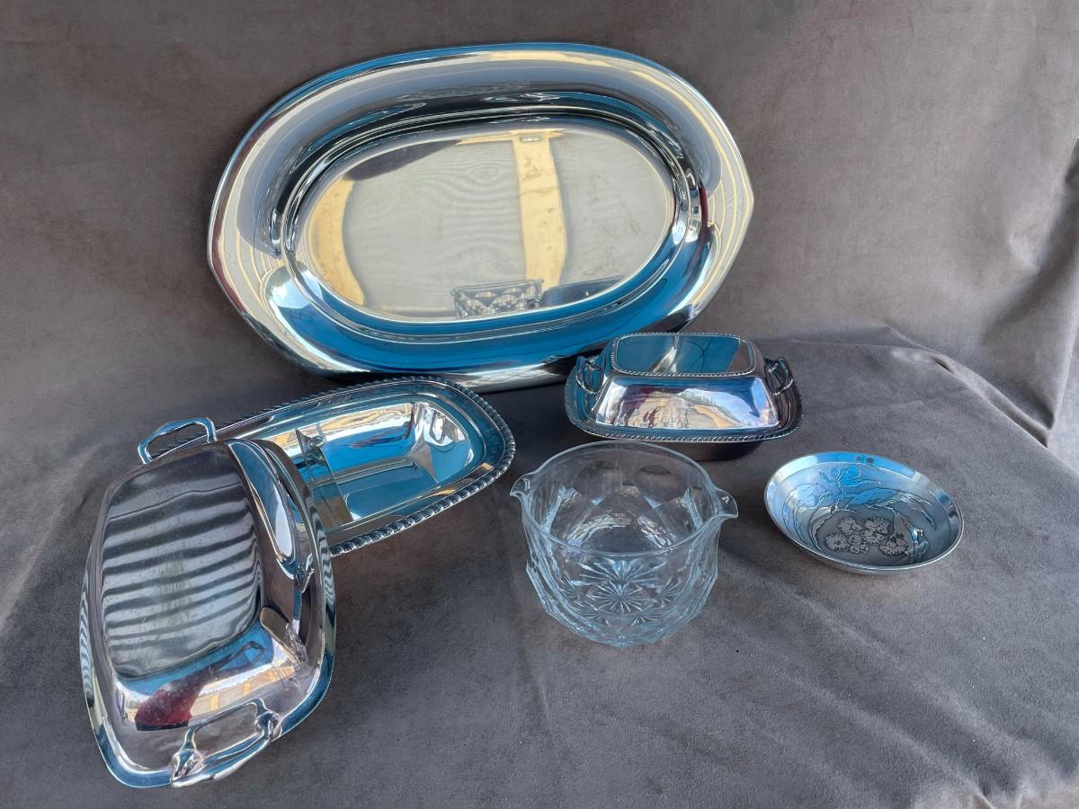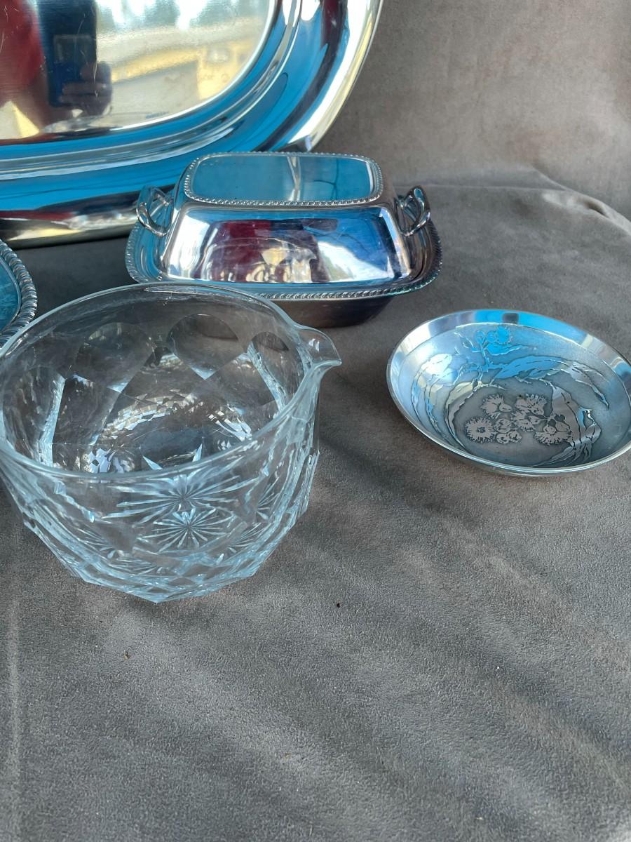 Genuine Don Sheil Etched Floral Aluminum Bowl, 4 pieces of silver-plate serving pieces, including two covered vegetable bowls and a patter, and an antique spouted crystal bowl.