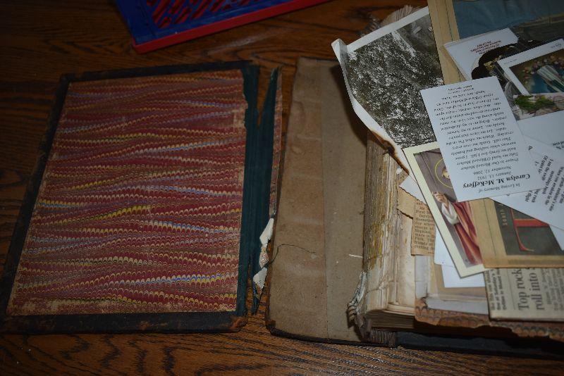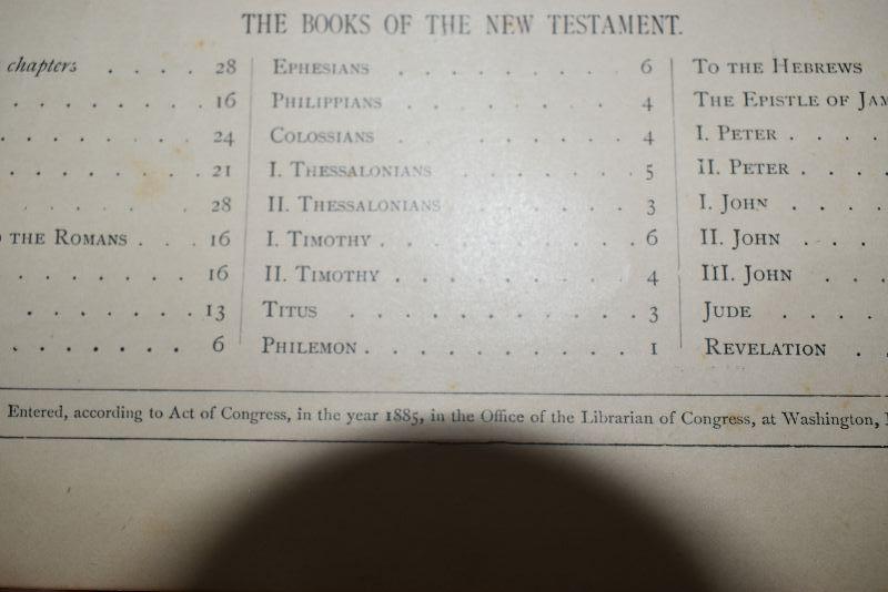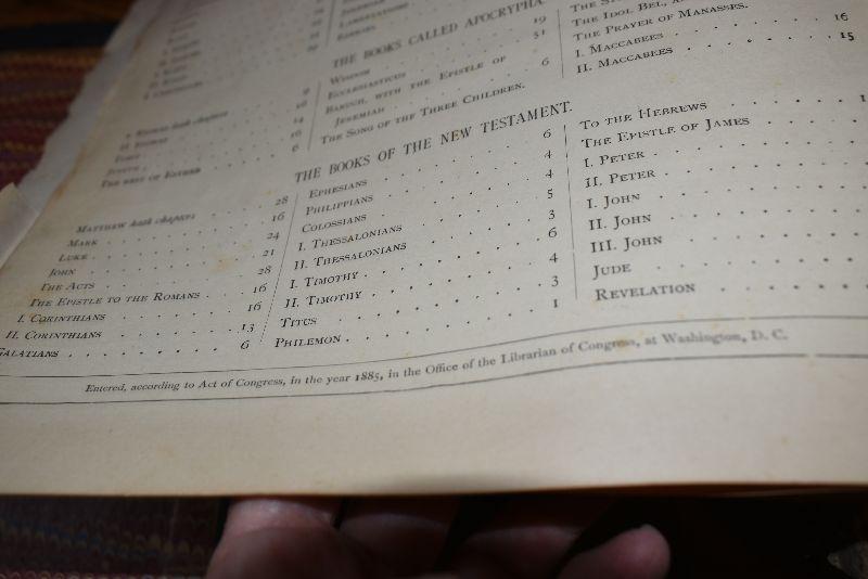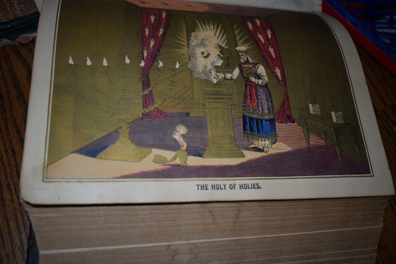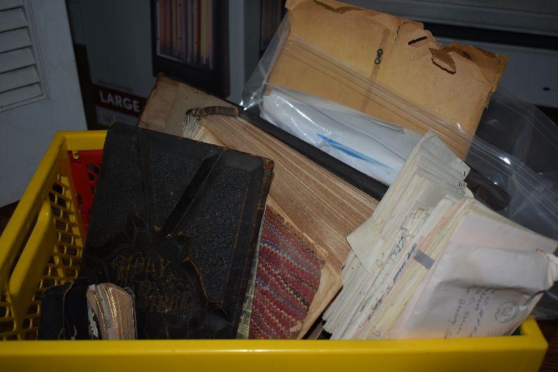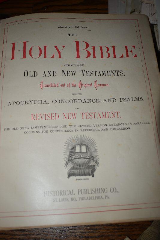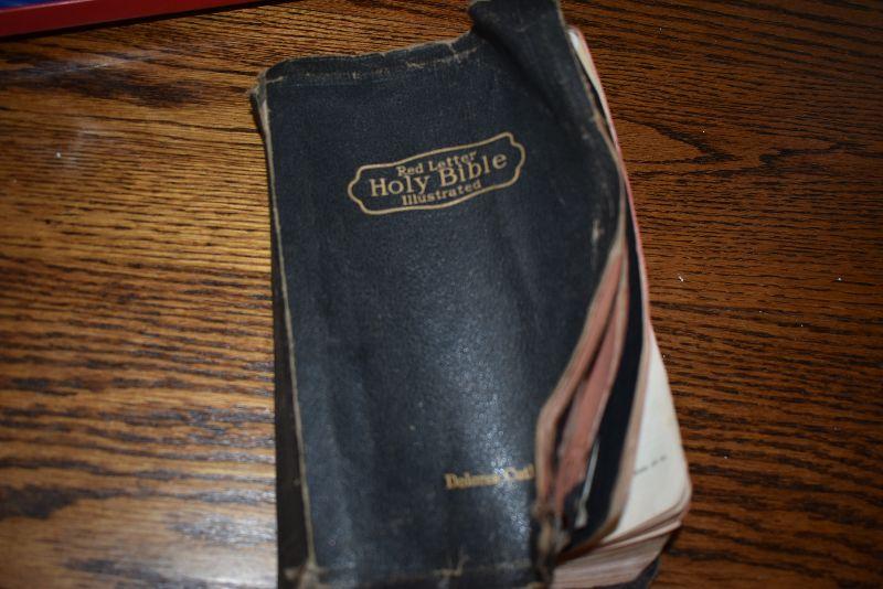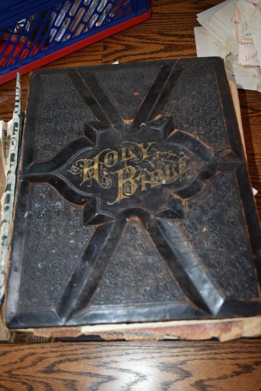 Antique bible from 1885, the front cover has come off, but the interior is in good condition and has beautiful color illustrations, letters sent during WWII, and more. Crate not included. Located on second floor.