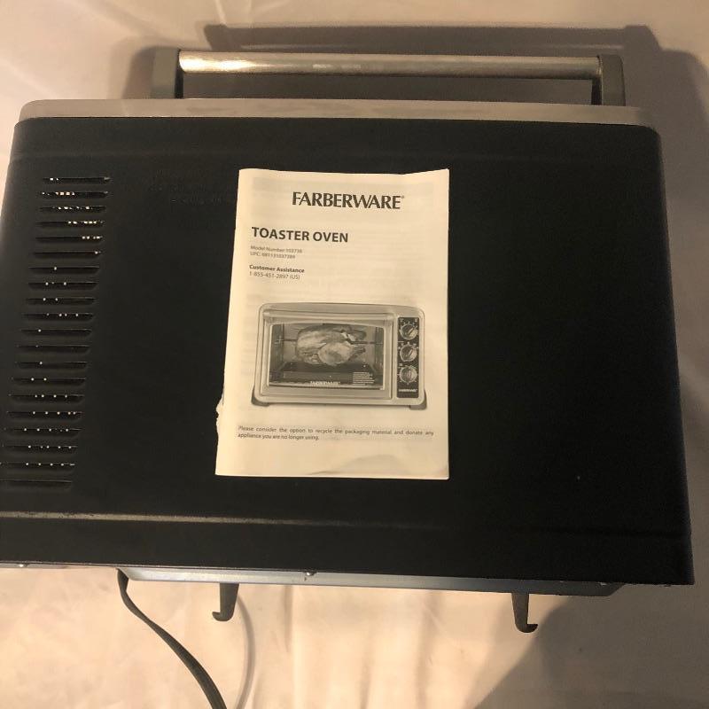 Toaster Oven (Model Number: 103738) in great condition. Included are two wire racks and one roasting pan. The entire oven measures 16.5” x 14” x 12”. Rotisserie wand pictured on manual is not included. Oven turned on when tested.