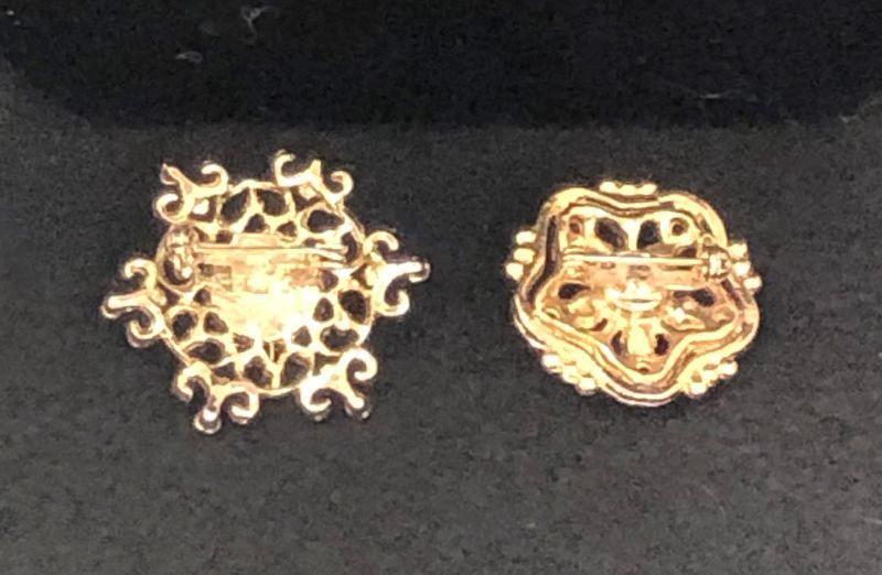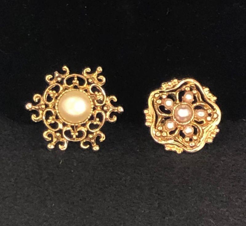 The faux pearls are whiter than what they appear in the pictures. Both of these pieces are in excellent condition and measure just over 1" and just about 1.5". Neither is marked.