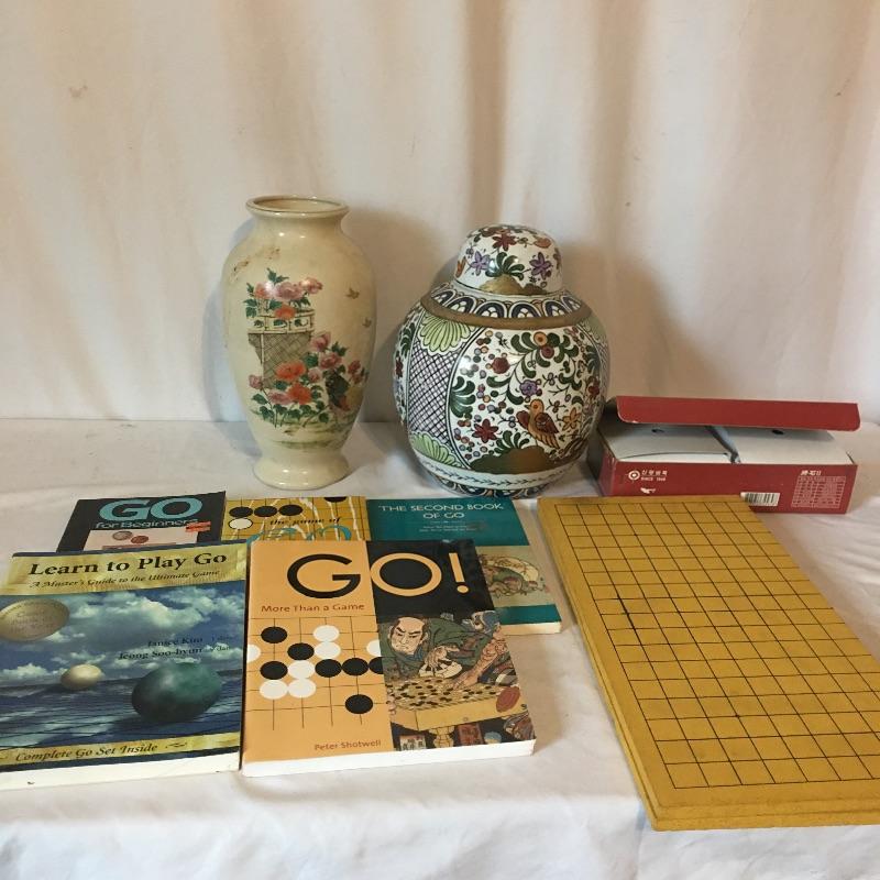 Have some fun with this Go Game and more! Lot includes Go game board and stones, instructional books on Go with aN Asian vase and ginger jar.