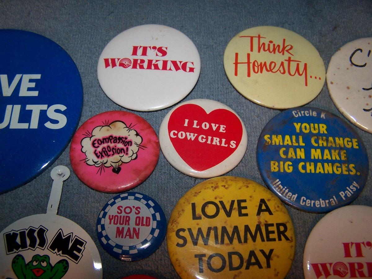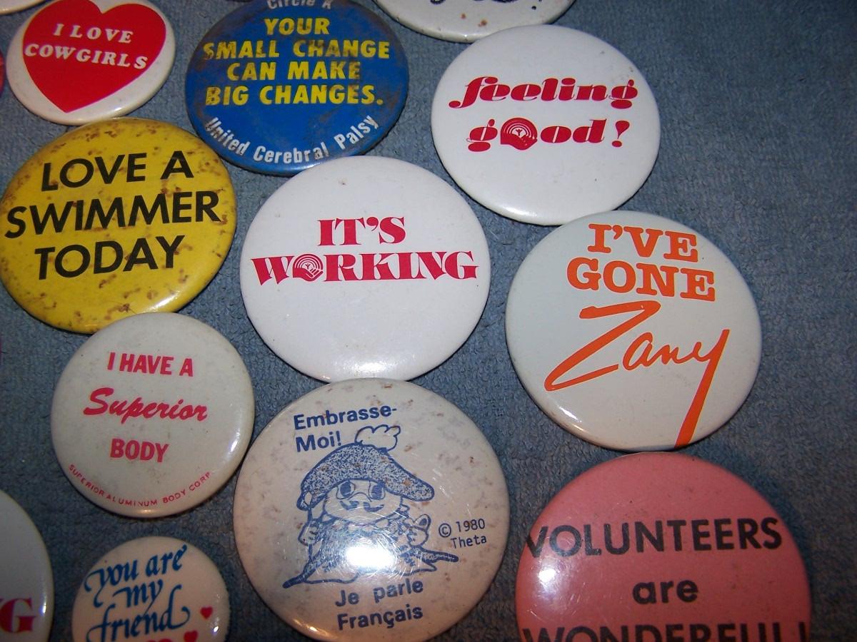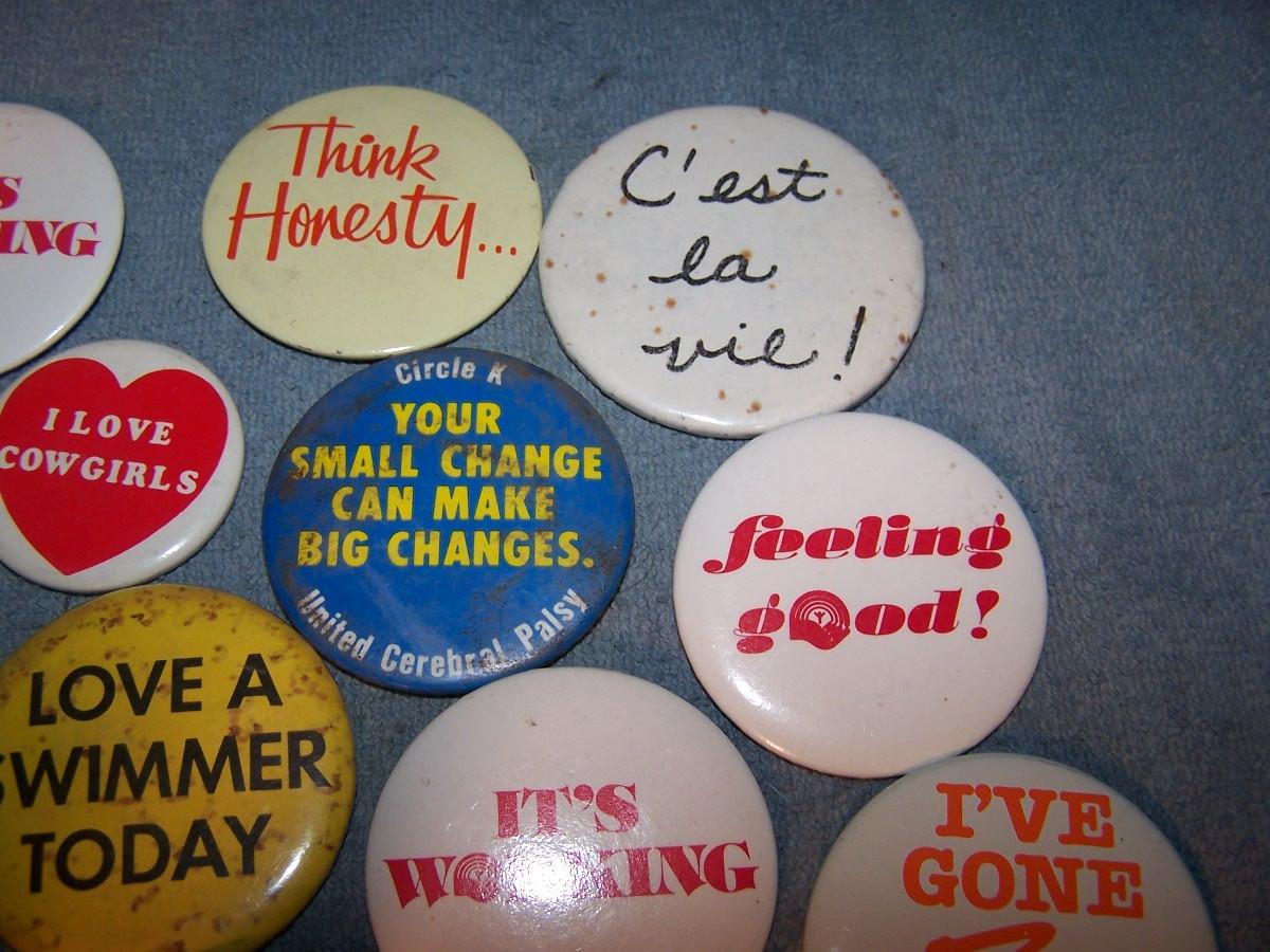 GREAT COLLECTION OF PINS/PINBACKS---SAYINGS.. SOME SPOTS AND LIGHT WEAR...