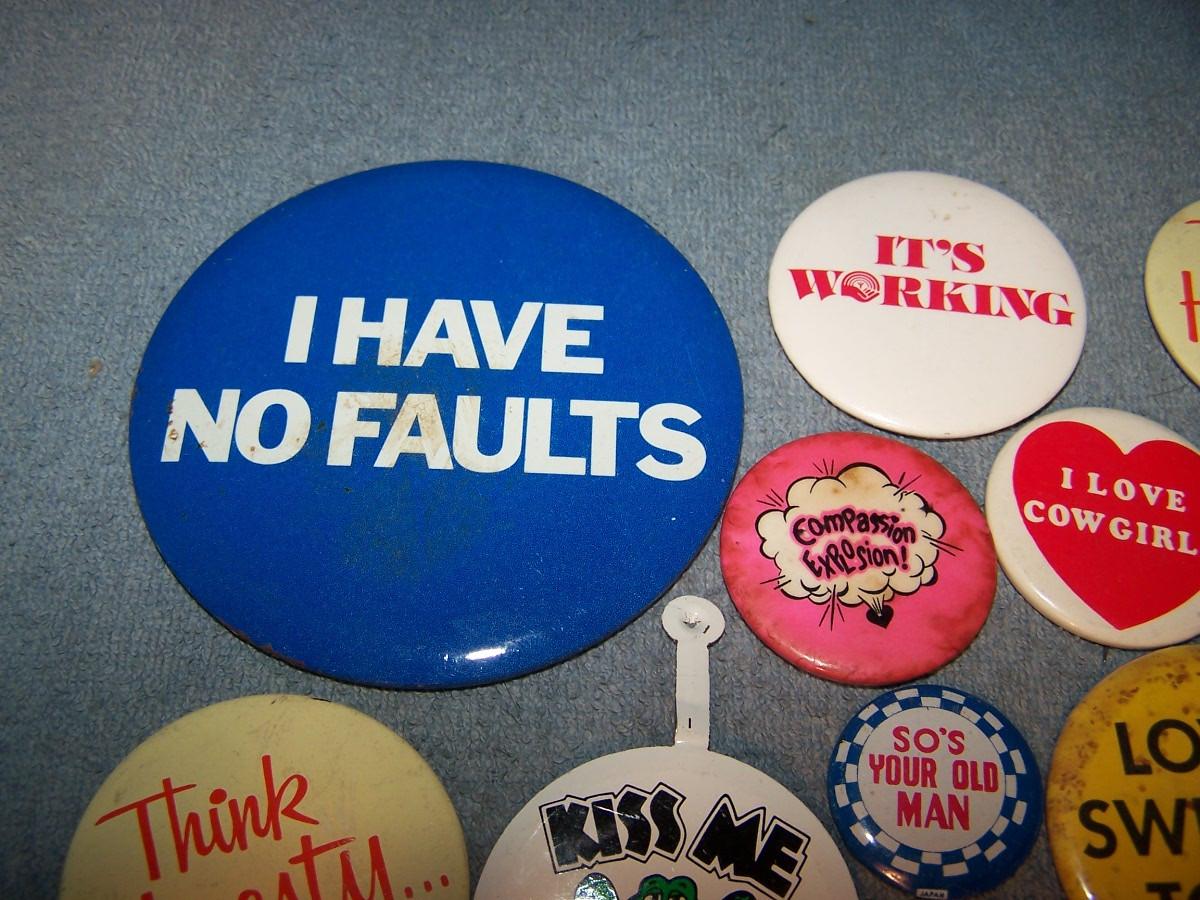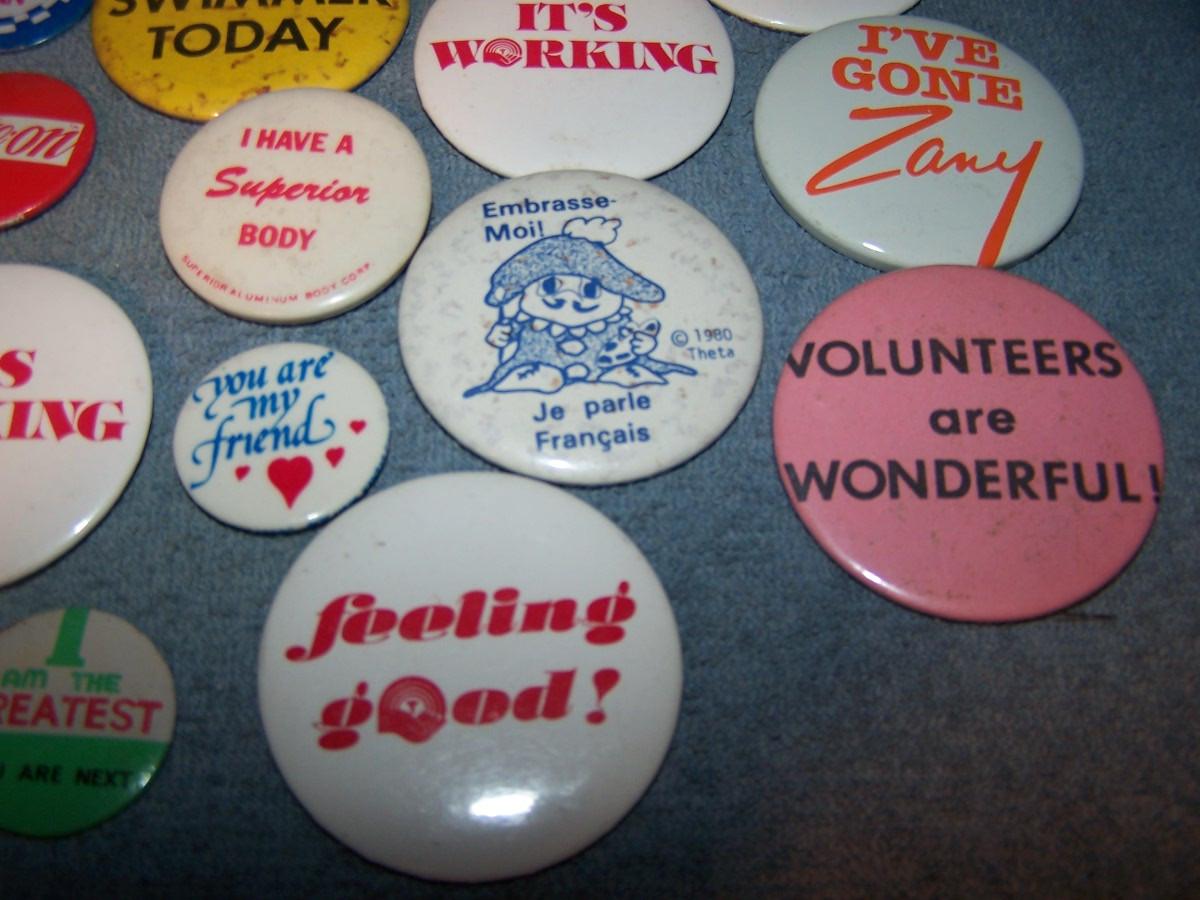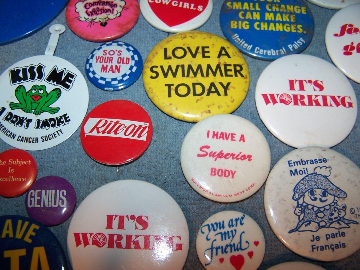 GREAT COLLECTION OF PINS/PINBACKS---SAYINGS.. SOME SPOTS AND LIGHT WEAR...