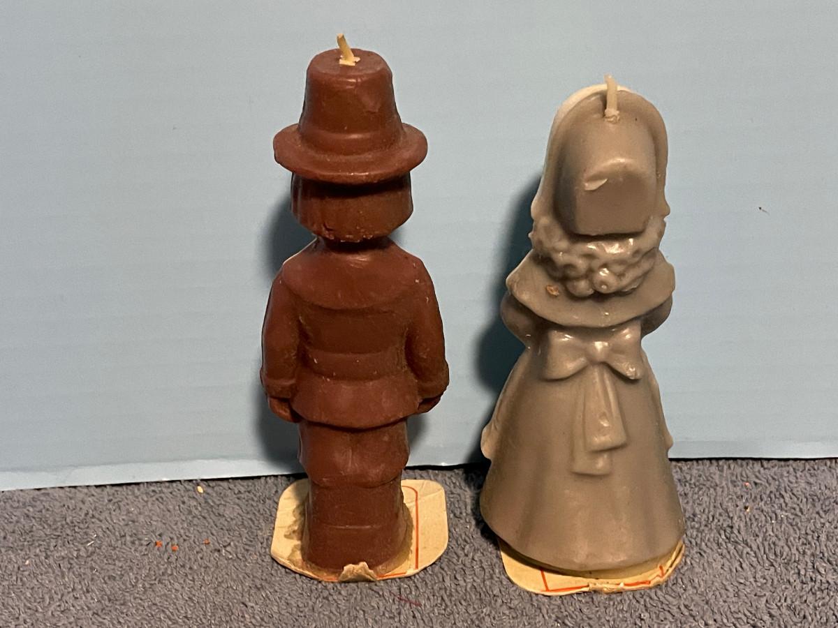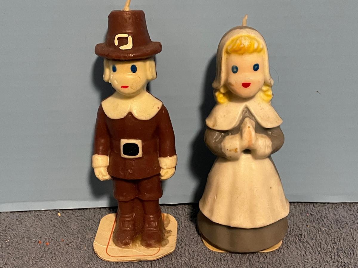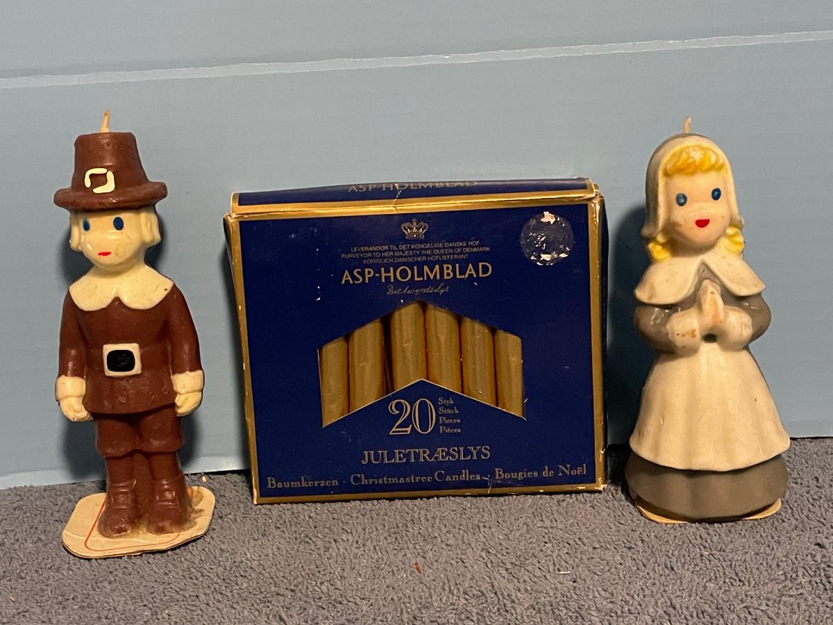 THESE ARE GREAT VINTAGE MCM THANKSGIVING & GOLD CHRISTMAS CANDLES!!! GOLD CANDLES ARE FROM DENMARK.. PILGRIM GIRL IS 5 3/8'' TALL.. LIGHT WEAR..