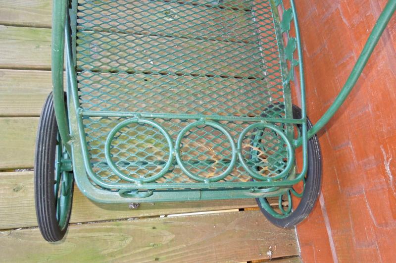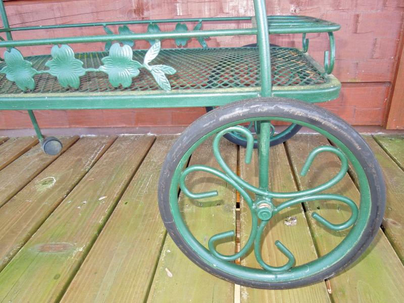 Features scrolled rubber wheels, removable wire mesh handled tray and cutout ivy motif. Holes for 3 bottles. Matches several other patio pieces being sold separately.