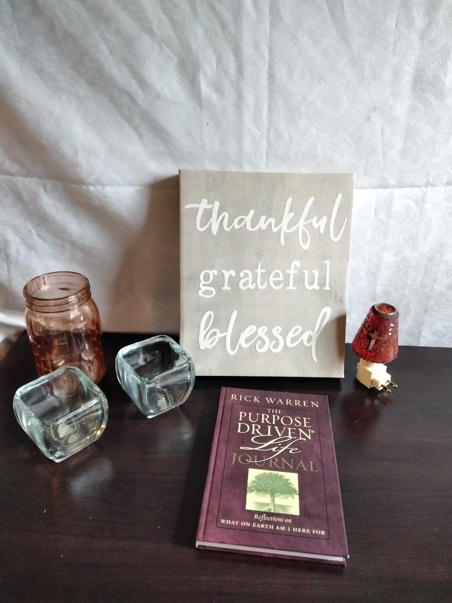 THANKFUL GRATEFUL BLESSED CANVAS WALL ART, TWO CLEAR GLASS CANDLE HOLDERS, ORANGE COLORED GLASS JAR, PURPOSE DRIVEN LIFE BOOK, AND A ELECTRIC SCENT LAMP WITH RED SHADE WITH CROSS.