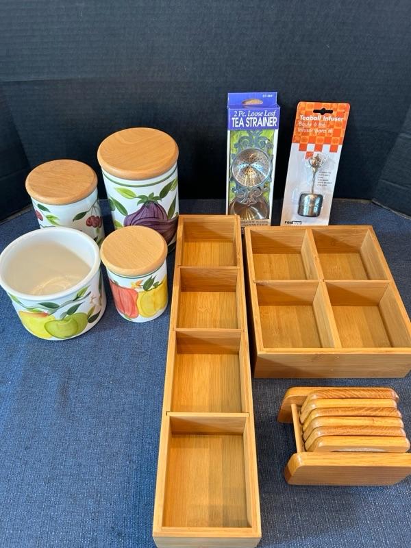 Lot 59 kitchen items Portmeirion canister set , coaster set, tea ball infuser, tea strainer