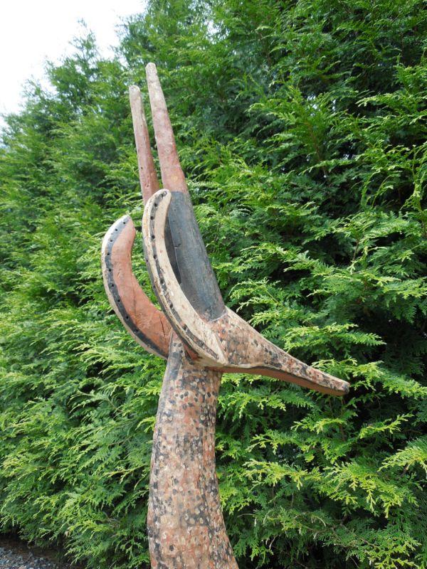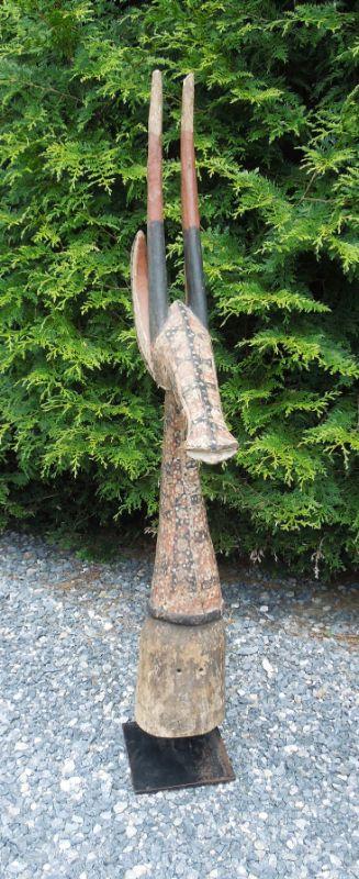 A very large and stunning African wooden headdress from Upper Volta or Mali. Wonderfully carved and painted in vivid colors. Attached to a steel base pedestal for display.. Base of the neck would fit on a head. Medium is wood, pigment and metal.