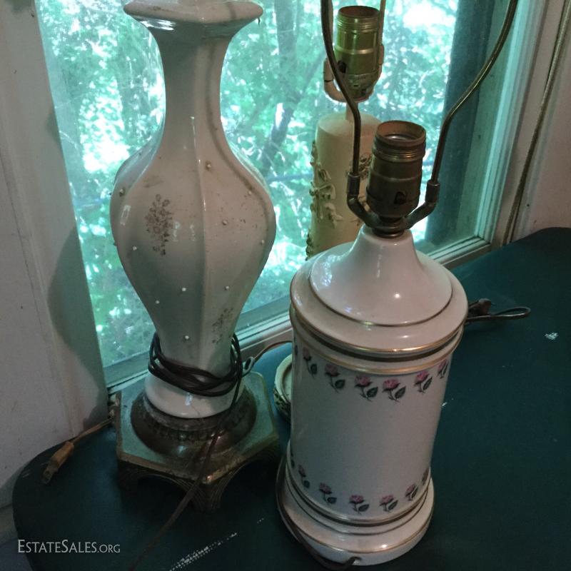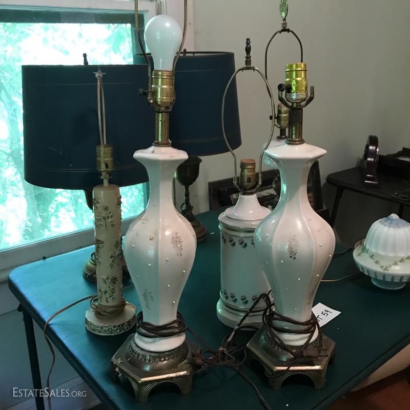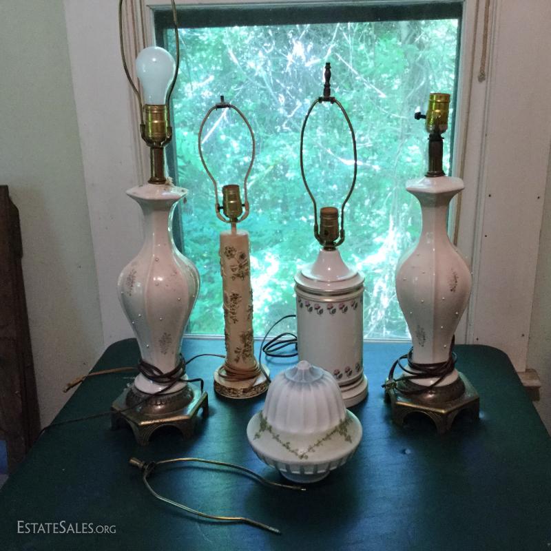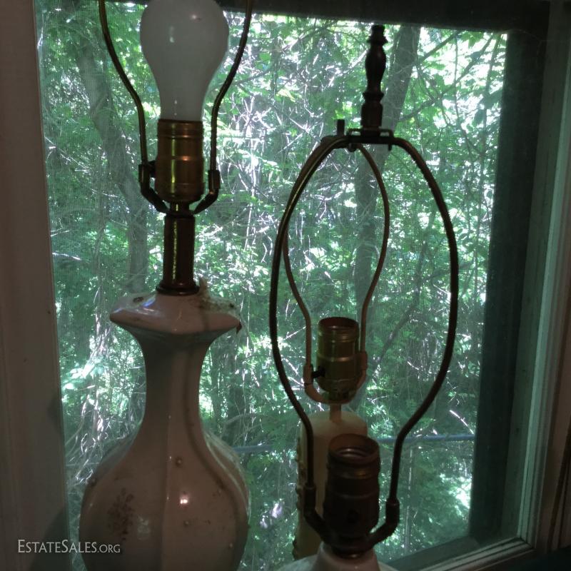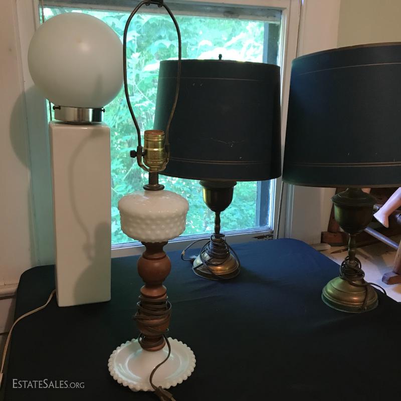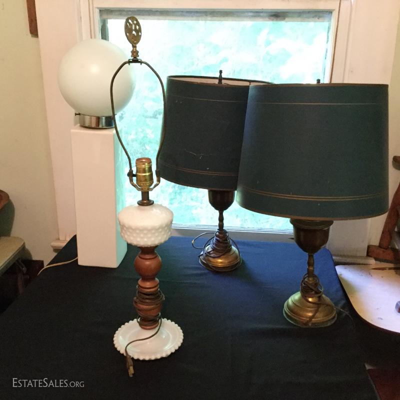 Misc sets of lamps. Some brass. Some ceramic. Includes funky MCM globe lamp with white ceramic base. Also extra shades and parts. One of matching brass lamps and one of matching ceramic lamps needs re-wiring. No shipping. Local pick up only in Saluda, NC
