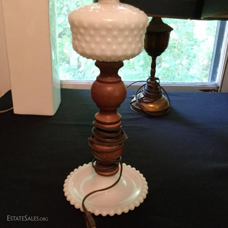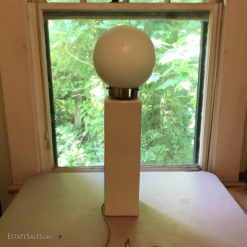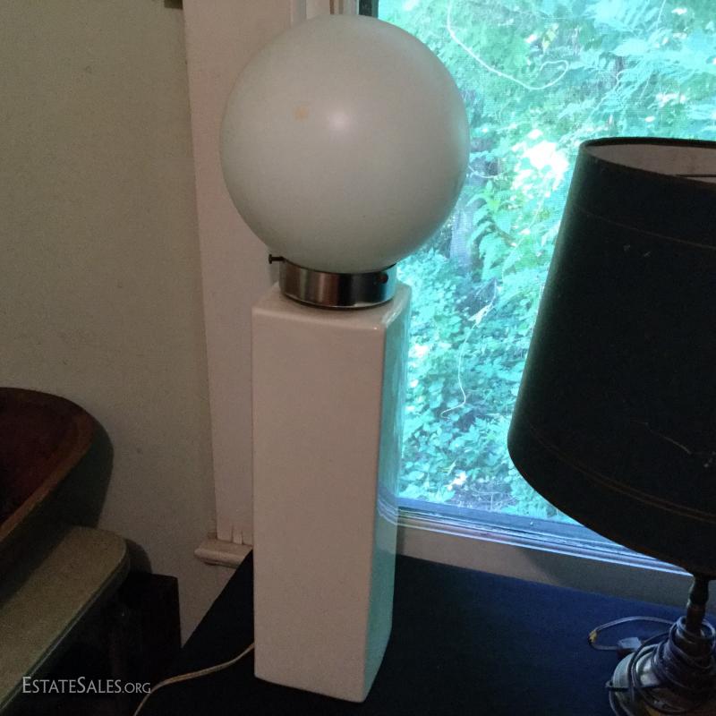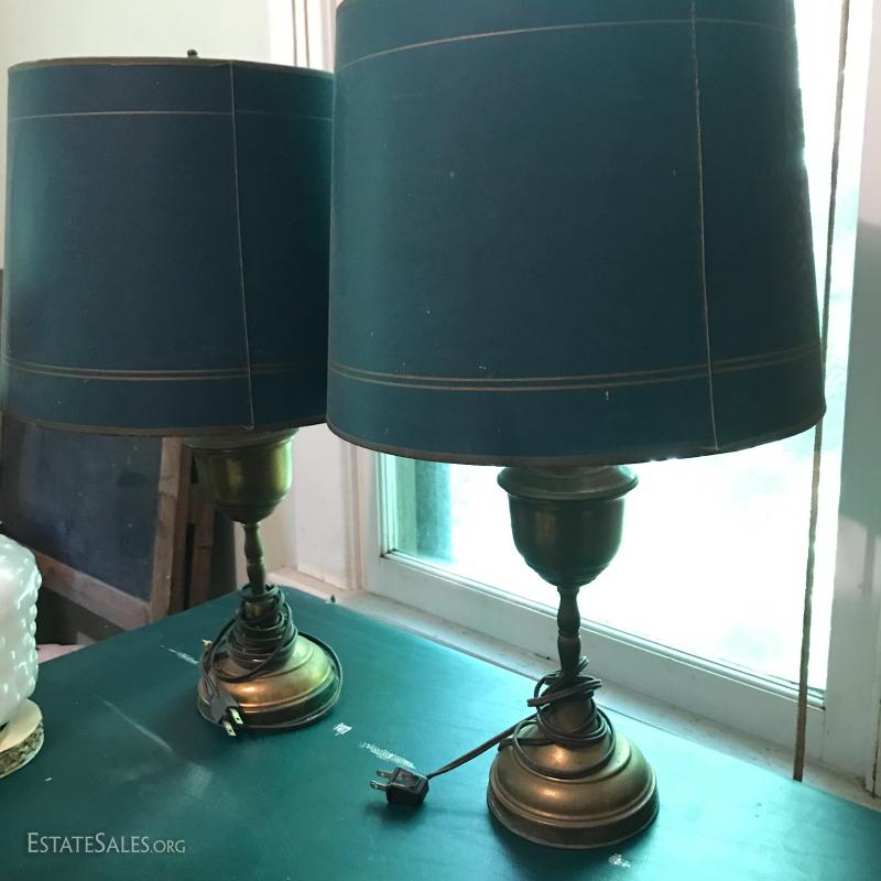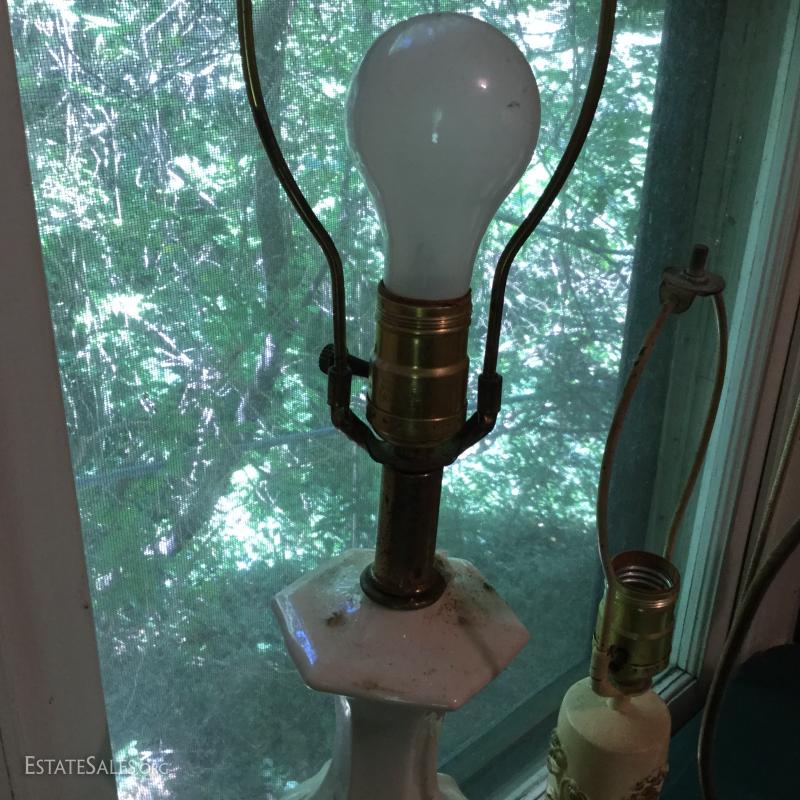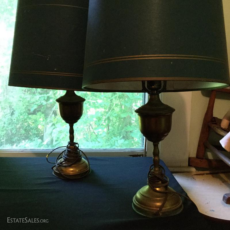 Misc sets of lamps. Some brass. Some ceramic. Includes funky MCM globe lamp with white ceramic base. Also extra shades and parts. One of matching brass lamps and one of matching ceramic lamps needs re-wiring. No shipping. Local pick up only in Saluda, NC