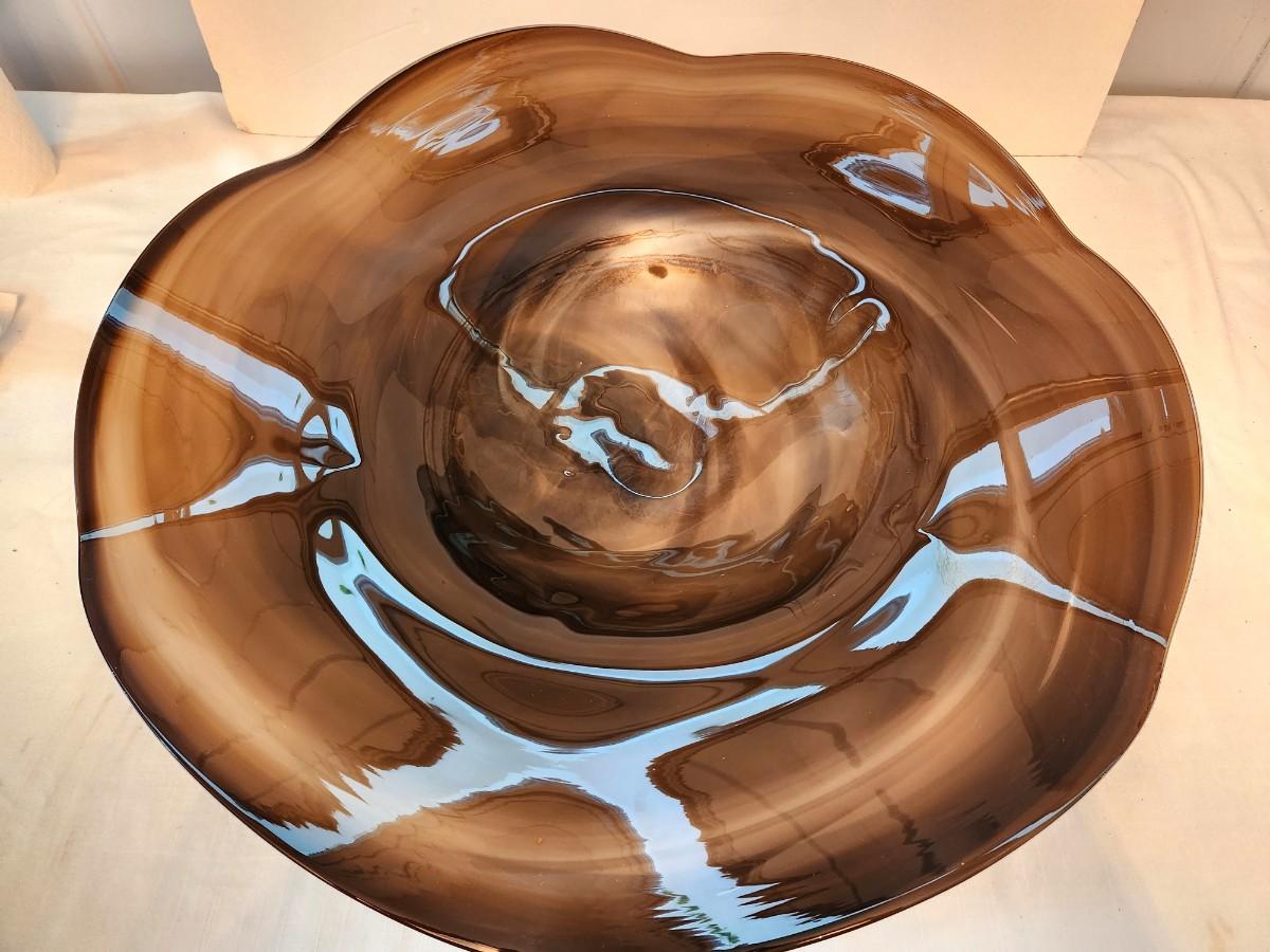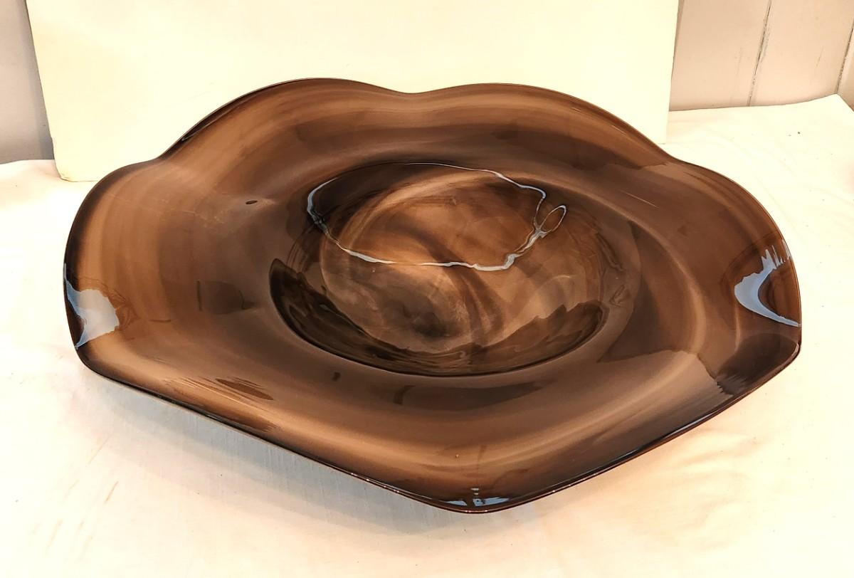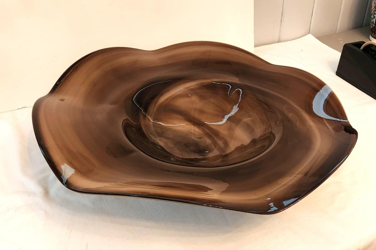 Large hand blown studio glass bowl, no maker or signature. 24" across, 5.5" tall. Good condition. Rich brown/beige colors that reflect the light. Heavy.